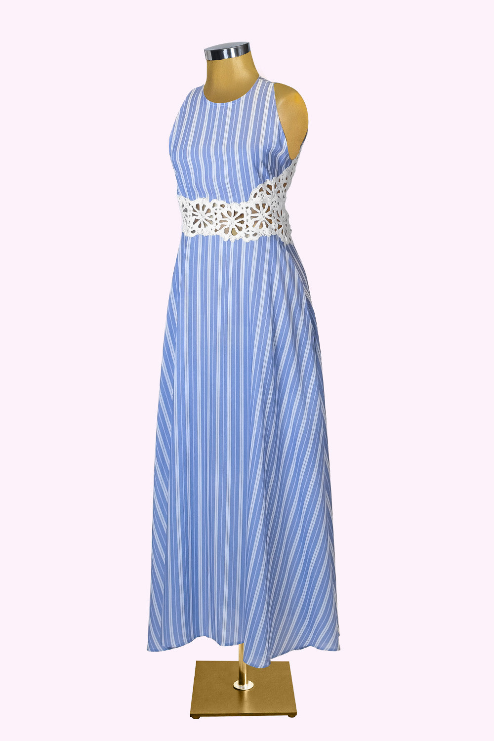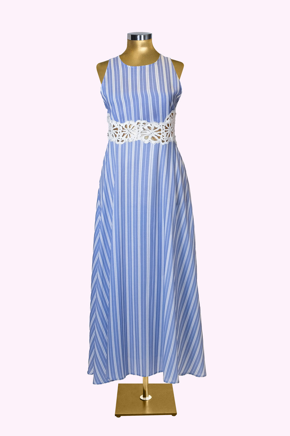 أورا سيليستيس أشبه بحلم صيفي أزرق. طوق الدانتيل، الذي ينفتح بأناقة عند الخصر، يُضفي شكلاً رومانسياً وحُراً. نسيجه المخطط باللونين الأزرق الفاتح والأبيض هادئ وخفيف، كخلفية سماء.