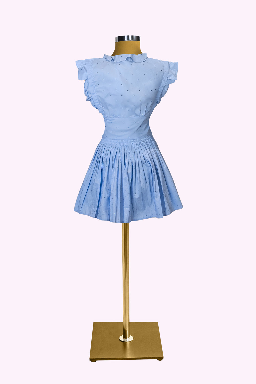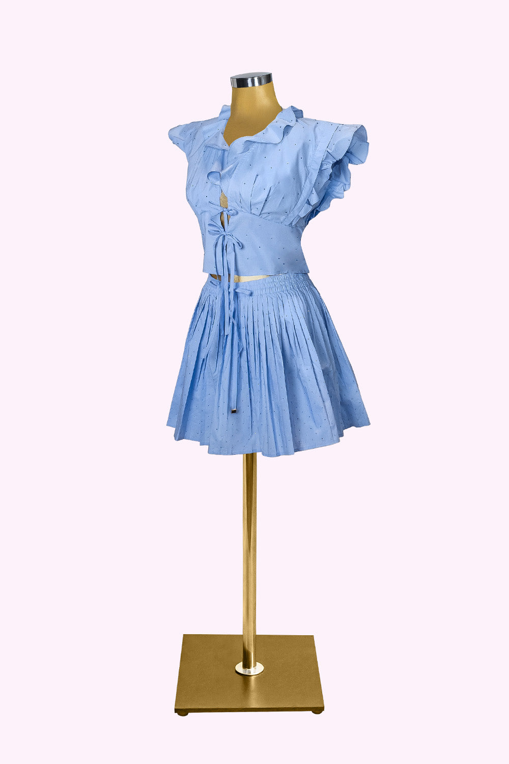 يمنحك لونه الأزرق الفاتح شعورًا بالانتعاش في أيام الصيف، بينما تضيف تفاصيل الثنيات الدقيقة وملمس القماش المثقب الدانتيل لمسة أنيقة.
