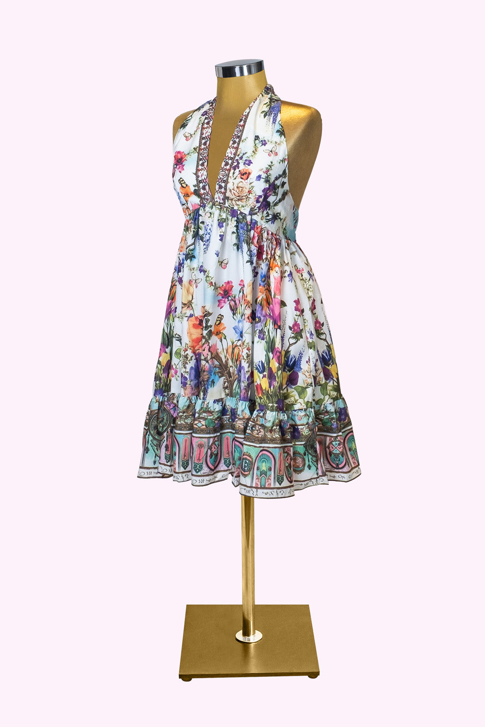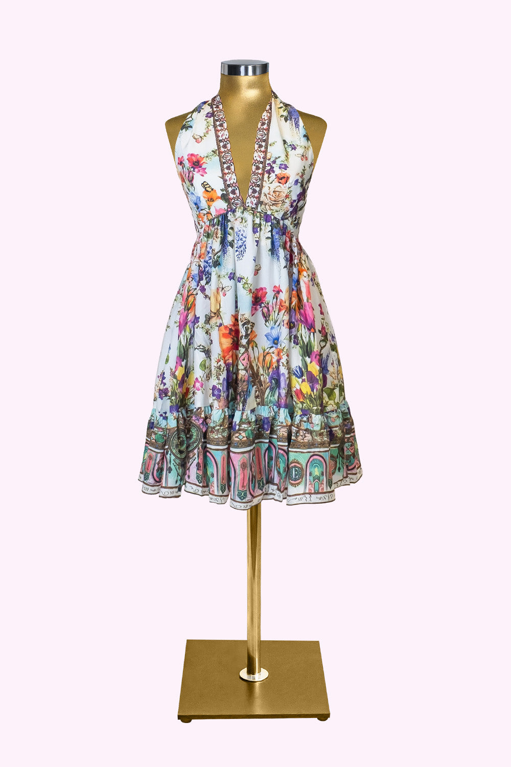 أنماط الأزهار، كأنها تُلامس الذهب، تلتقي بحدود فلورنسا الخلابة لتُضفي جمالاً صيفياً فريداً. صُممت لتتألق من الصباح إلى المساء، من حفلات الشاطئ إلى وجبات الغداء في المدينة.