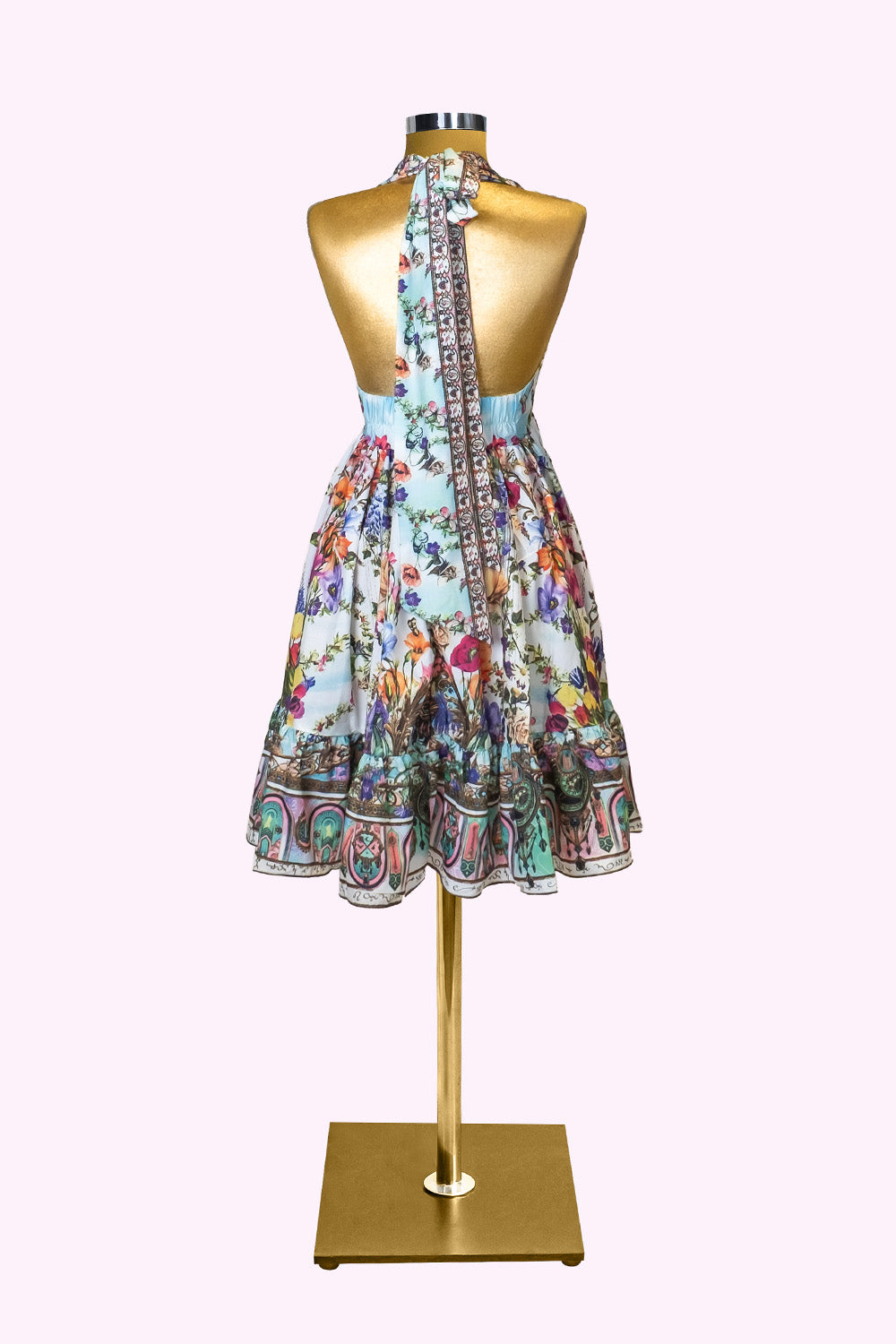تجمع فلورا أوريا بين بهجة فلورا، إلهة الزهور في الأساطير الرومانية، ونور الشمس الذهبي. ياقة V الجريئة وخصره النحيف يُبرزان أناقة الأنوثة، بينما تُضفي تنورته المنسدلة لمسة صيفية ساحرة.