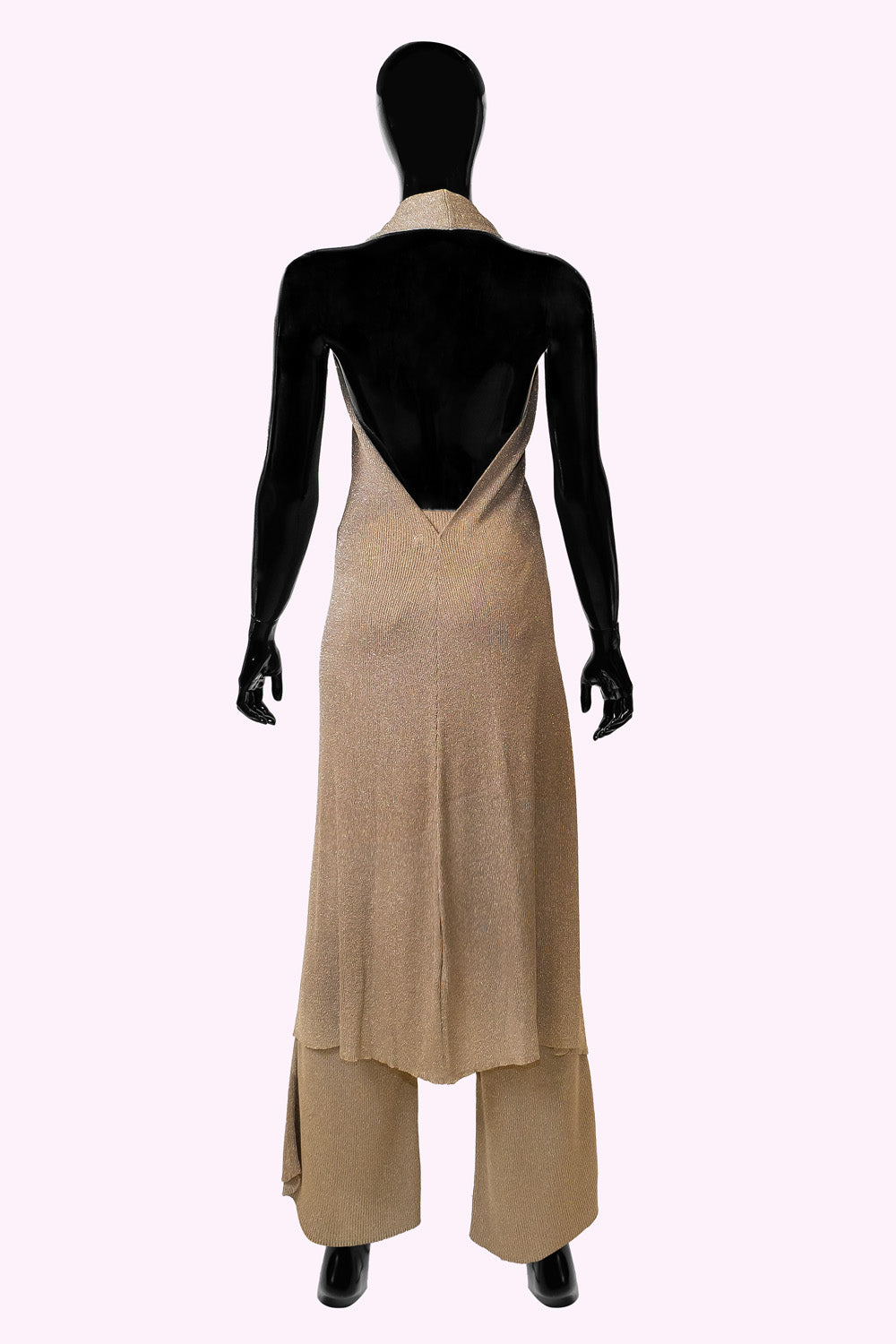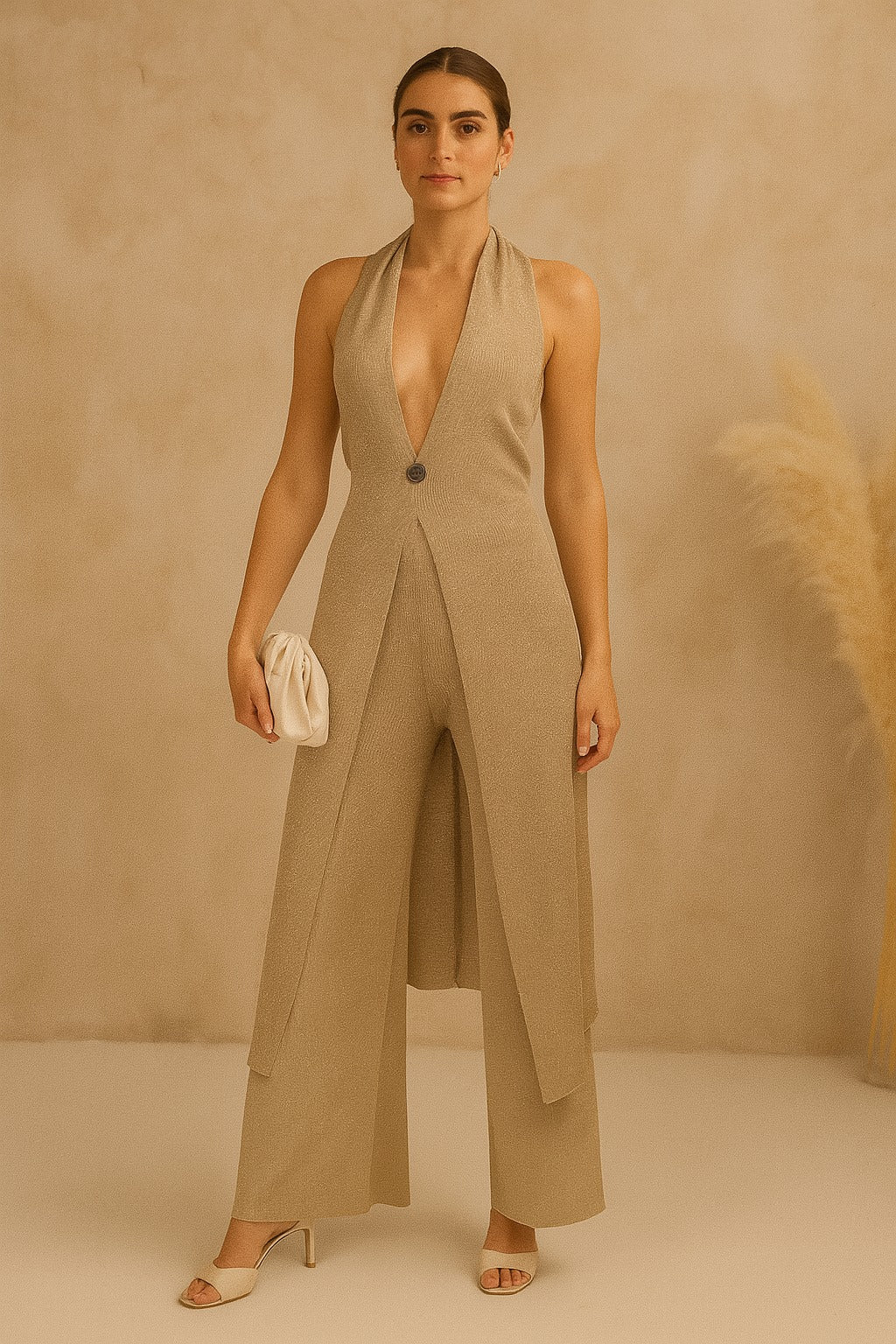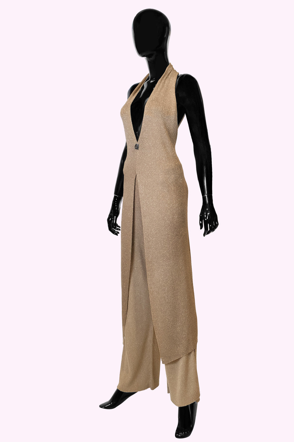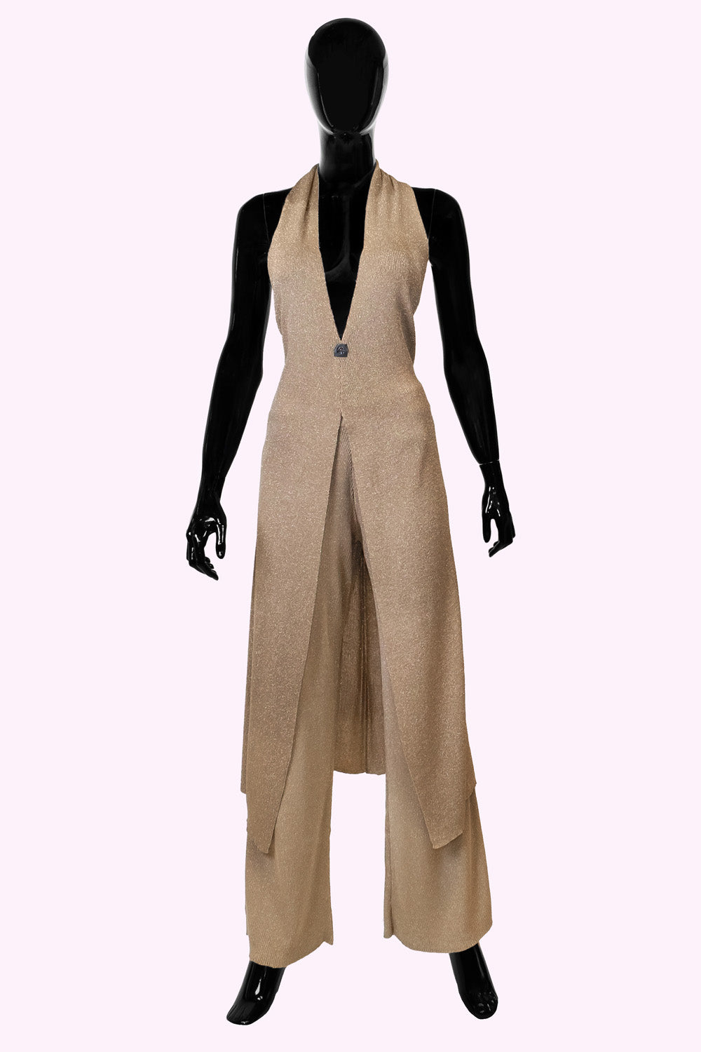 هل أنتِ مستعدة لدخول ليلة ساحرة كإلهة متألقة؟ يأسركِ فستان سيلين مع كل خطوة بنسيجه الذهبي اللامع، بينما تُبرز قصته الفريدة سحر الإلهات العصريات. يعانق خط العنق العميق على شكل حرف V خصرك برشاقة، وتتدلى الطبقات الطويلة على طوله الأمامي، مما يُضفي أناقة ناعمة وانسيابية. يوفر البنطال الواسع أسفله الراحة والرقي في آن واحد.