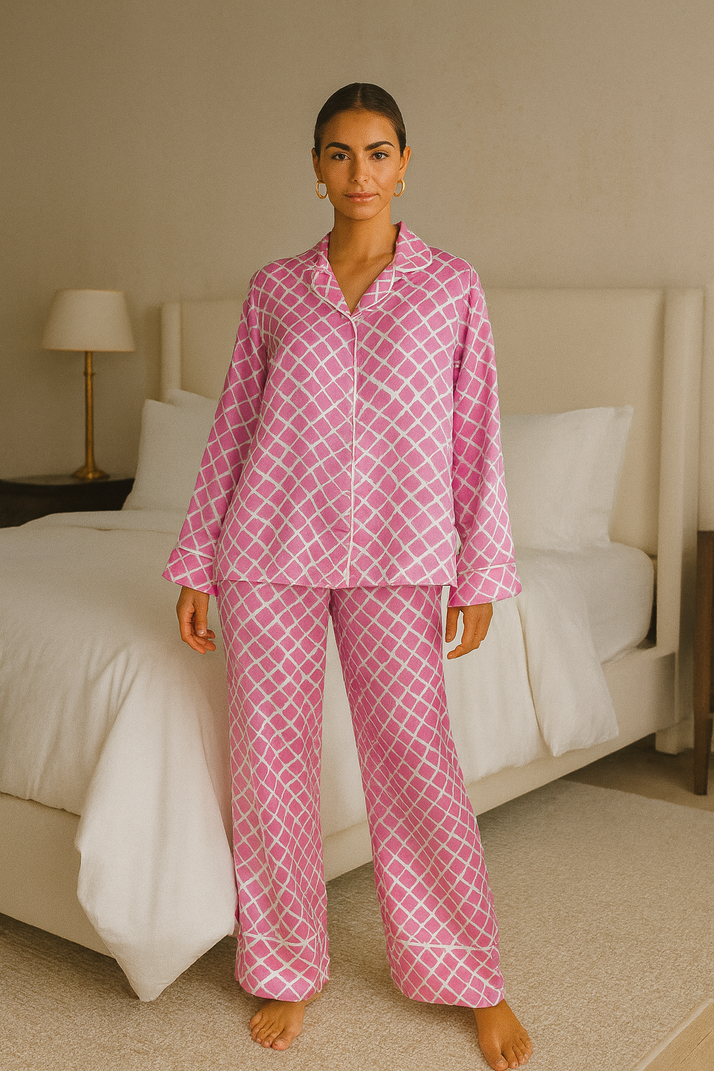 تُعيد "روزارا لاتيس" تعريف مفهوم ملابس الاسترخاء الفاخرة. تجمع هذه البدلة بين حيوية اللون الوردي وبساطة النمط الشبكي الهندسية، وهي مصممة لمن يبحثون عن الراحة والأناقة. سواءً لوجبة فطور متأخرة في نهاية الأسبوع في المدينة أو لأمسية هادئة في المنزل، فإن ملمس الساتان الحريري على بشرتكِ سيمنحكِ شعورًا بالأناقة والتميز في جميع الأوقات.