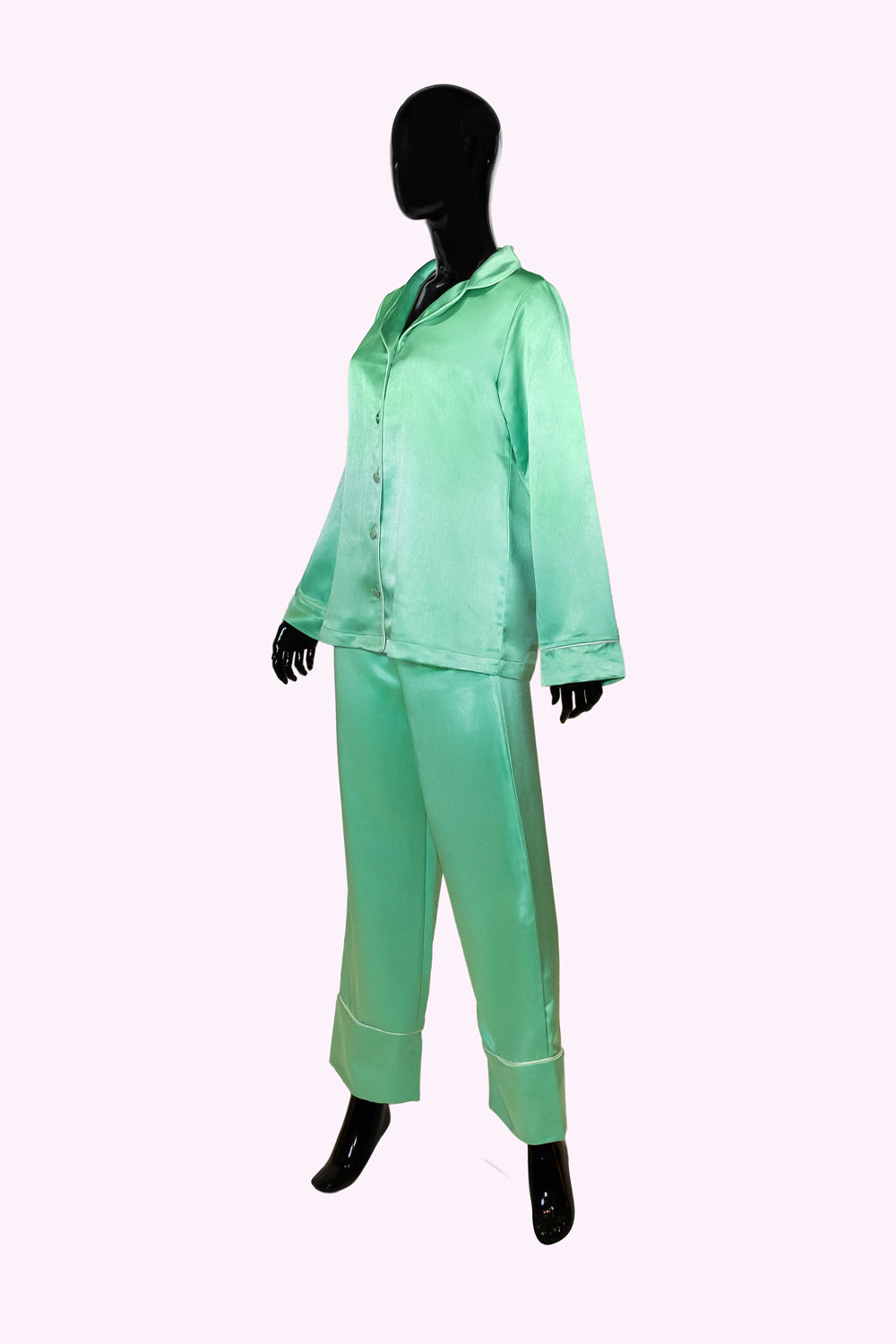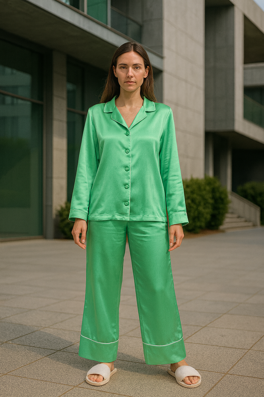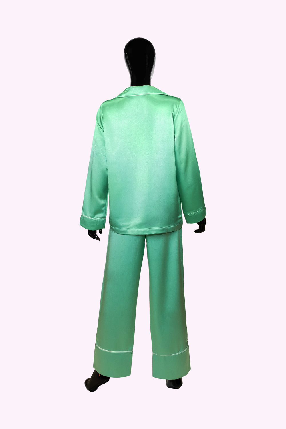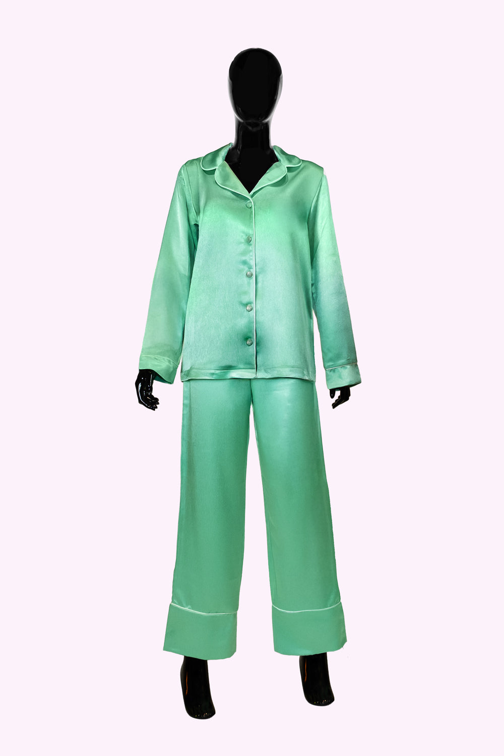 "فيردي سيريناتا" طقم ملابس نوم فاخر يعكس الجانب الهادئ من البساطة. تُضفي درجات الباستيل الخضراء هدوءًا، بينما يُضفي لمعان الساتان الحريري لمسةً راقية. صُممت السراويل الواسعة والجزء العلوي المريح لمن يبحثون عن الراحة والأناقة.