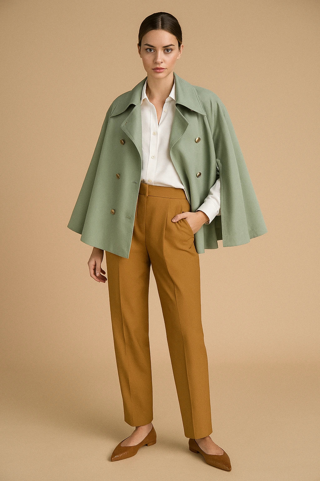 💎 Ürün Tanıtım Yazısı GAIA, klasik trençkot görünümünü zarif bir pelerin formuyla yeniden tanımlıyor. Çift...
