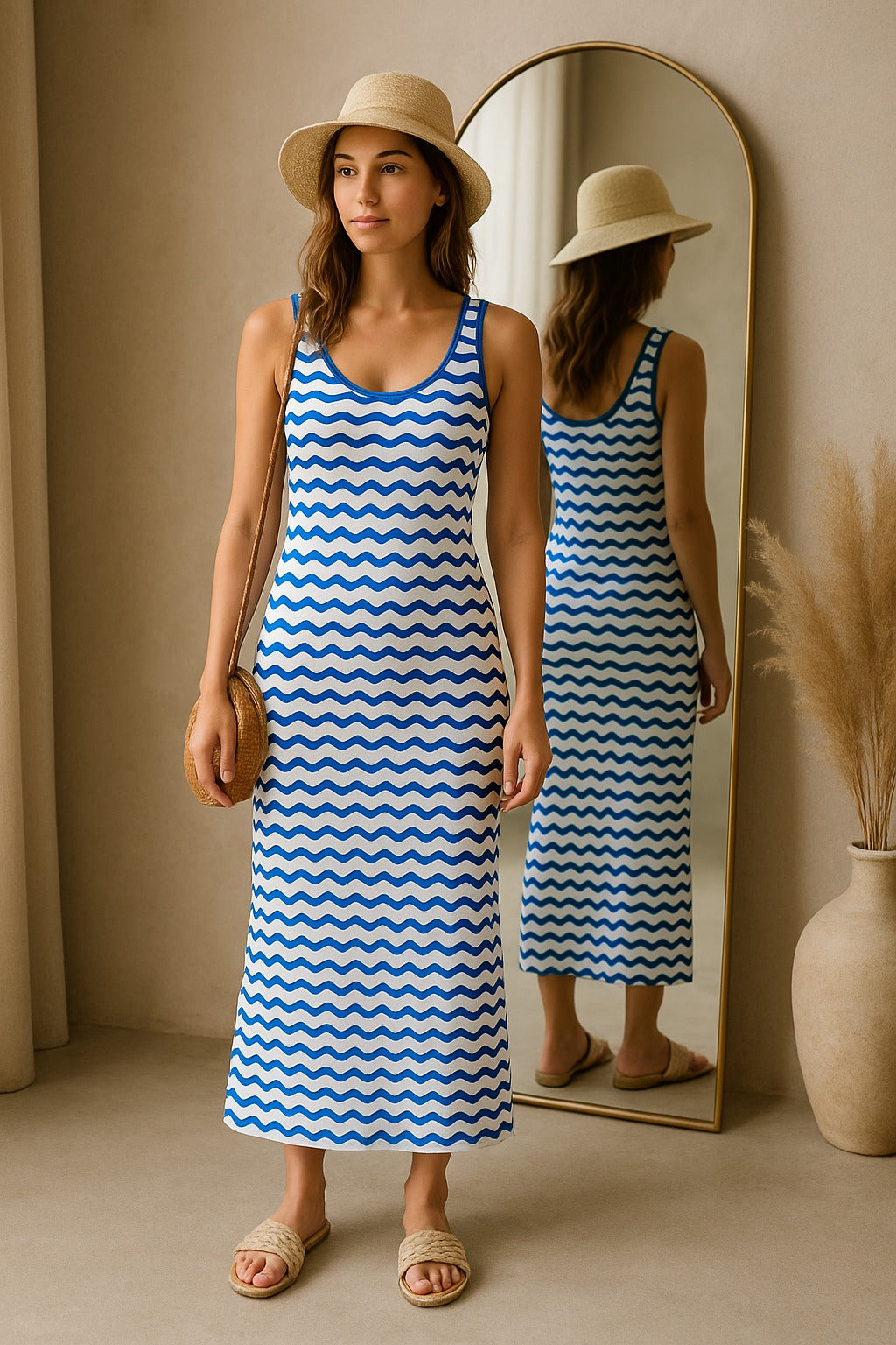This beach dress, which dances with the sea with its blue and white zigzag patterns, is a comfortable and feminine summer piece that creates maximum impact with minimal lines.