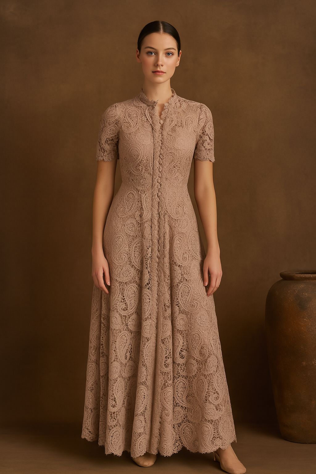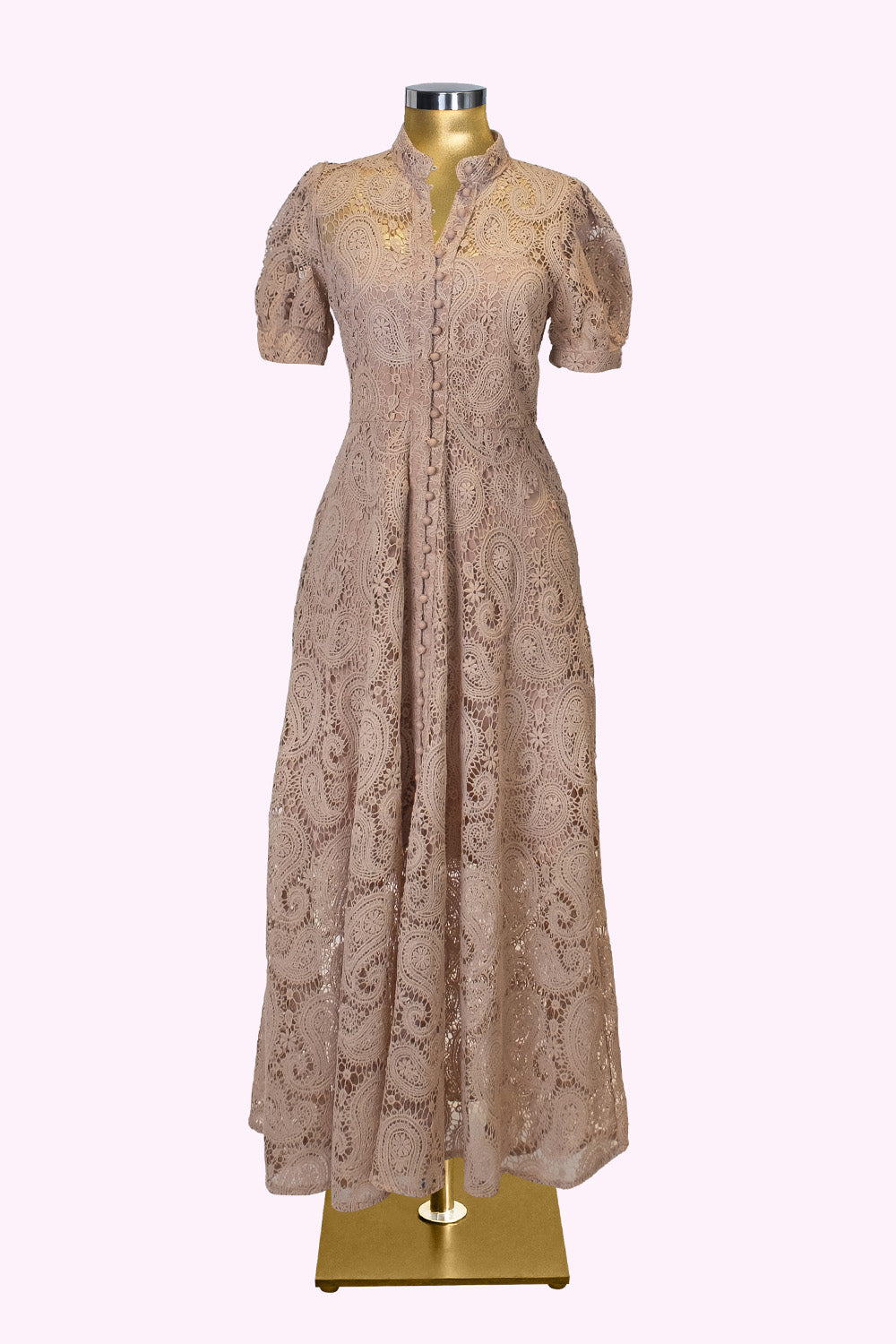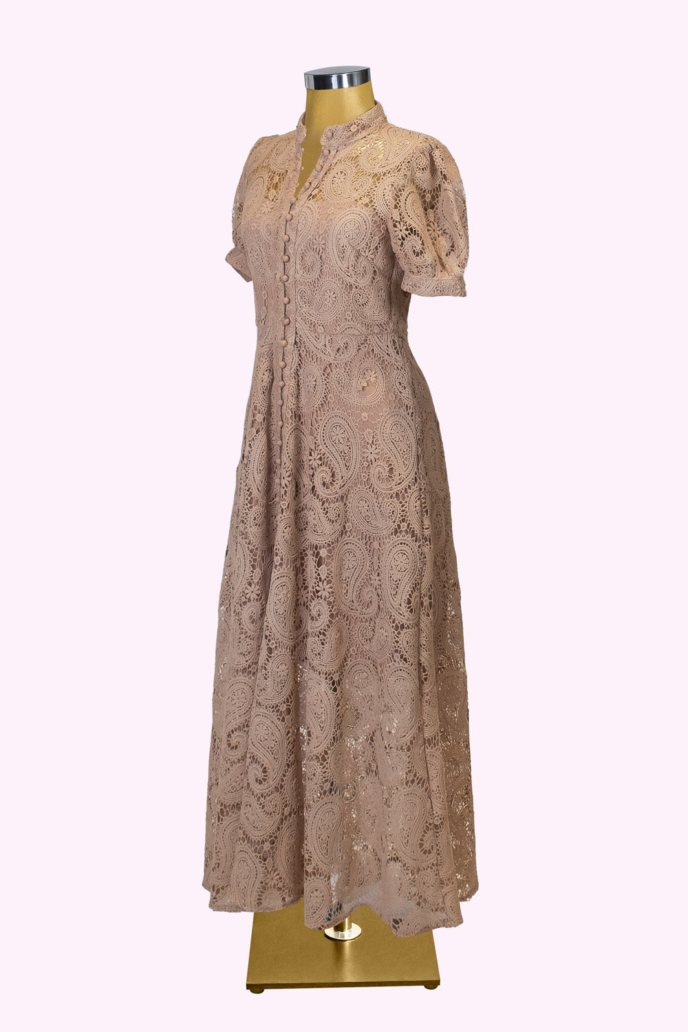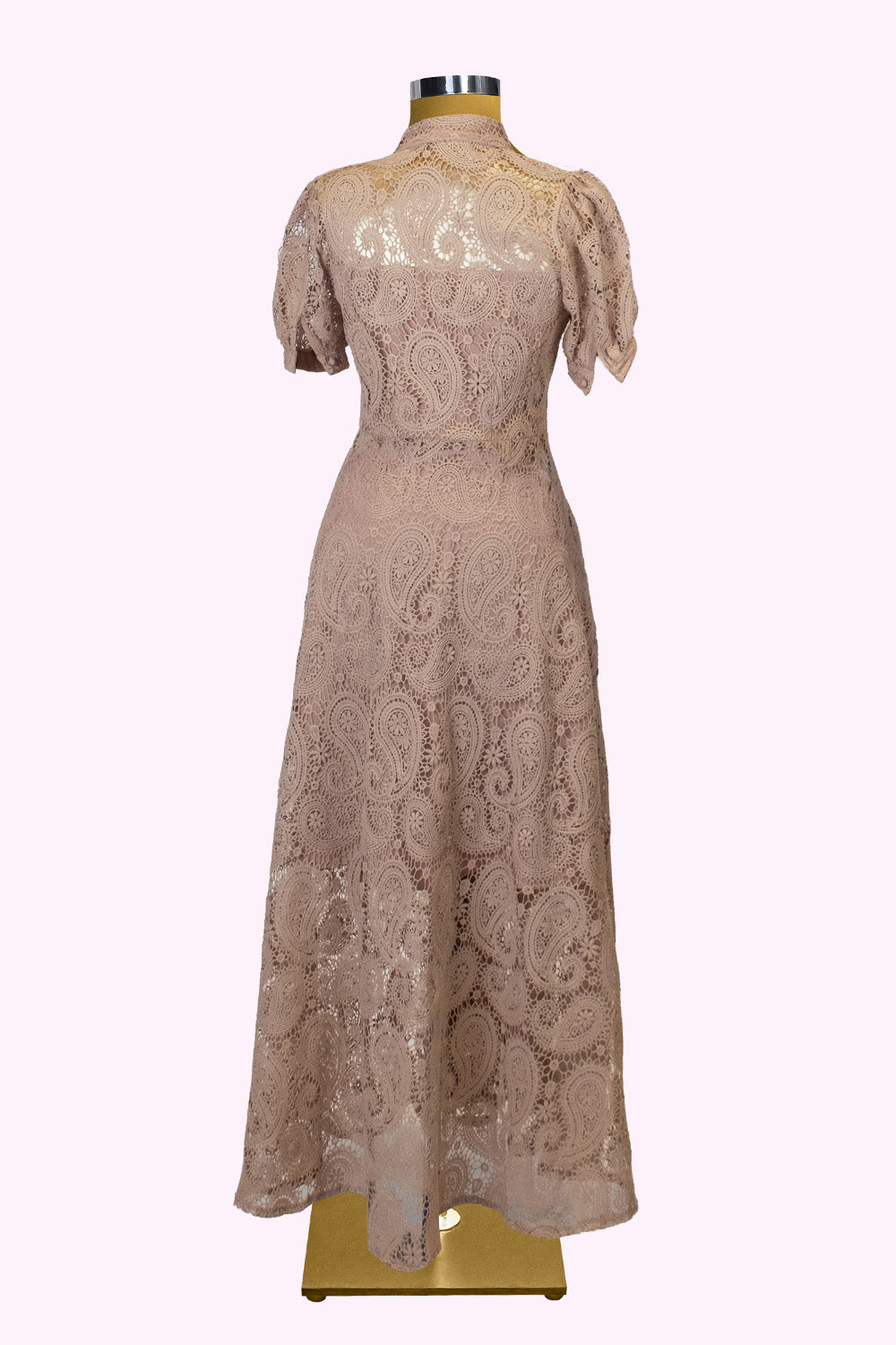 Paisley desenli özel dantel kumaşı, vücuda hafifçe oturan formu ve genişleyen eteğiyle asil bir siluet yaratır.