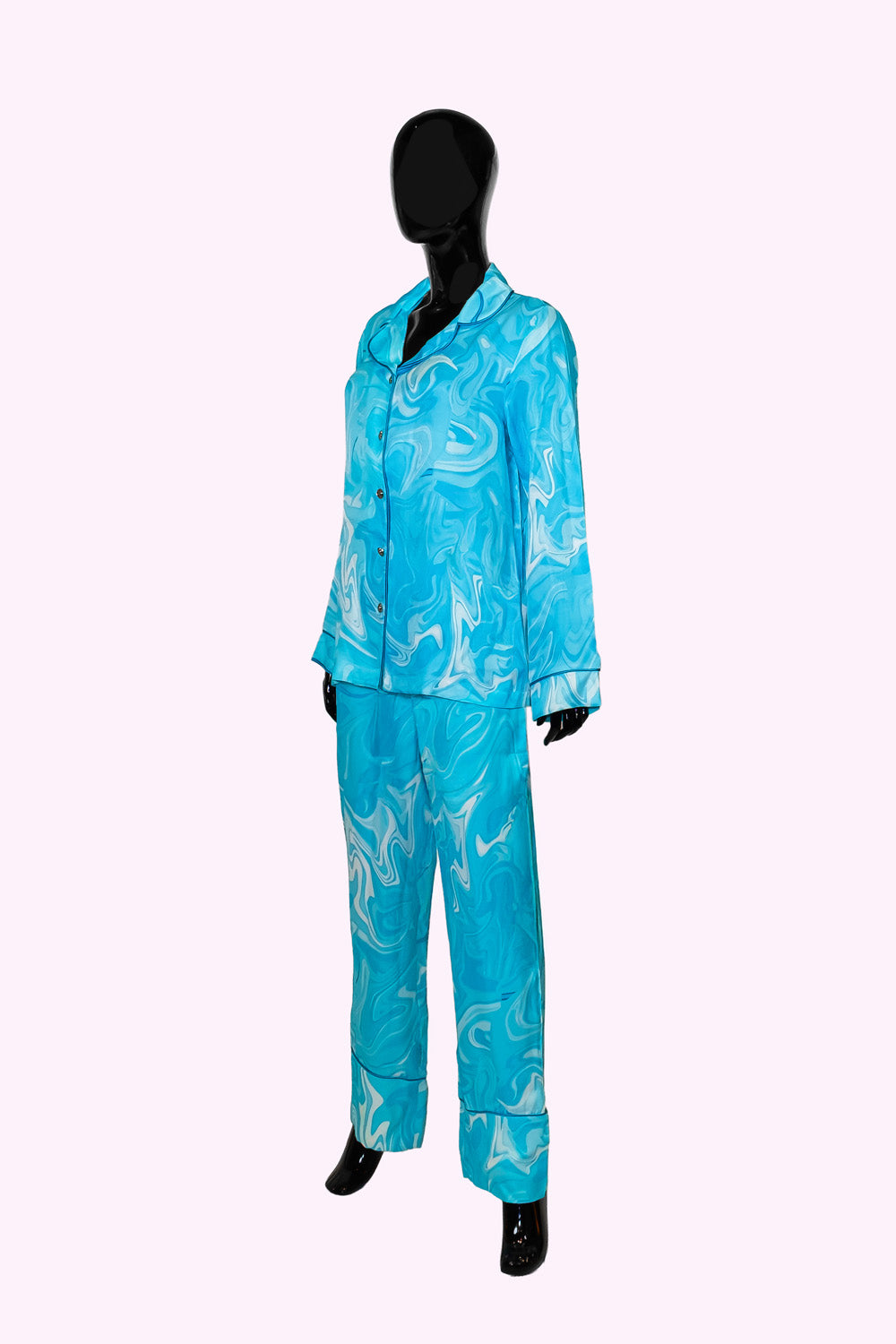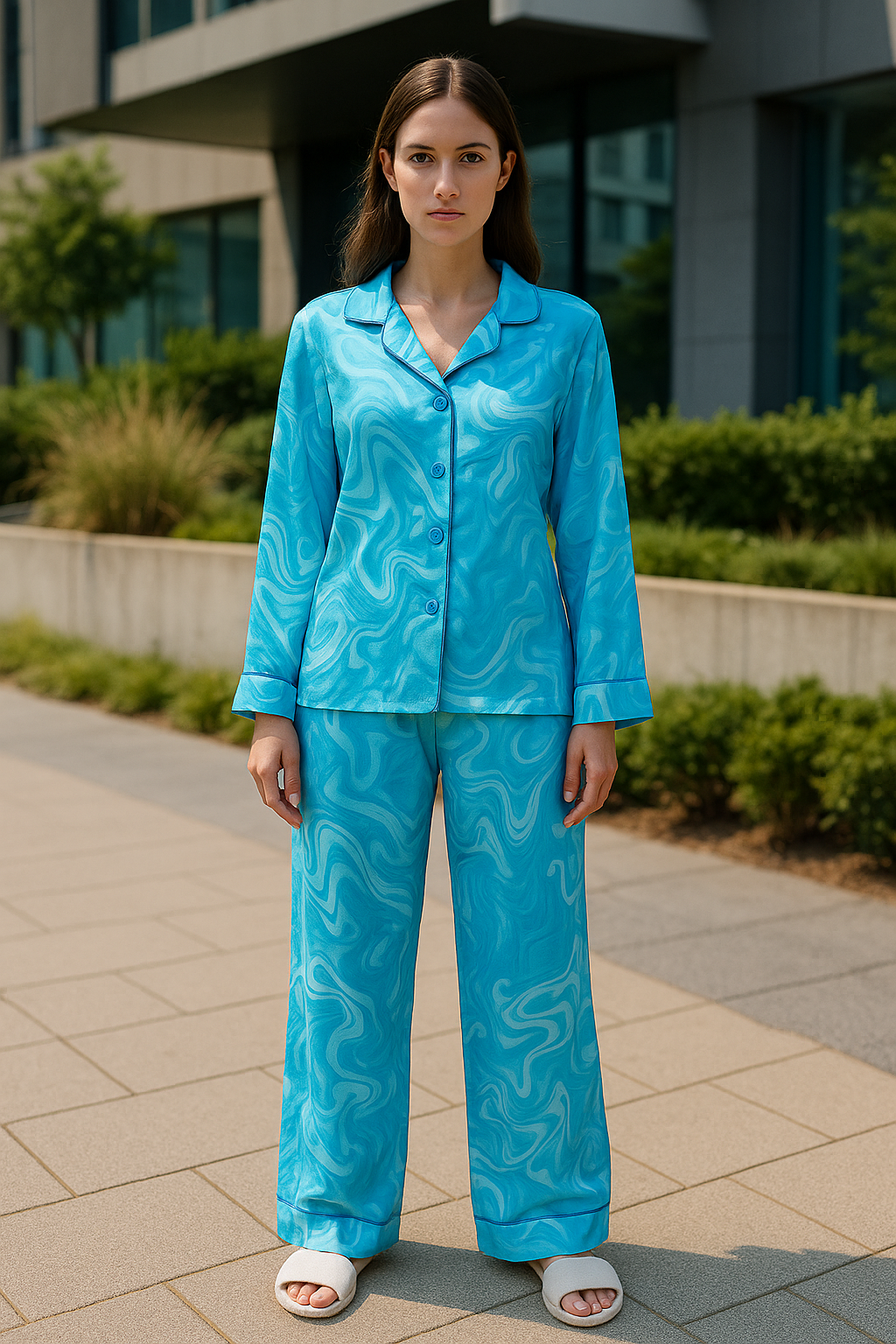 Su dalgaları gibi kıvrılan mavi beyaz desenleriyle her adımda hareket eder, her bakışta fark yaratır. Oversize kesimiyle rahatlık sağlarken, takım hâliyle stil sahibi bir duruş kazandırır.