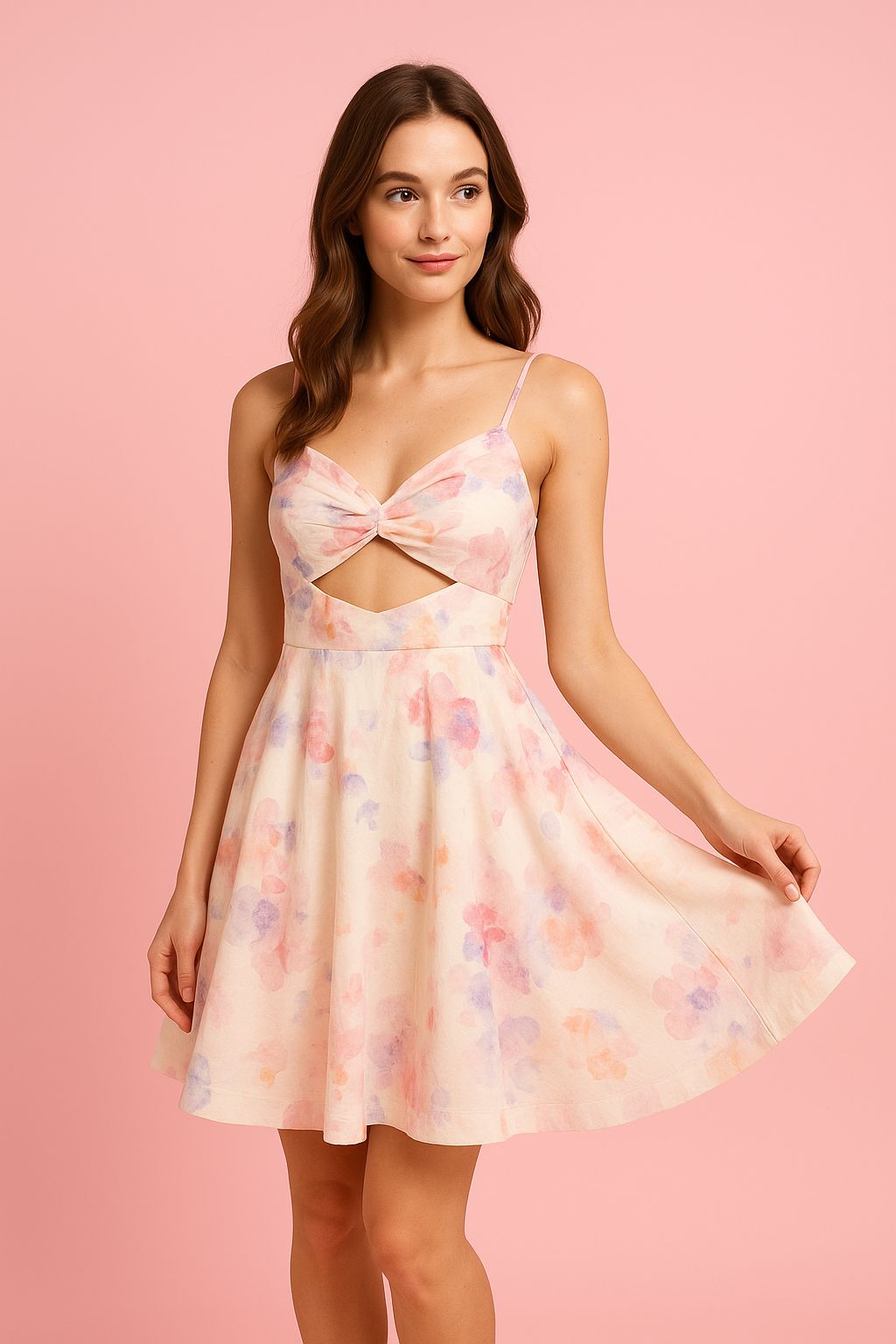 Göğüs kısmındaki zarif cut-out detayı ve ince askıları, feminen bir duruş kazandırırken, uçuşan A-kesim eteğiyle her adımınızda romantik bir hava yaratır. Pastel tonların modern yorumu sayesinde hem gündüz brunch’larında hem de yaz akşamı davetlerinde ışıldayabilirsiniz.