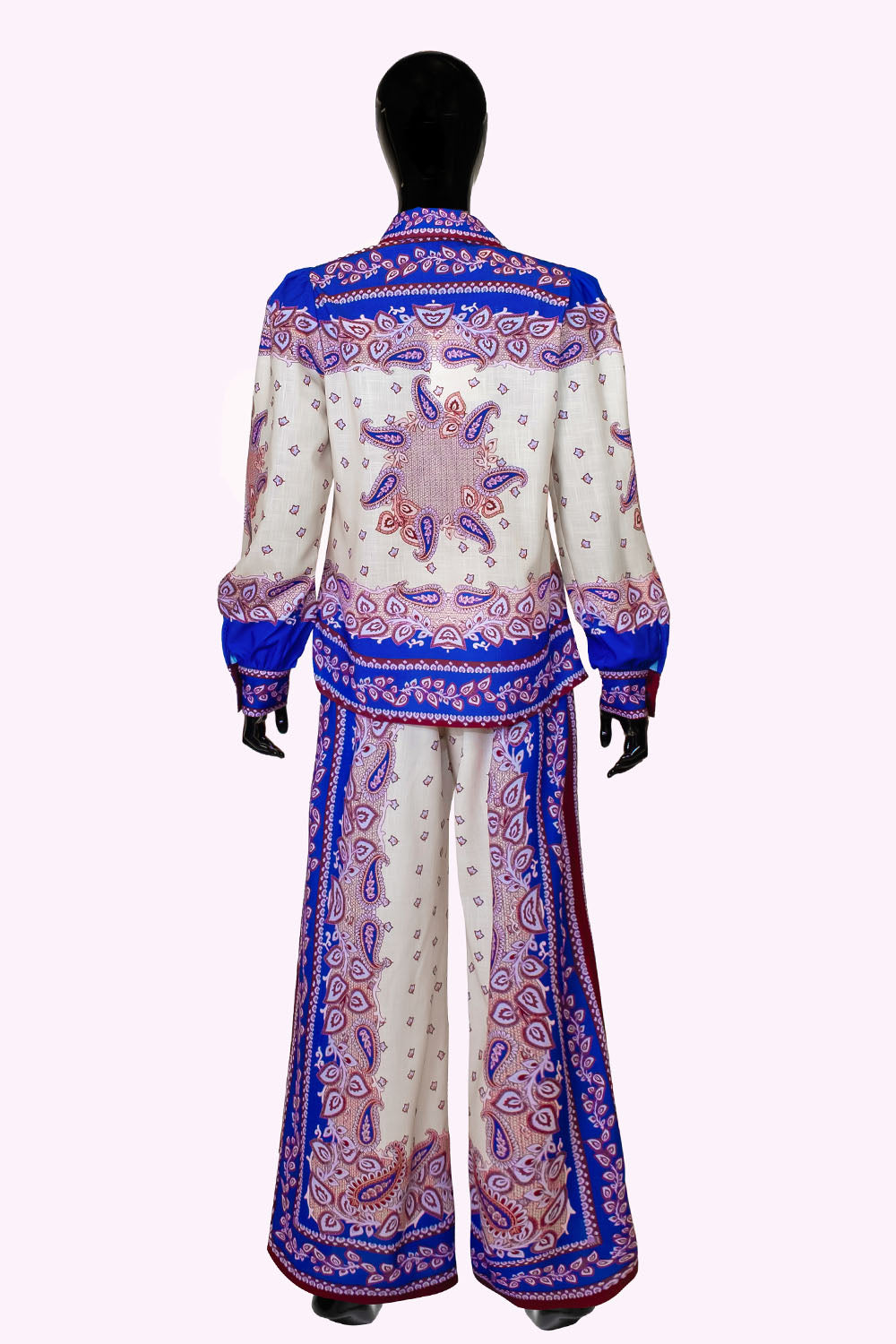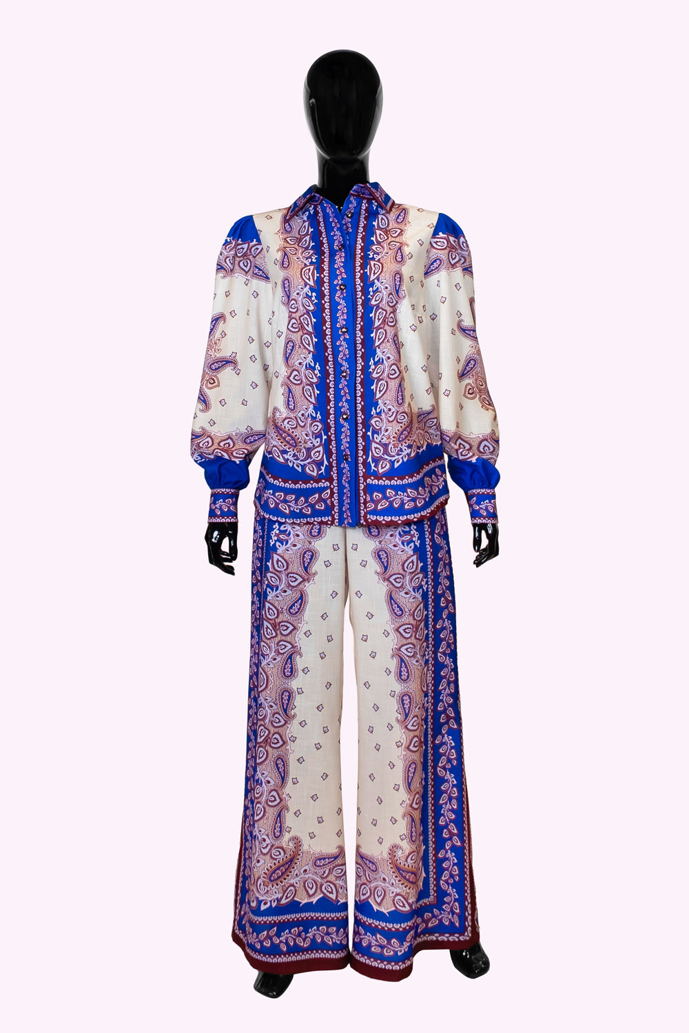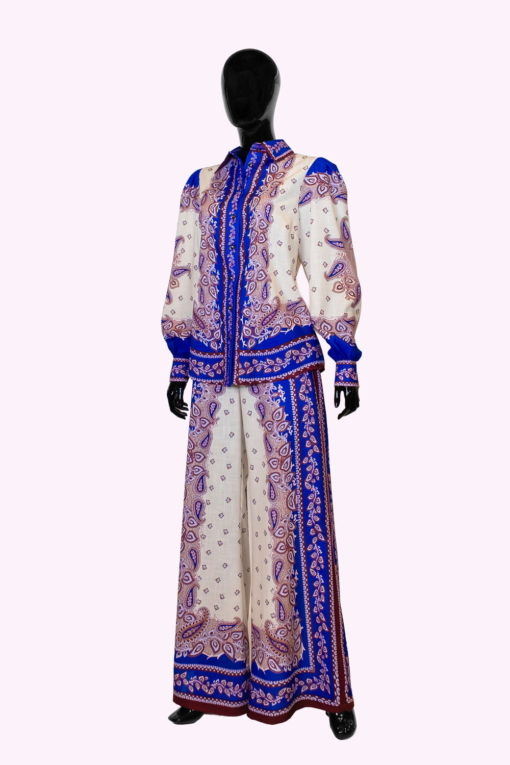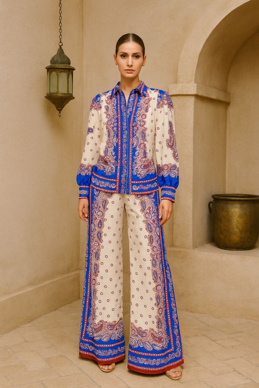 Gelenekle geleceği bir araya getiren Aramea, güçlü desen dili ve özgür kalıbıyla fark yaratır. Yoğun mavi ve bordo paisley motifleri, kültürel zenginliği çağrıştırırken, bu iki parçalı takımın dökümlü kesimi çağdaş bir rahatlık sunar. Hacimli kollar, bilekte toparlanarak romantik bir son dokunuş yaratır; bel hizasındaki kuşak ise siluete kontrollü bir ifade kazandırır.