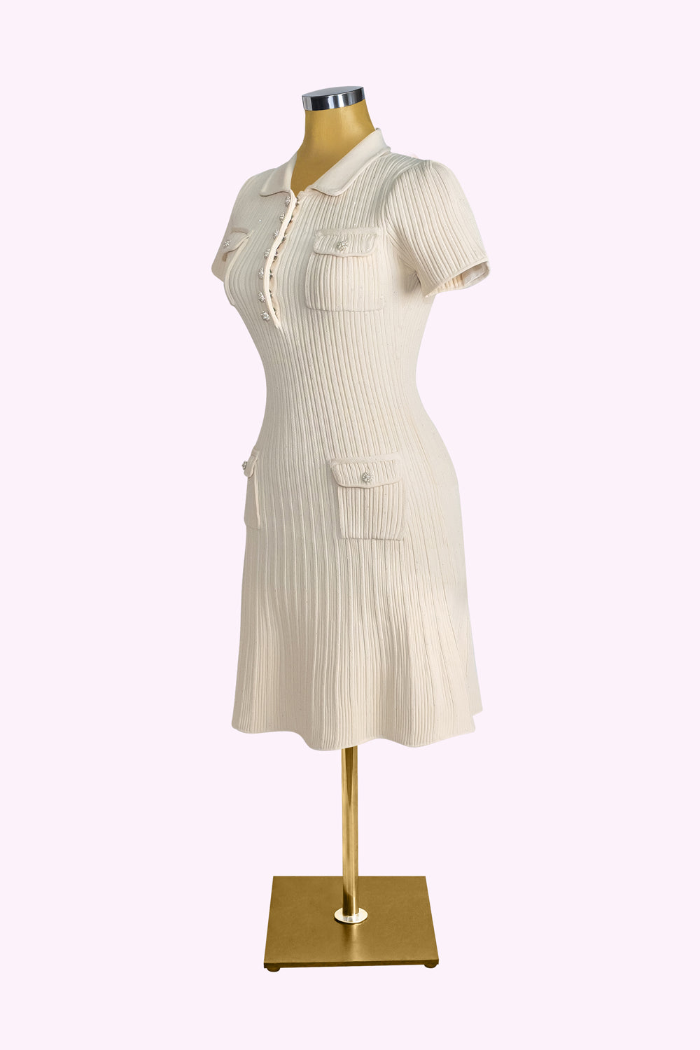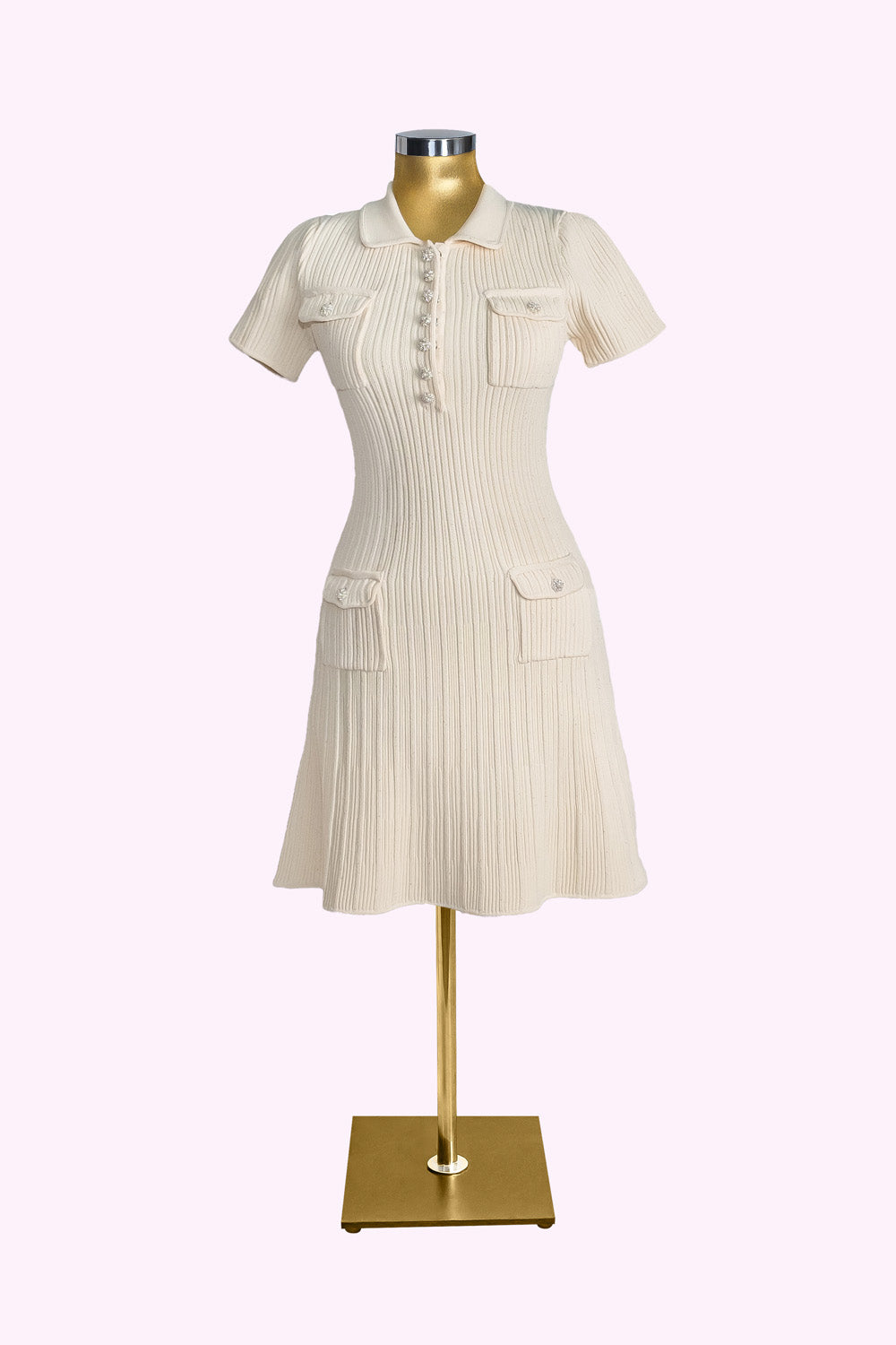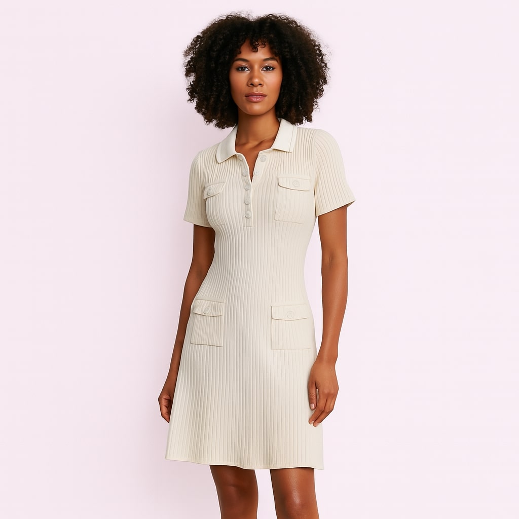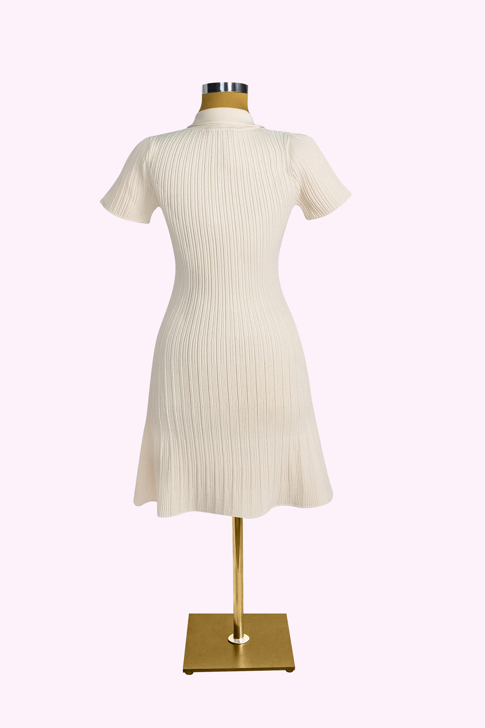 ARVA, modern kadının şehirdeki zarif yürüyüşünü anlatır. Krem tonunun asaletiyle biçimlenen bu kısa kollu triko elbise, retro ilhamlı cep detayları ve düğmeli yakasıyla nostaljiye zarif bir gönderme yapar. Ne ofis şıklığından ödün verir, ne de hafta sonu kahve buluşmasından. Formu vurgulayan ama sadeliğini koruyan tasarımıyla hem ilkbahar hem sonbahar ruhuna dokunur.