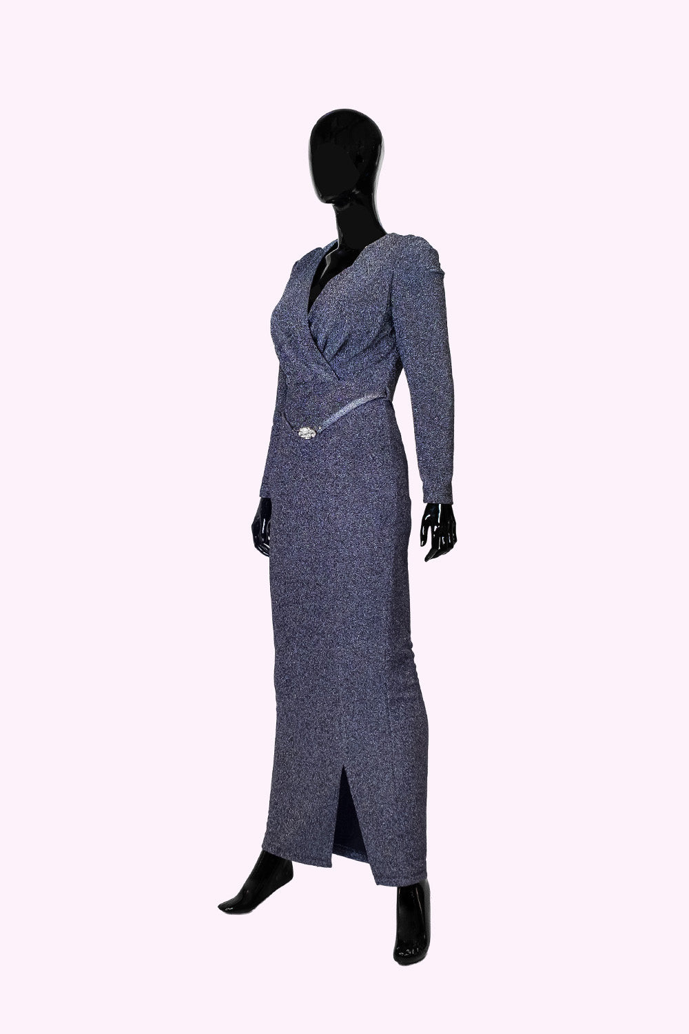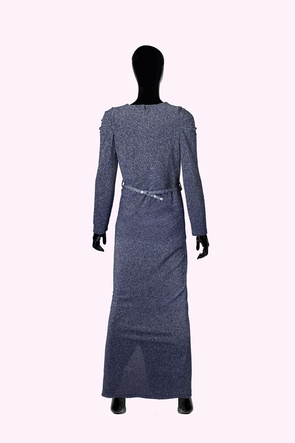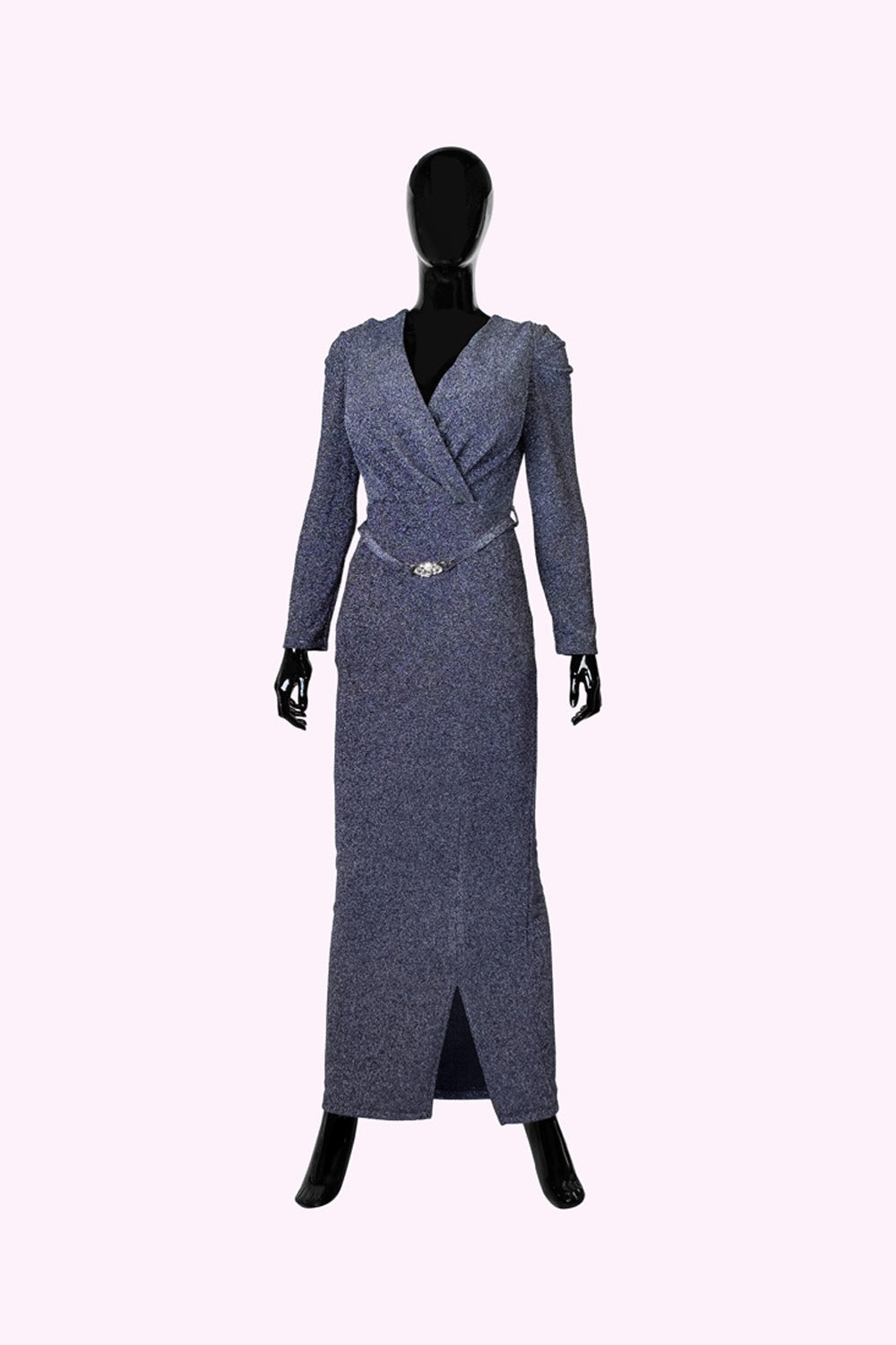 Gecenin zarafeti yıldızlarla süslendiğinde, ortaya Astraea çıkar. Simli gece mavisi dokusuyla parlayan bu elbise, göksel bir ışıltıyla adım atmanızı sağlar. Derin V yakası feminen bir denge kurarken, taşlı kemer detayı bel hattını zarifçe vurgular. Uzun kolları klasikliği temsil ederken, eteğindeki küçük yırtmaç hareketin zarafetini tamamlar.