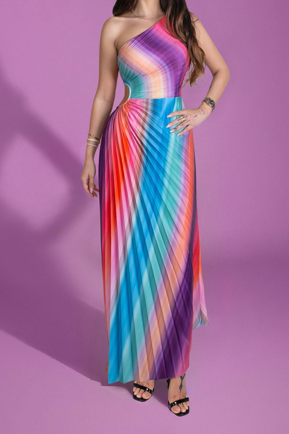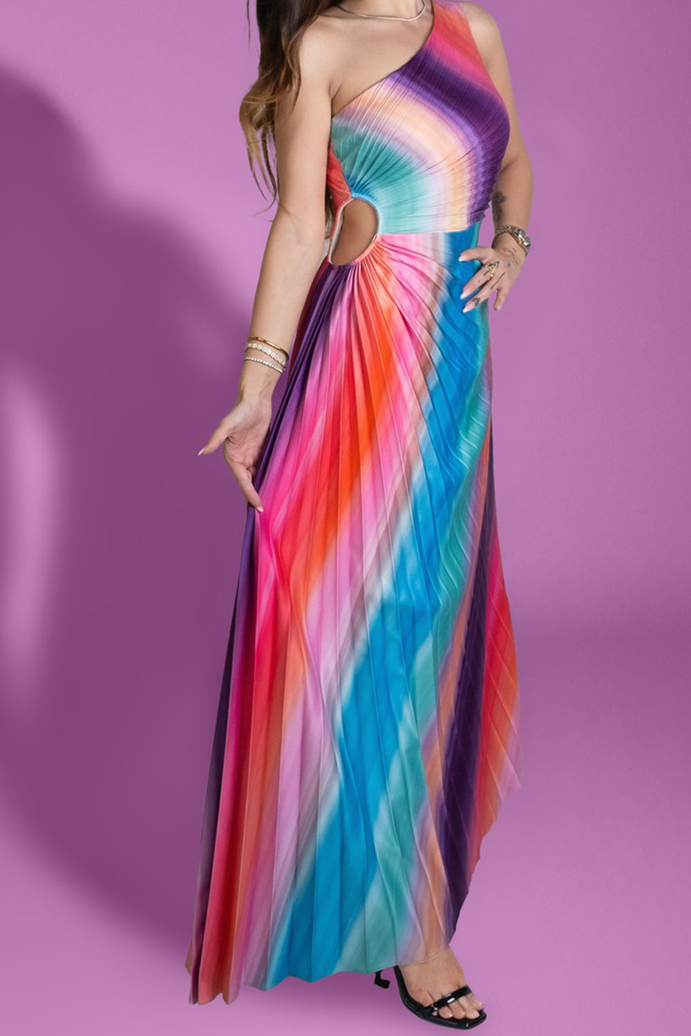 Işıltılı renk geçişleriyle adeta bir aurora fırtınası gibi etkileyici, tek omuzlu kesimiyle modern ve sofistike. Bel kısmındaki pencere detayı ve akışkan pileli formu, bedenin doğal kıvrımlarını vurgularken göz alıcı bir dinamizm yaratıyor.