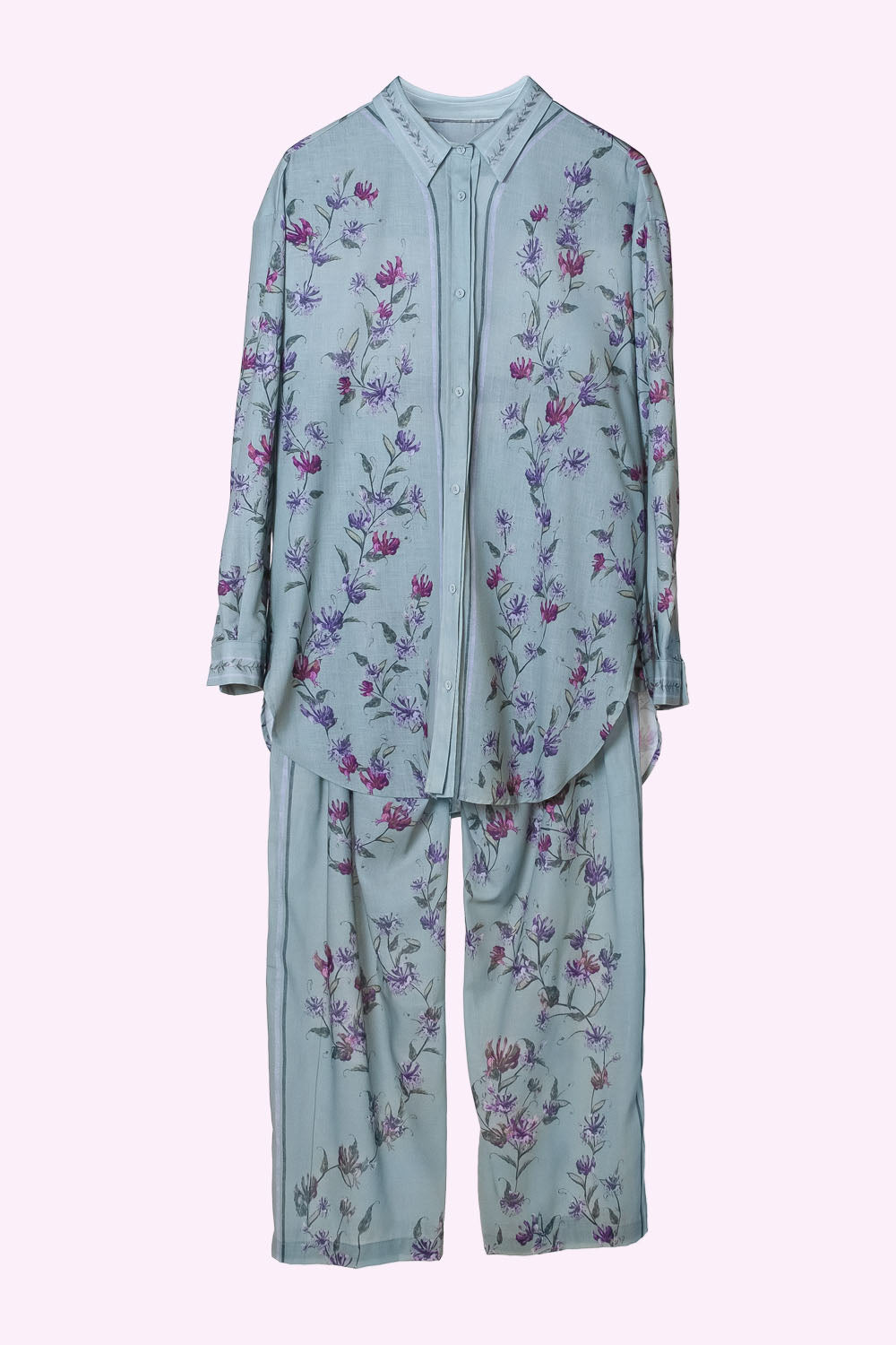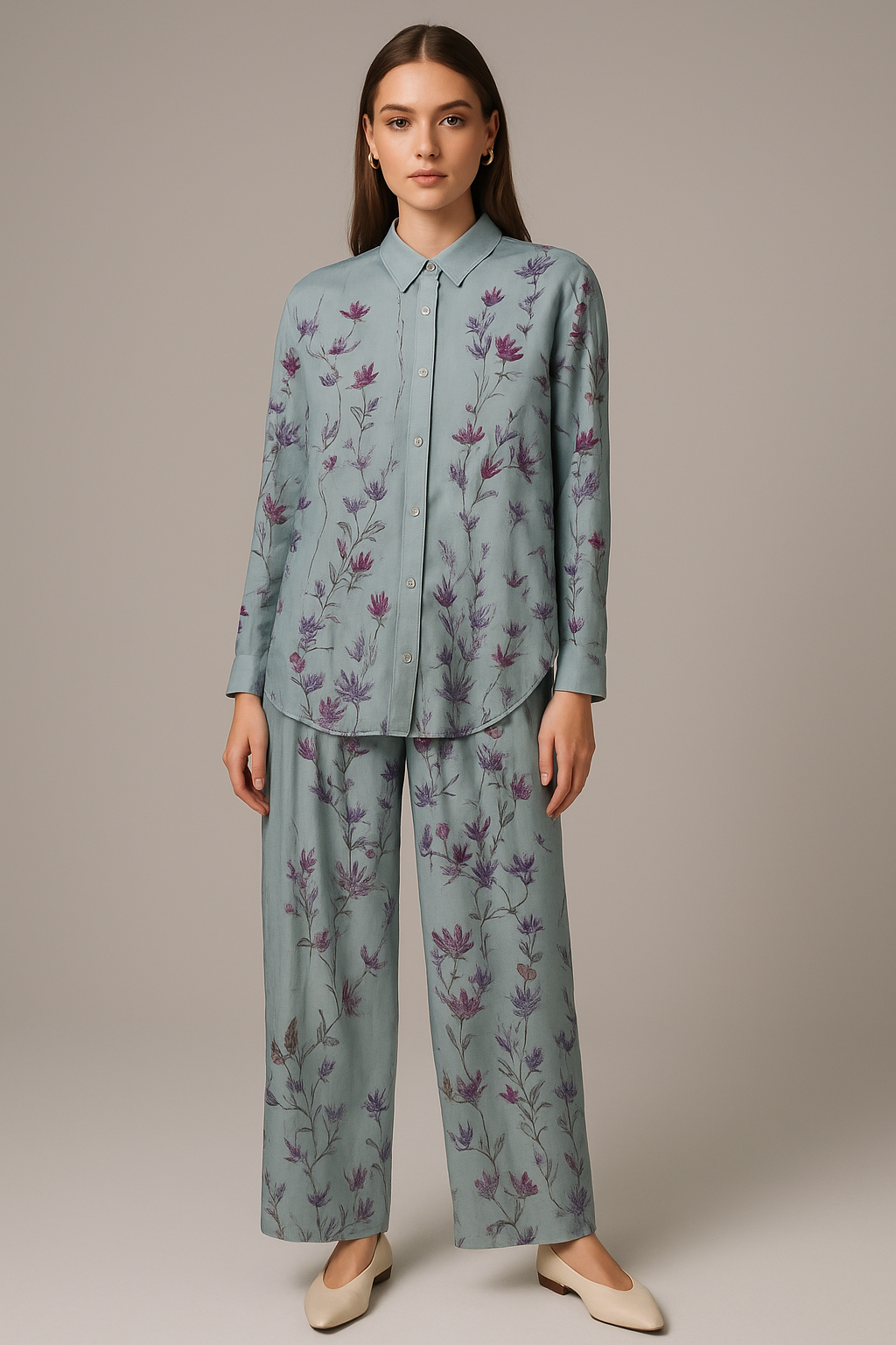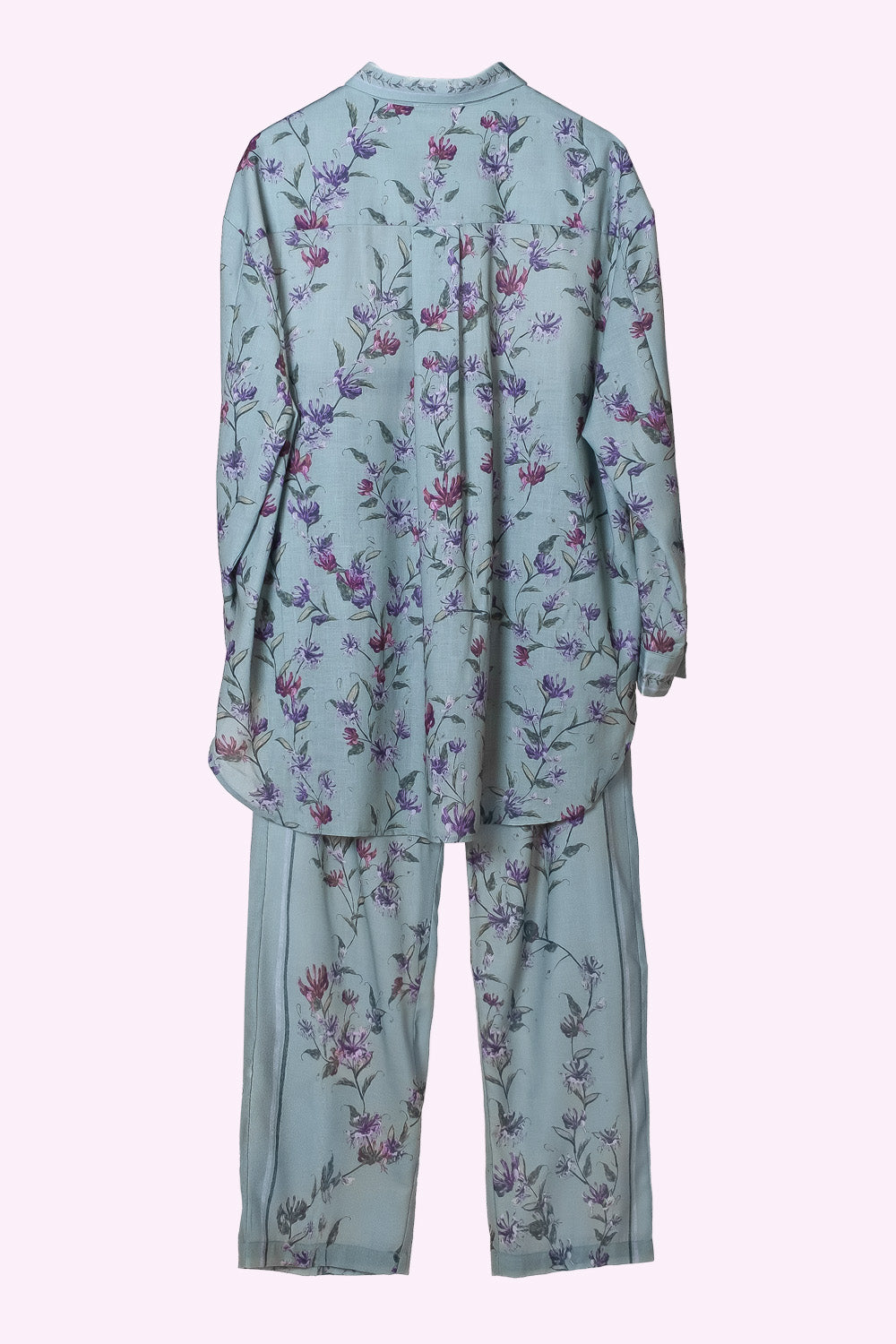 Azure Whisper Ensemble, mavi-gri zemin üzerine serpiştirilmiş mor ve pembe tonlardaki floral desenleriyle doğanın zarif dengesini yansıtır. Hafif dökümlü, oversize gömlek formu ve rahat kesim pantolonu ile hareket özgürlüğü sağlar. İnce kumaş dokusu ciltte ipeksi bir his bırakırken, nefes alan yapısı sayesinde sıcak günlerde bile konfor sunar.