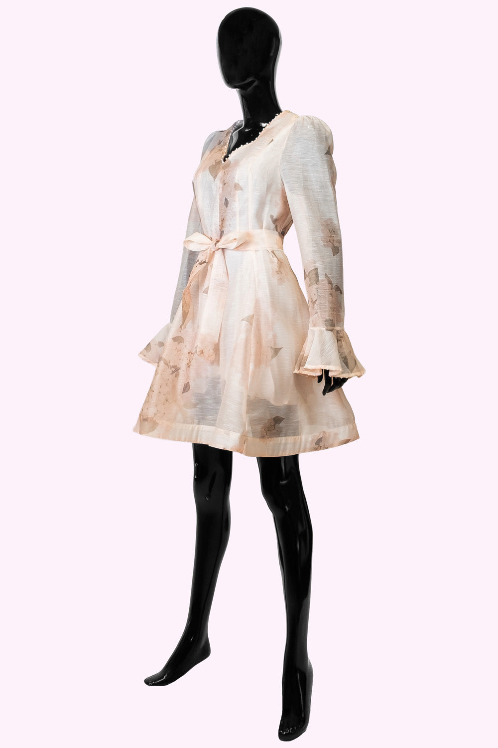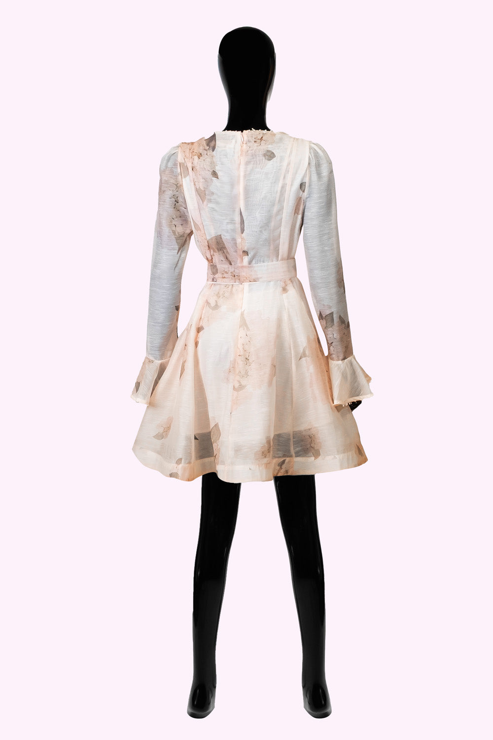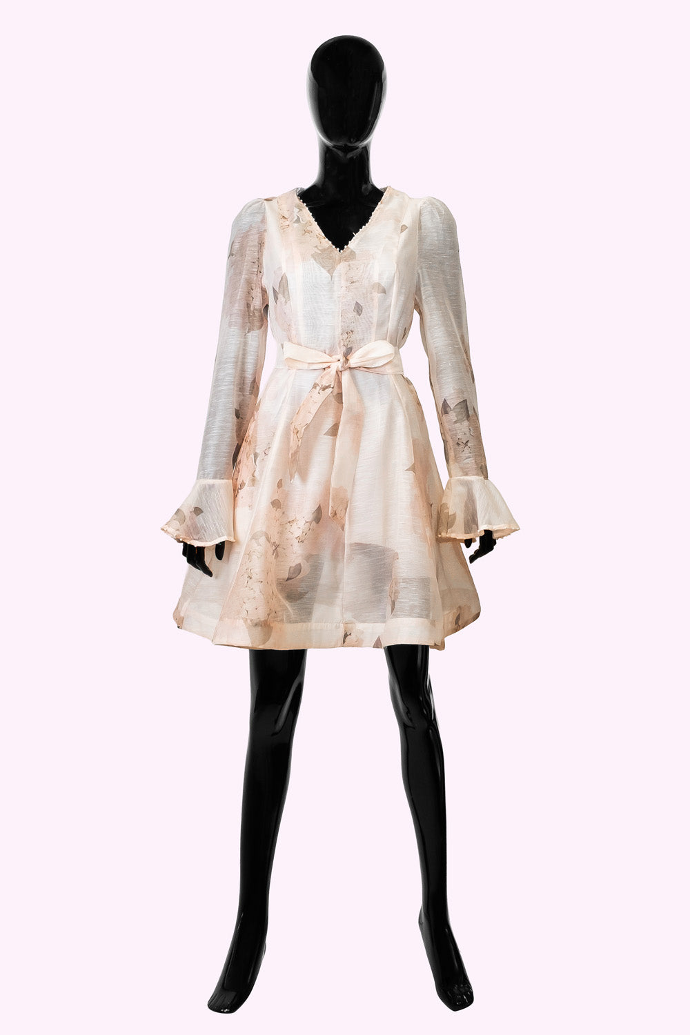 “Étoile de Brume”, sabah sisine bürünmüş kır çiçeklerinin yumuşak dokunuşunu üzerinize taşır. Diz hizasında sonlanan romantik formu, belden bağlamalı tasarımı ve uçuşan kollarıyla zarafeti yeniden tanımlar. Doğal ışıkta adeta parlar.