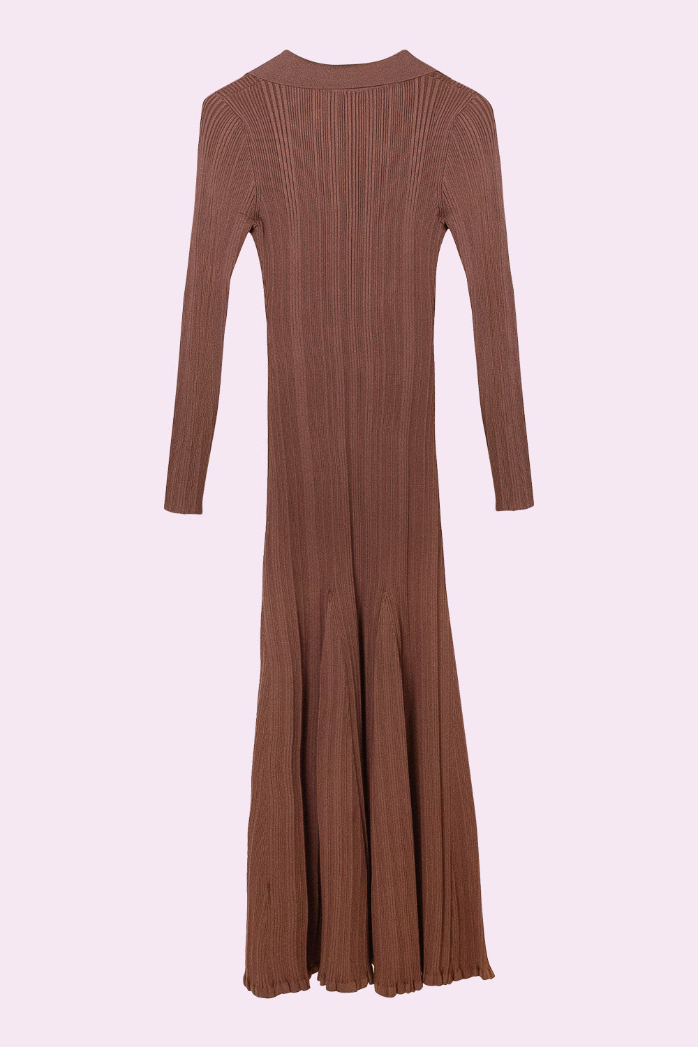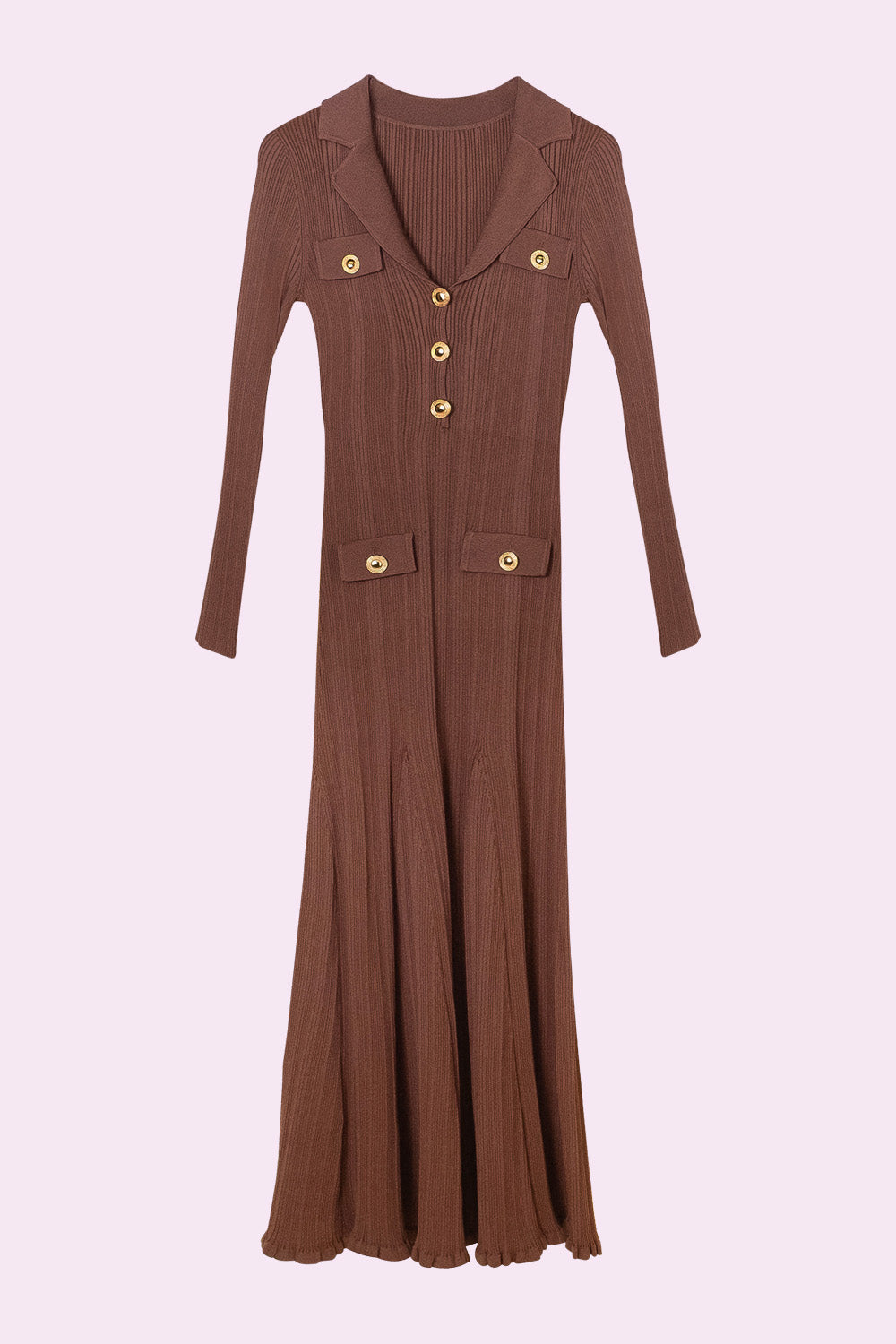 Yumuşak kahve tonları, sıcak bir kış sabahını hatırlatırken, belden oturan formu ve dökümlü eteğiyle vücudu zarifçe sarar.