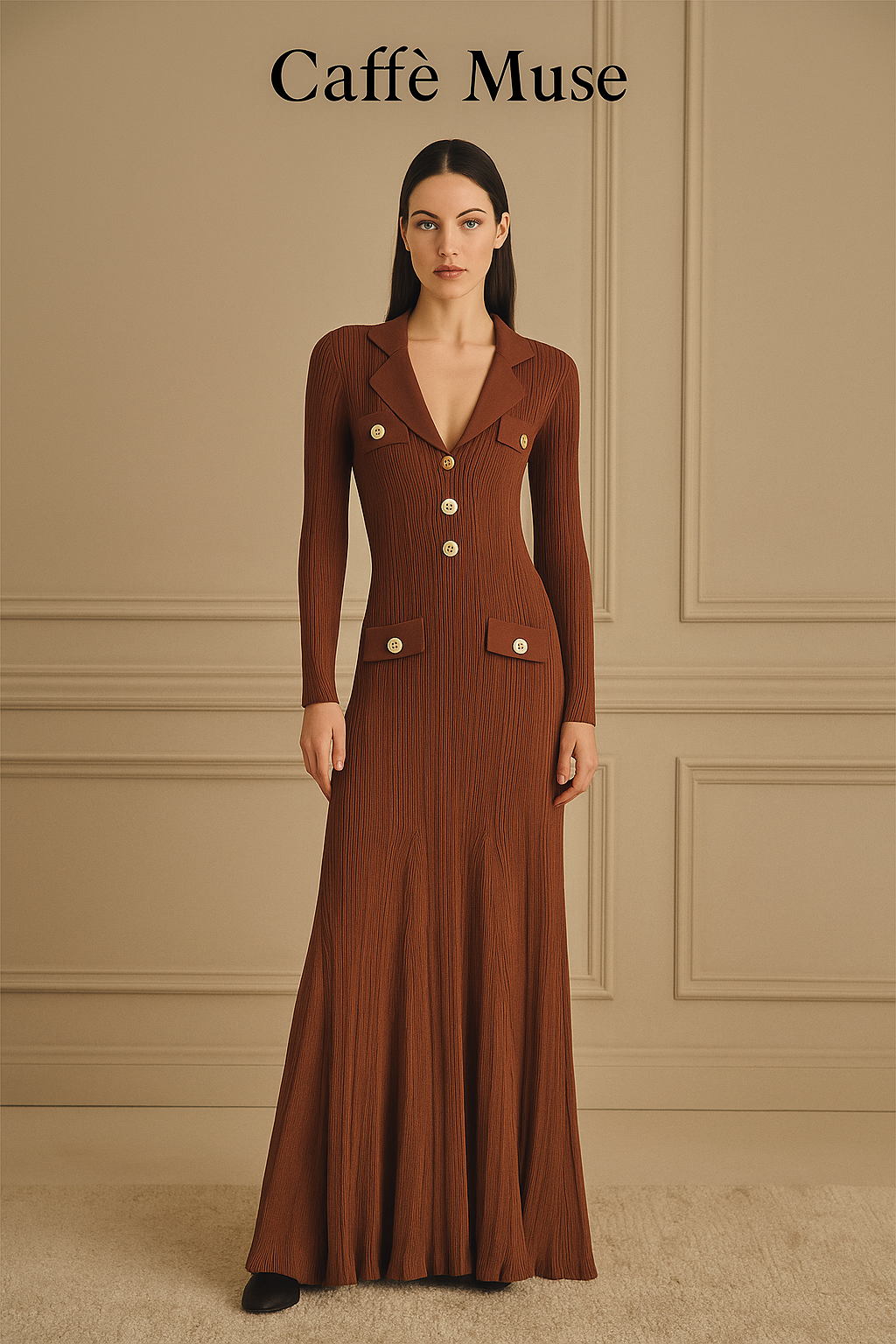 Caffè Muse, 70’lerin ikonik siluetlerinden ilham alarak, ribana dokulu triko kumaşı ve zarif altın düğme detaylarıyla modern bir yorum sunar.