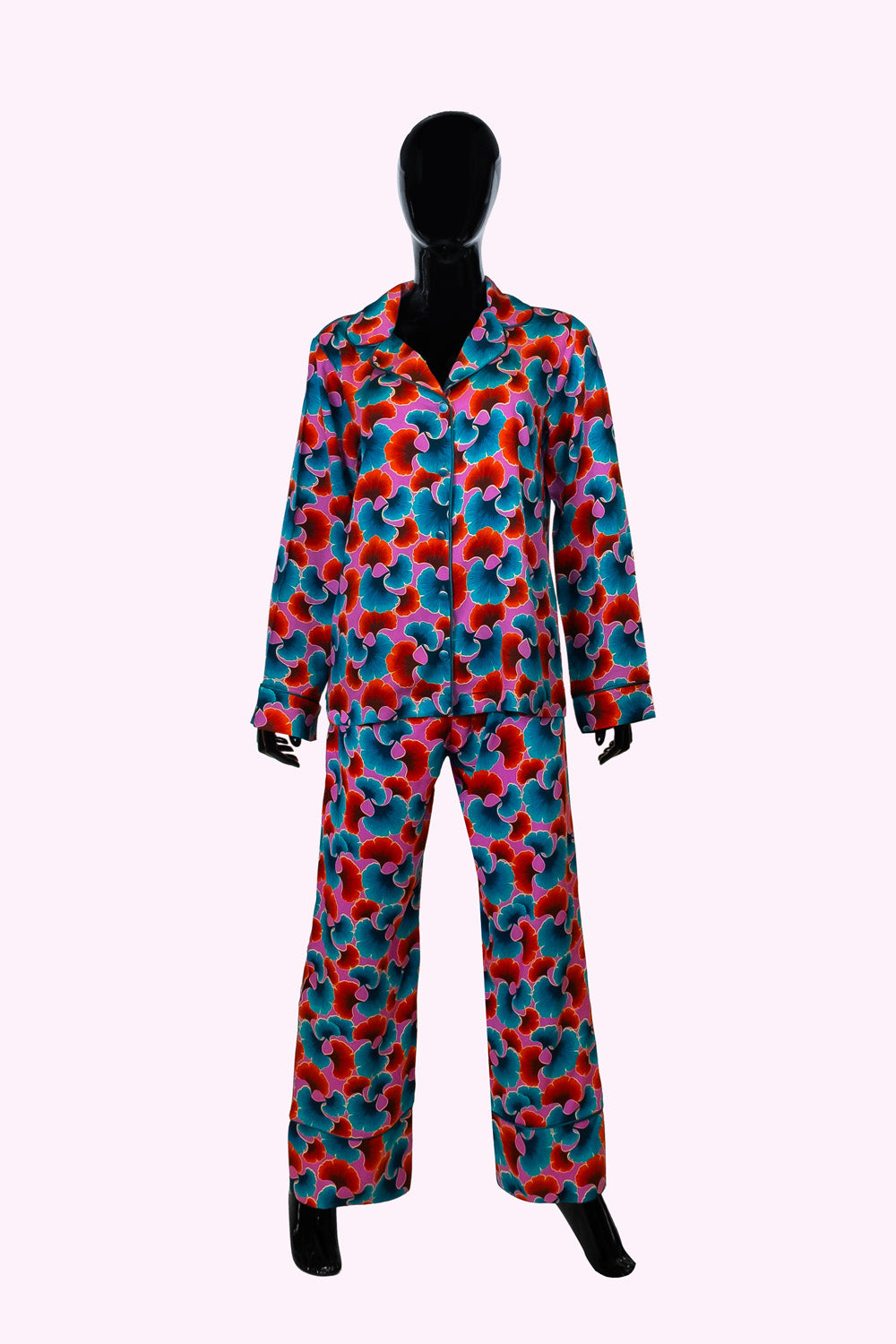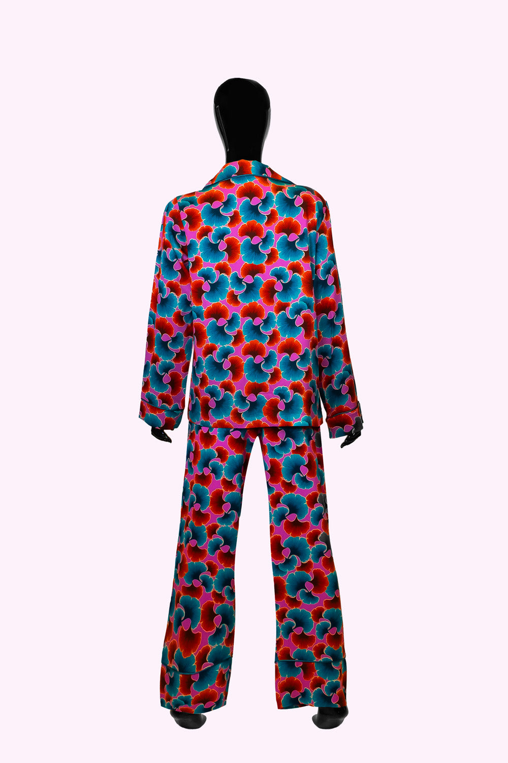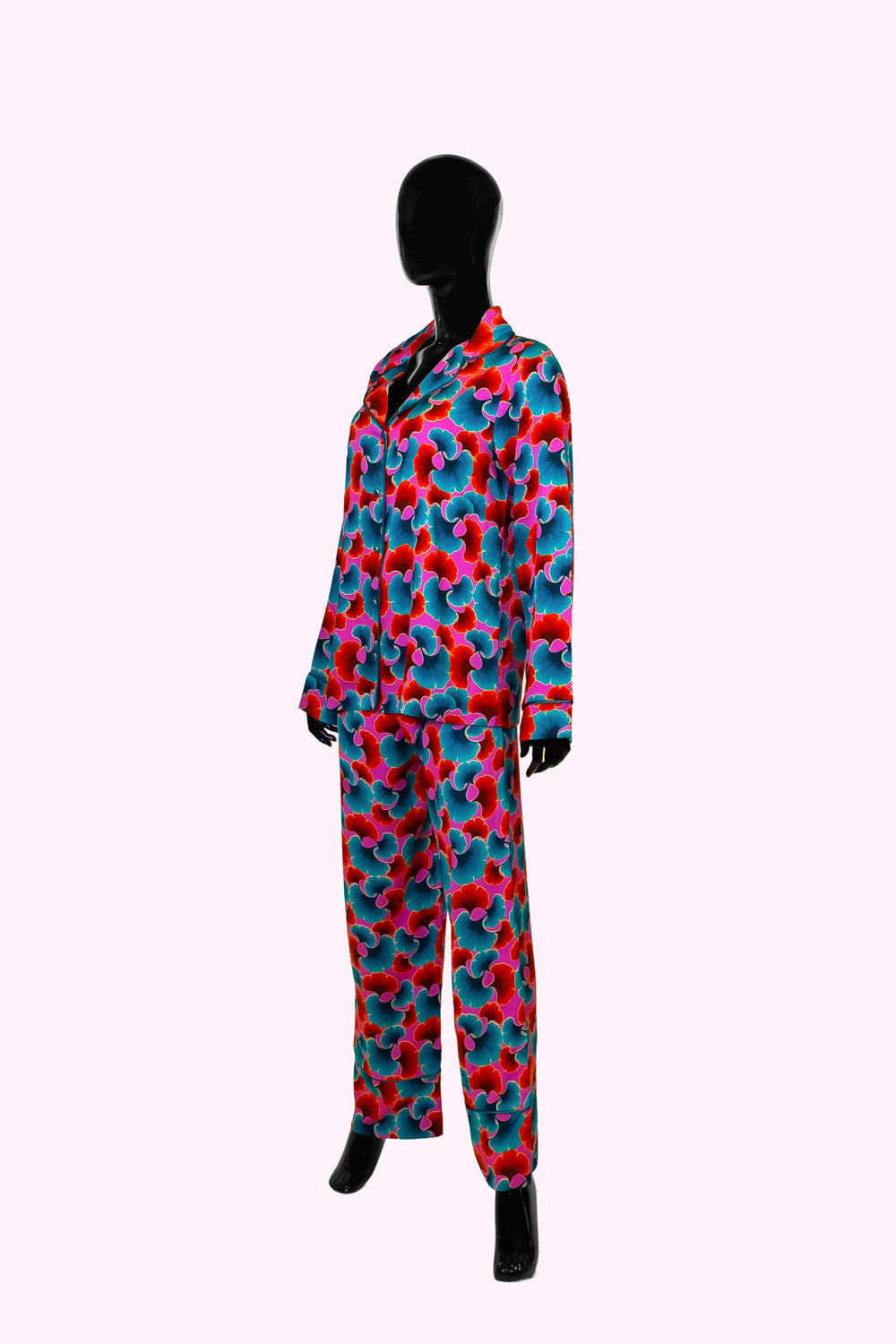 Canlı desenleriyle enerjik, parlak saten pijama takımı: rahatlığın çiçek açtığı hâli.