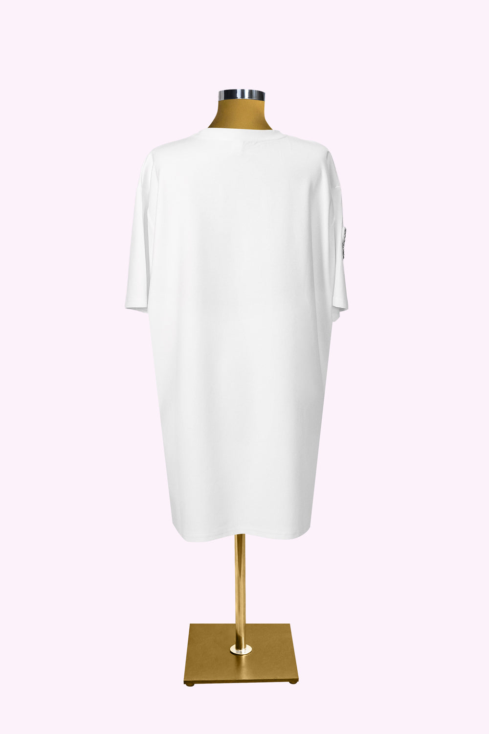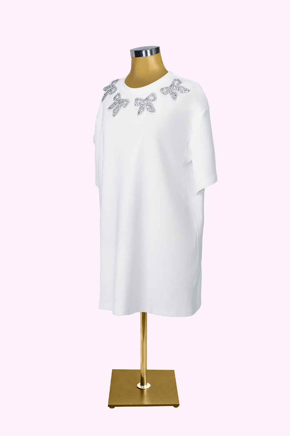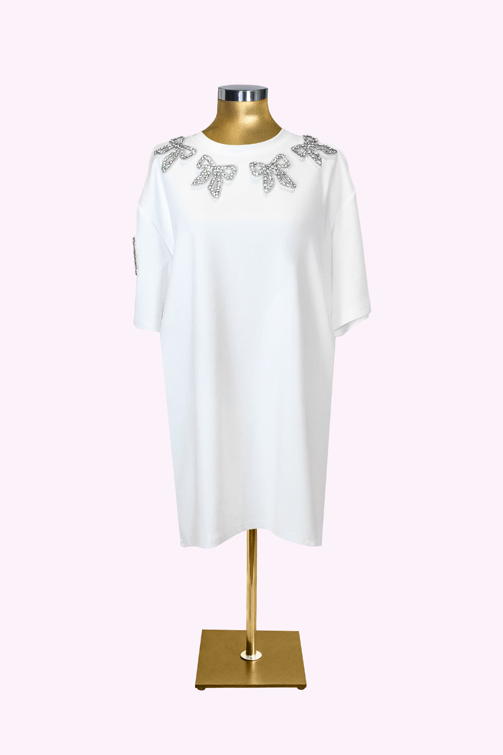 Saf beyaz saten kumaşı, gece gökyüzünün berraklığını yansıtırken, yaka ve omuzlardaki metalik fiyonk süslemeleri yıldızlar gibi parıldıyor.