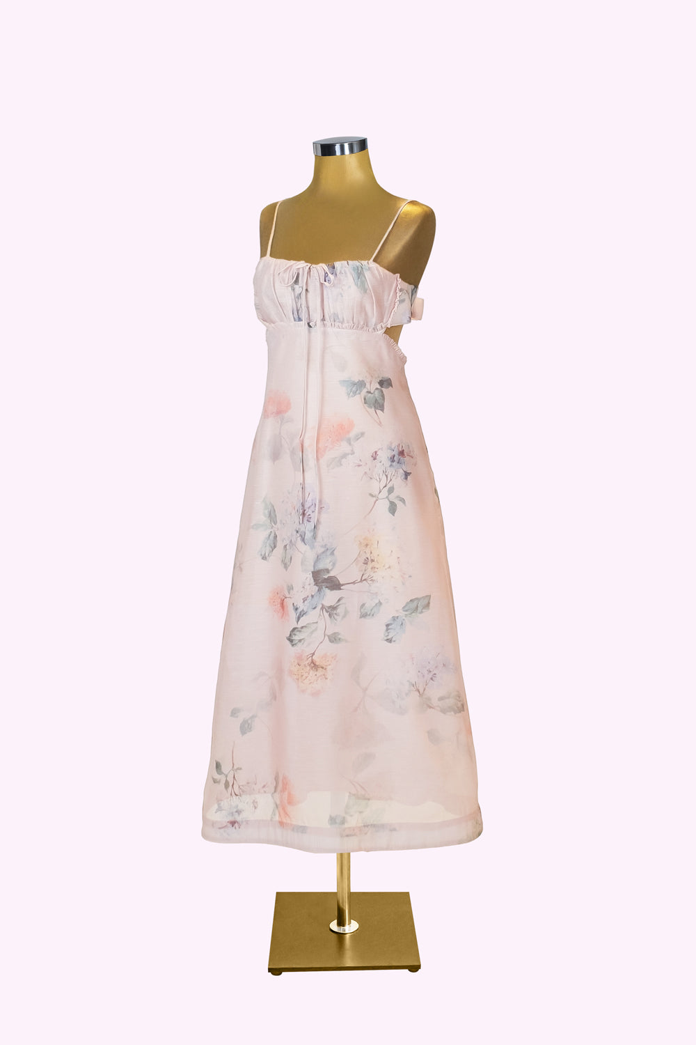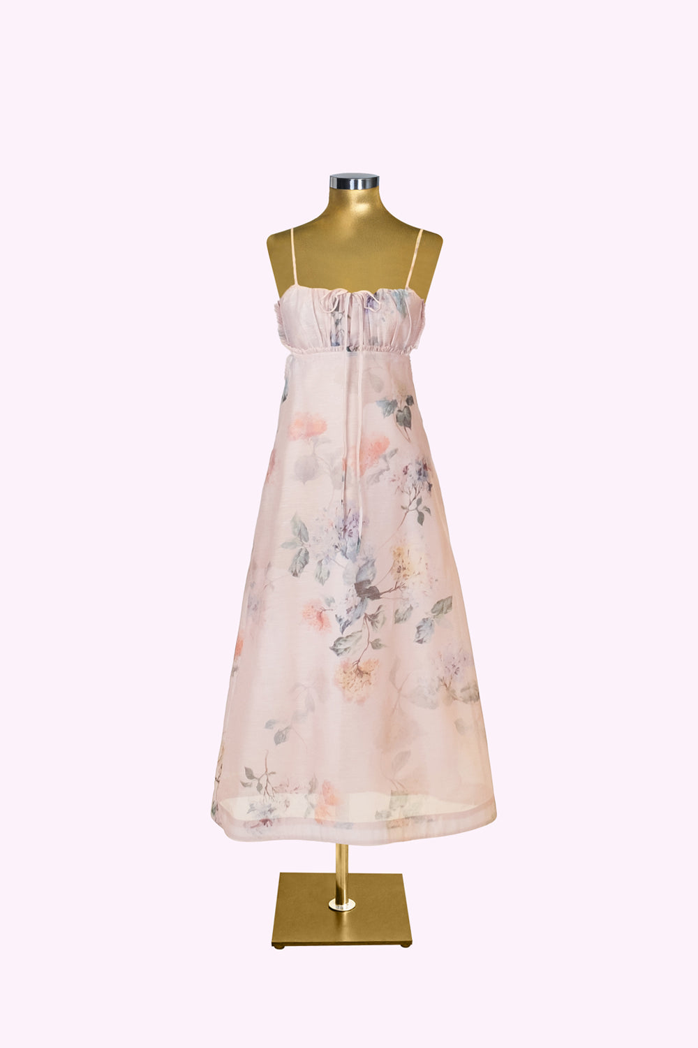 Pudra tonlarındaki zemin üzerine serpilen zarif çiçek desenleri, pastoral bir tabloyu andırıyor.