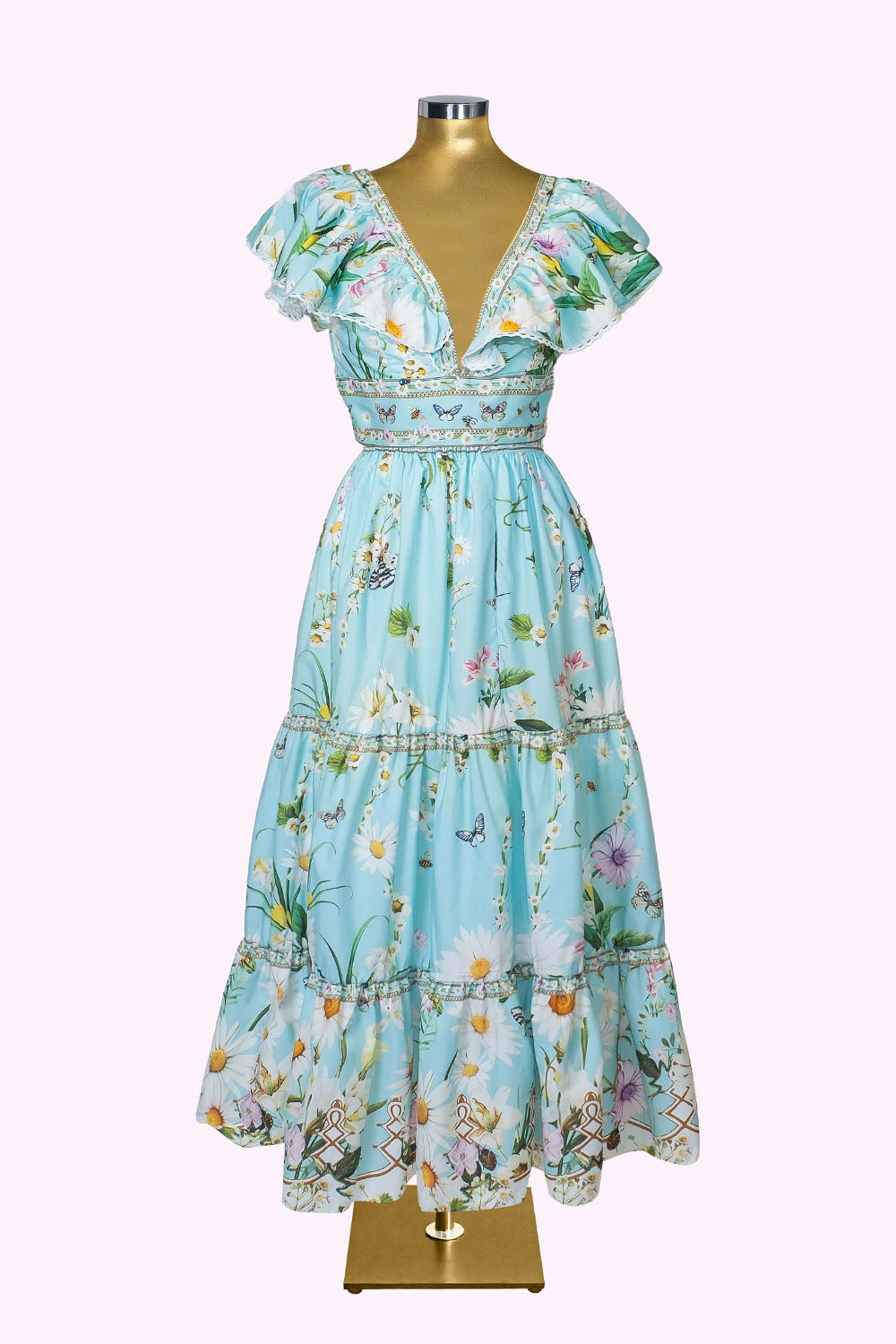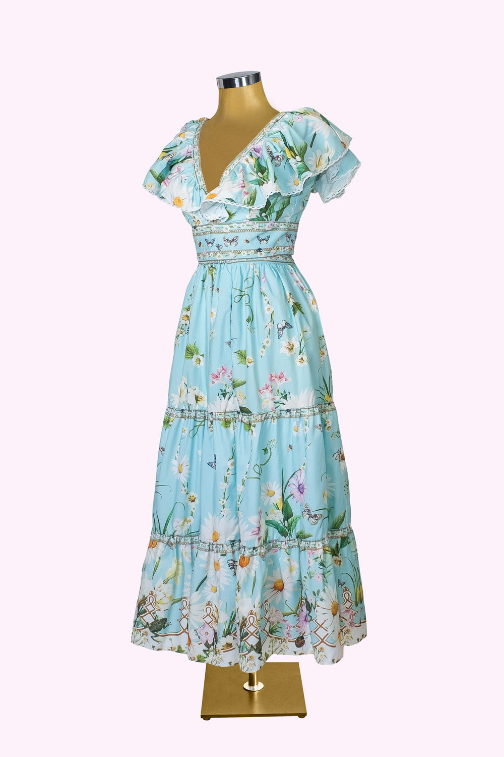 Pastel mavi zemin üzerine işlenmiş zarif kır çiçekleri, elbiseye pastoral bir zarafet katarken, kat kat etek formu ve derin V yakası feminen silueti öne çıkarır.