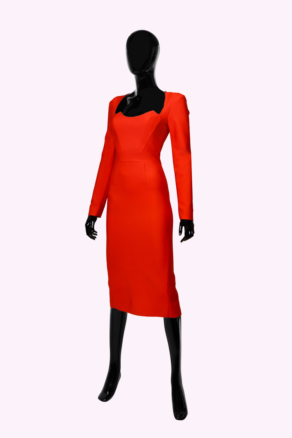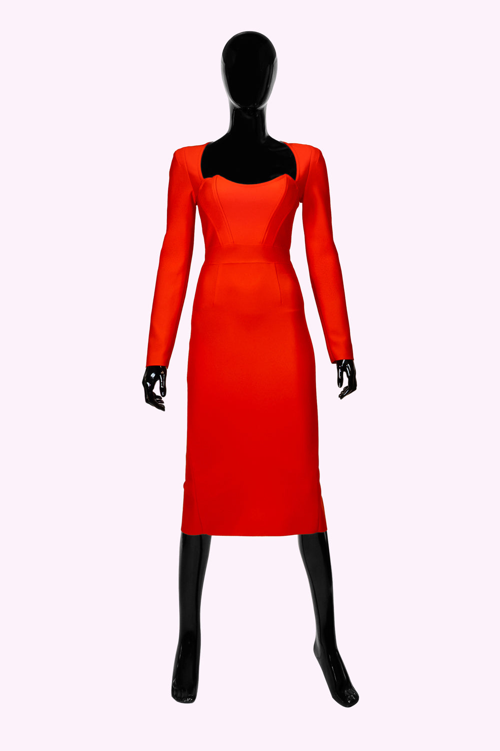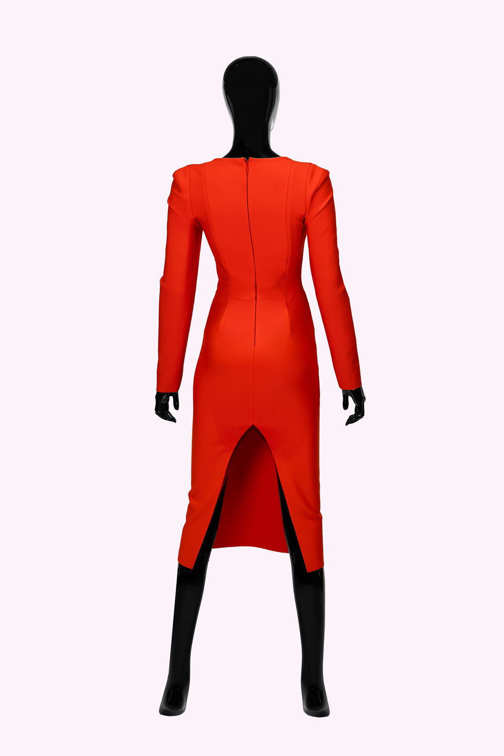 Kırmızı, bu tasarımda sadece bir renk değil; aynı zamanda bir duygu, bir meydan okuma. Derin dekoltesi, mimari formu ve uzun kollarıyla hem zarif hem çarpıcı.