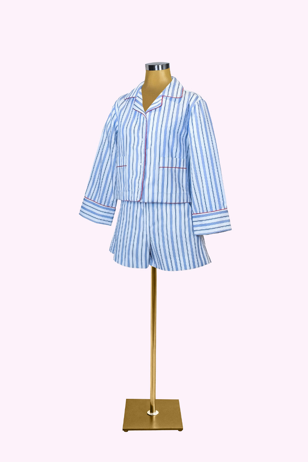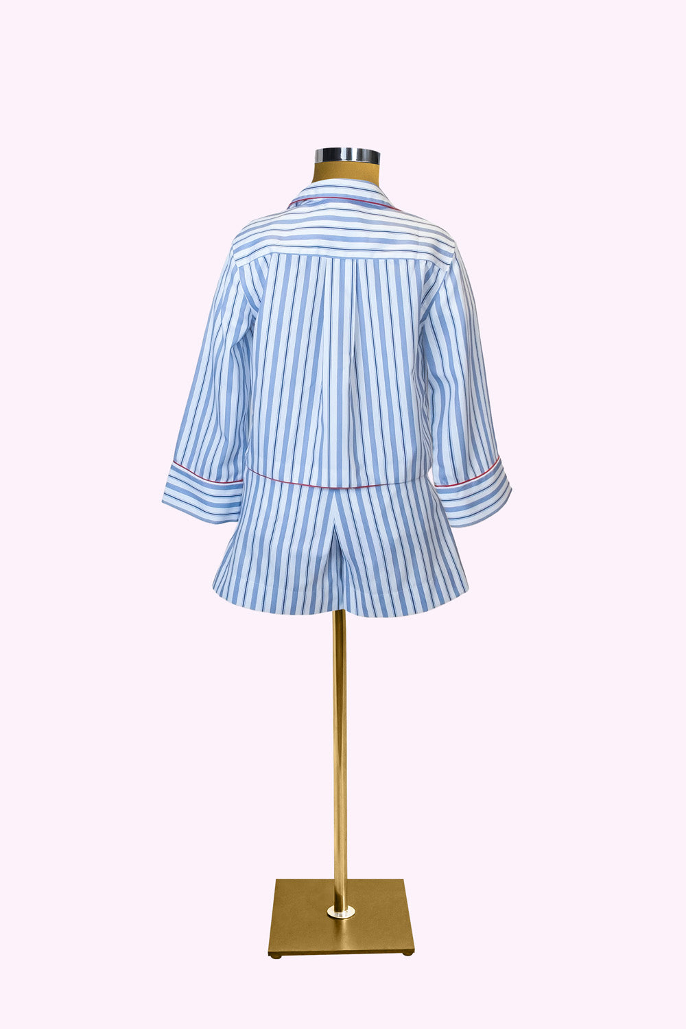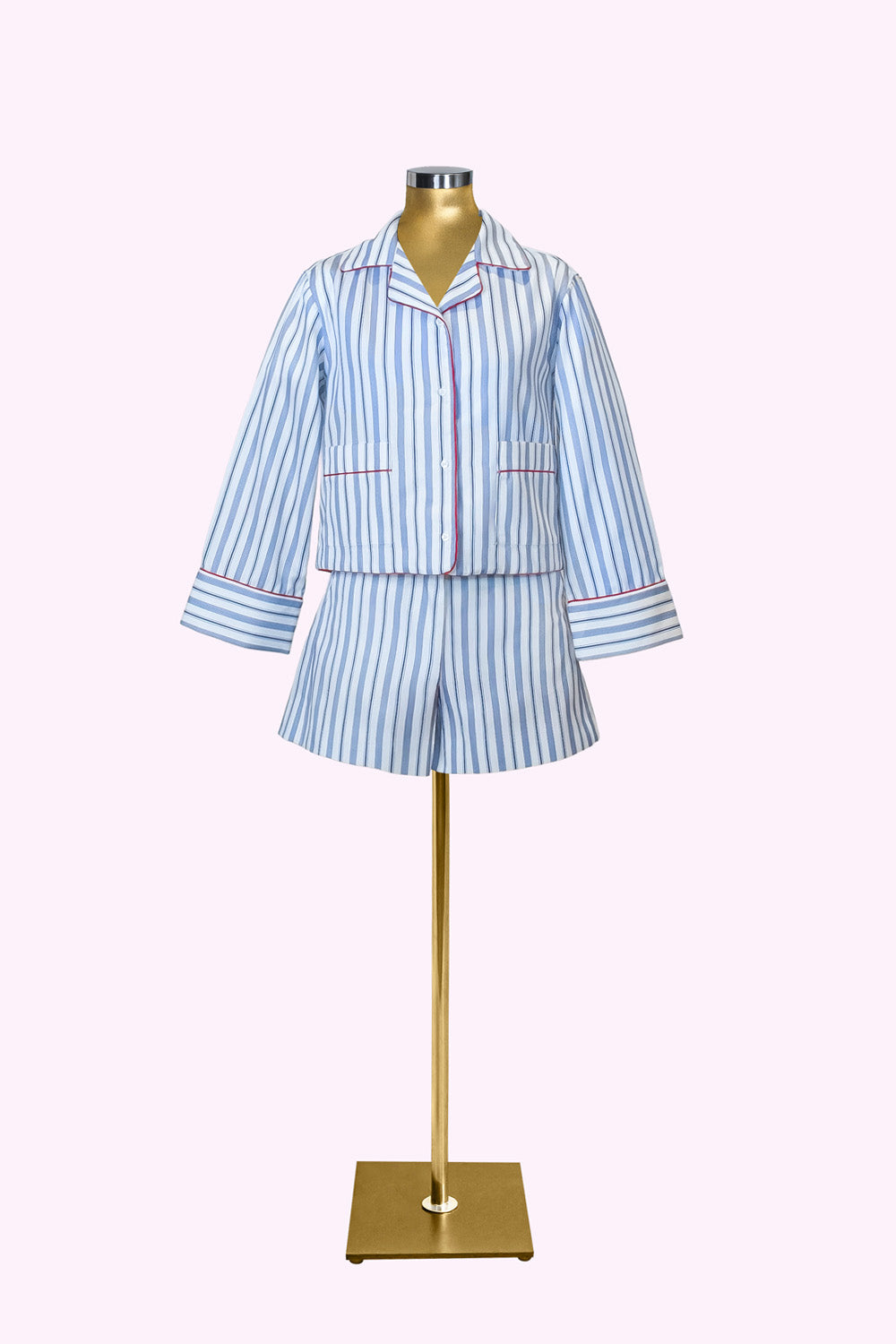 Gri-mavi çizgili deseni ve kırmızı biyeleriyle klasik pijama formuna zarif bir dokunuş getiriyor.