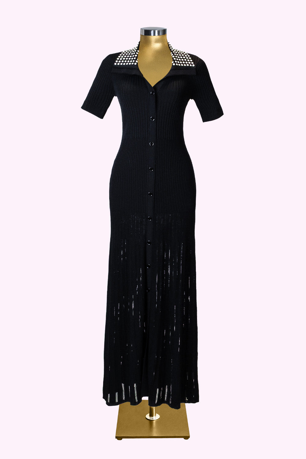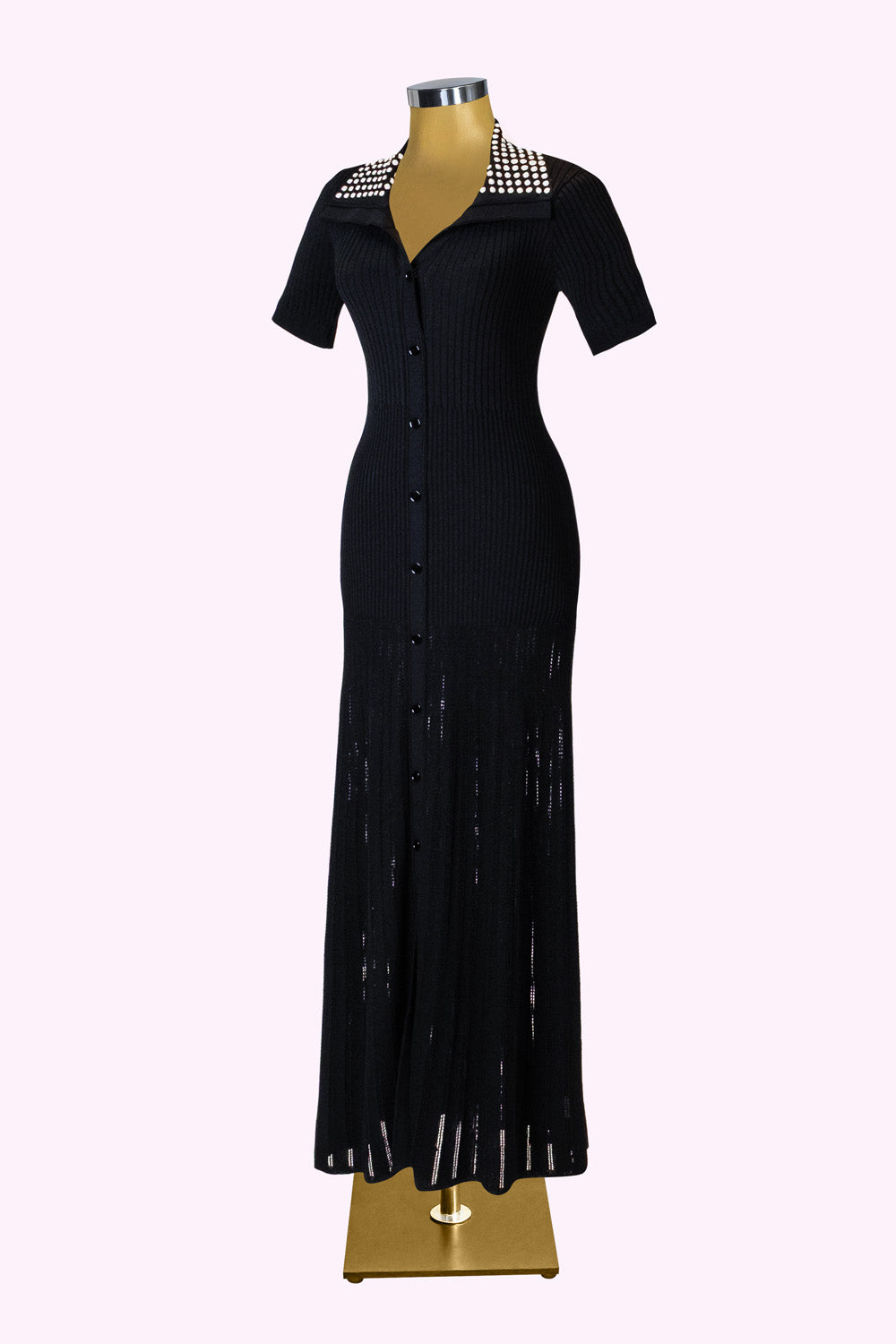 Güçlü omuz detaylarıyla kararlı bir tavır sergilerken, düğmeli silueti ve transparan etek uçlarıyla feminen bir yumuşaklık sunuyor. Gün ışığında zarif, gece ışığında çarpıcı.
