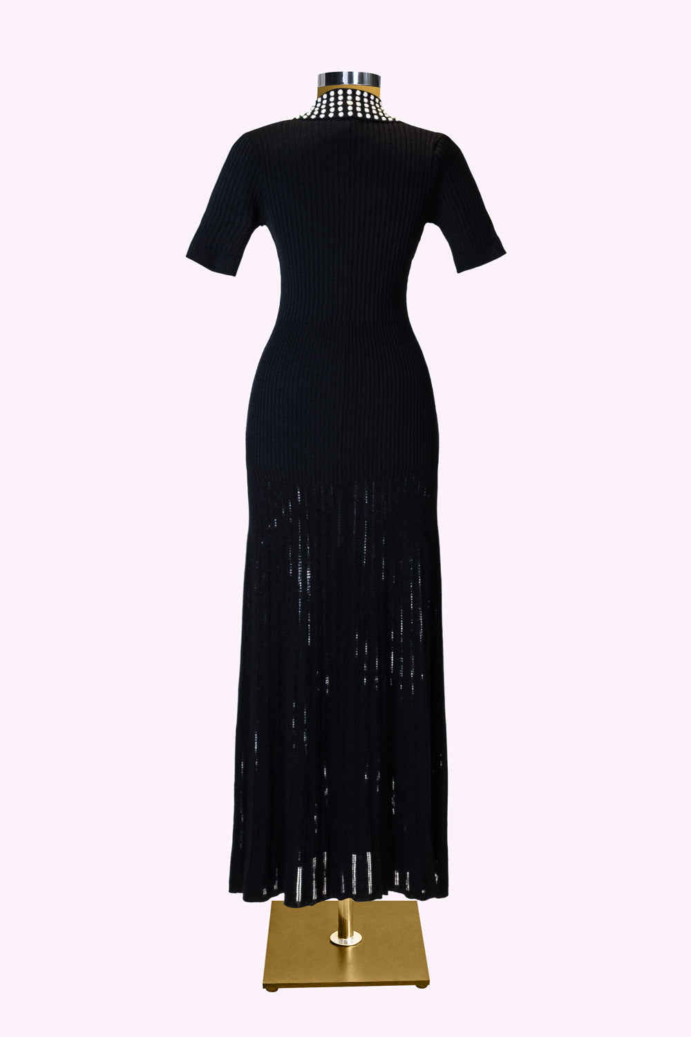 Omuz kısmında metalik detaylı aplikeler, etek ucunda transparan file desen.