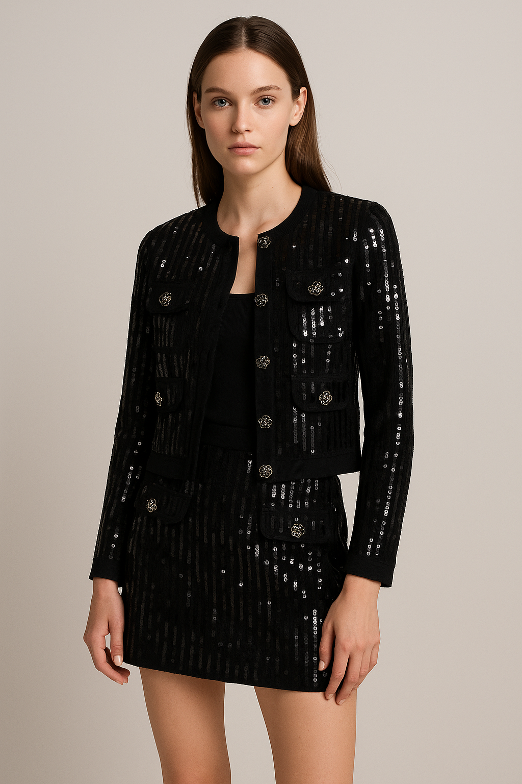 Midnight Allure Set, baştan aşağı zarafetle işlenmiş simli payet detaylarıyla modern lüksün tanımını yeniden yapıyor. İnce dokulu siyah kumaş üzerine yerleştirilmiş parlak işlemeler, her ışıkta farklı bir yansıma oluşturur. Ceket, klasik formuyla sofistike bir duruş sergilerken; minik çiçek formundaki düğmeleriyle feminen bir dokunuş kazandırır.