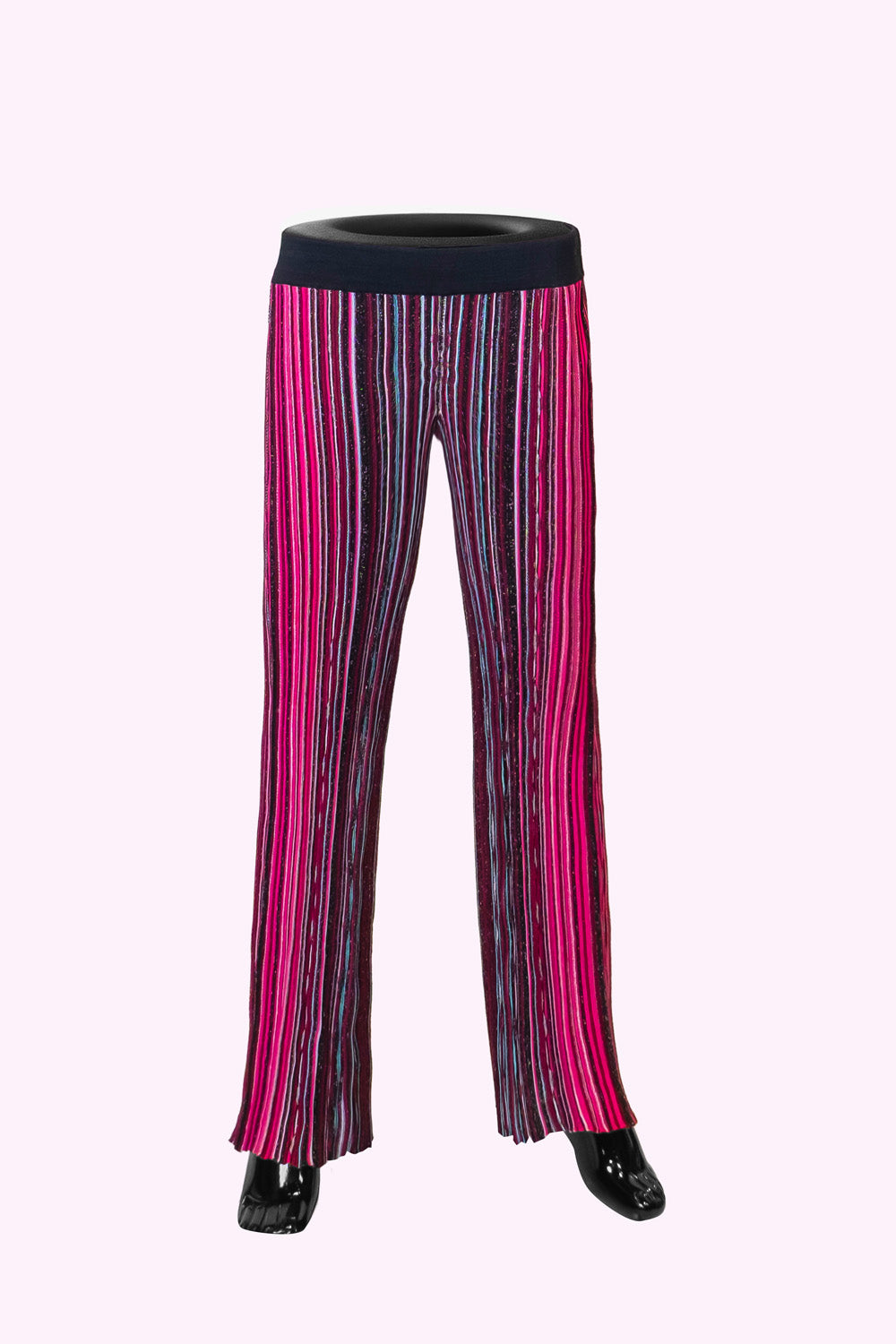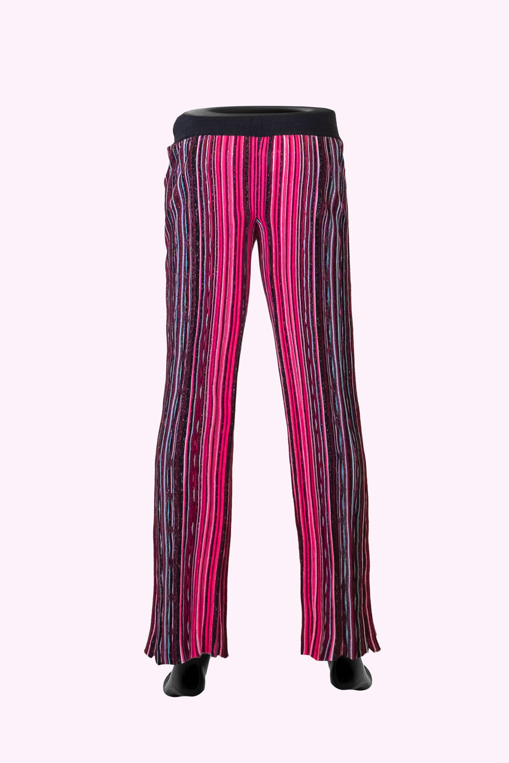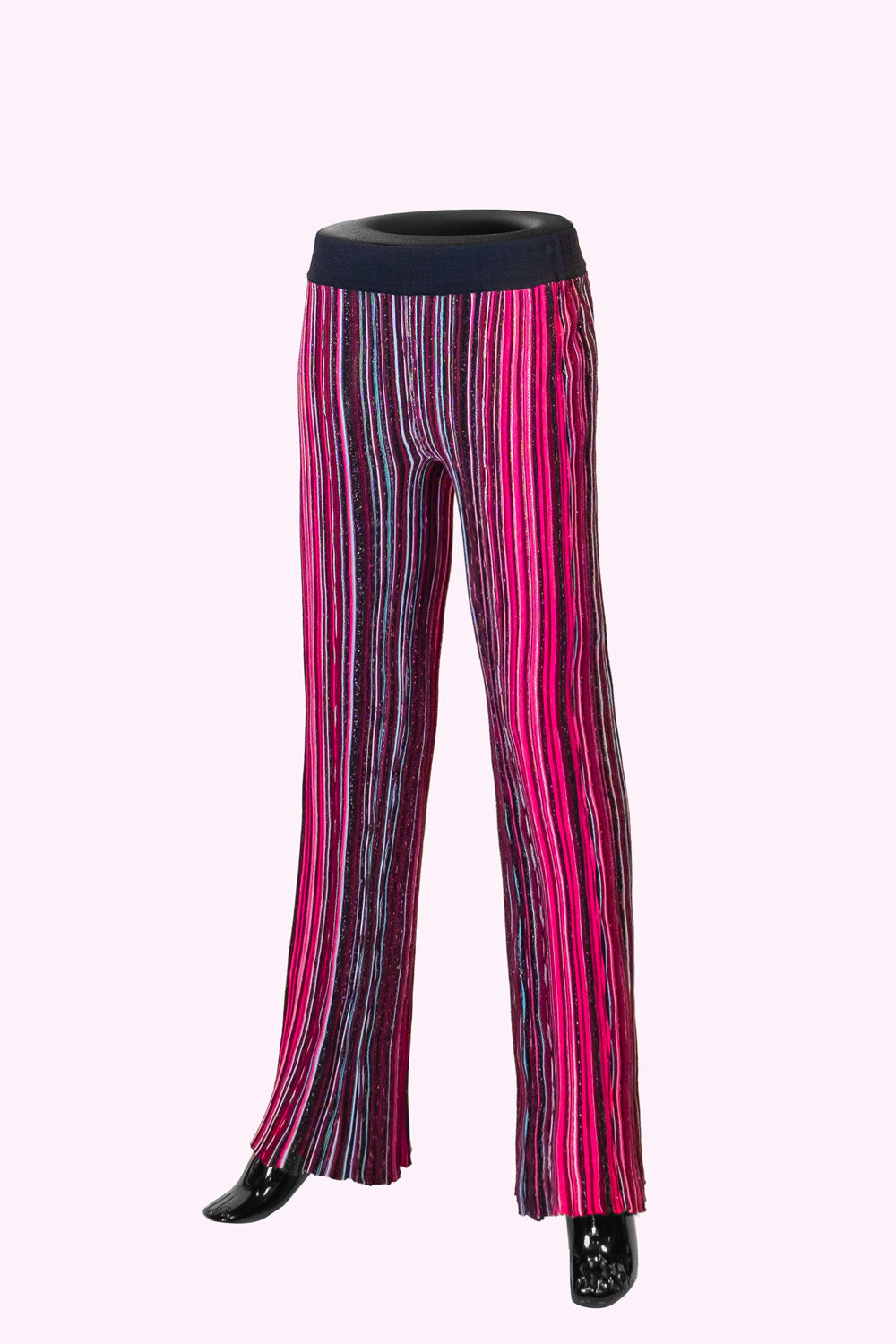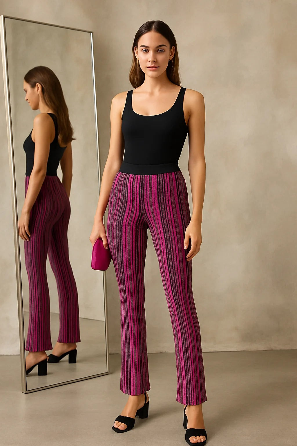 “Nerina Striata”, adeta bir kıyı kentinin sabah esintisi gibi: taze, renkli ve özgür. Pembeden mora, siyahtan fuşyaya uzanan çizgileriyle bedenin ritmine eşlik eden bu pantolon, her adımda farklı bir duyguyu yansıtıyor. Triko dokusu sayesinde hem konforlu hem şık bir duruş sunarken, vücuda zarifçe oturup sonra özgürce süzülen kesimiyle dikkat çekiyor.