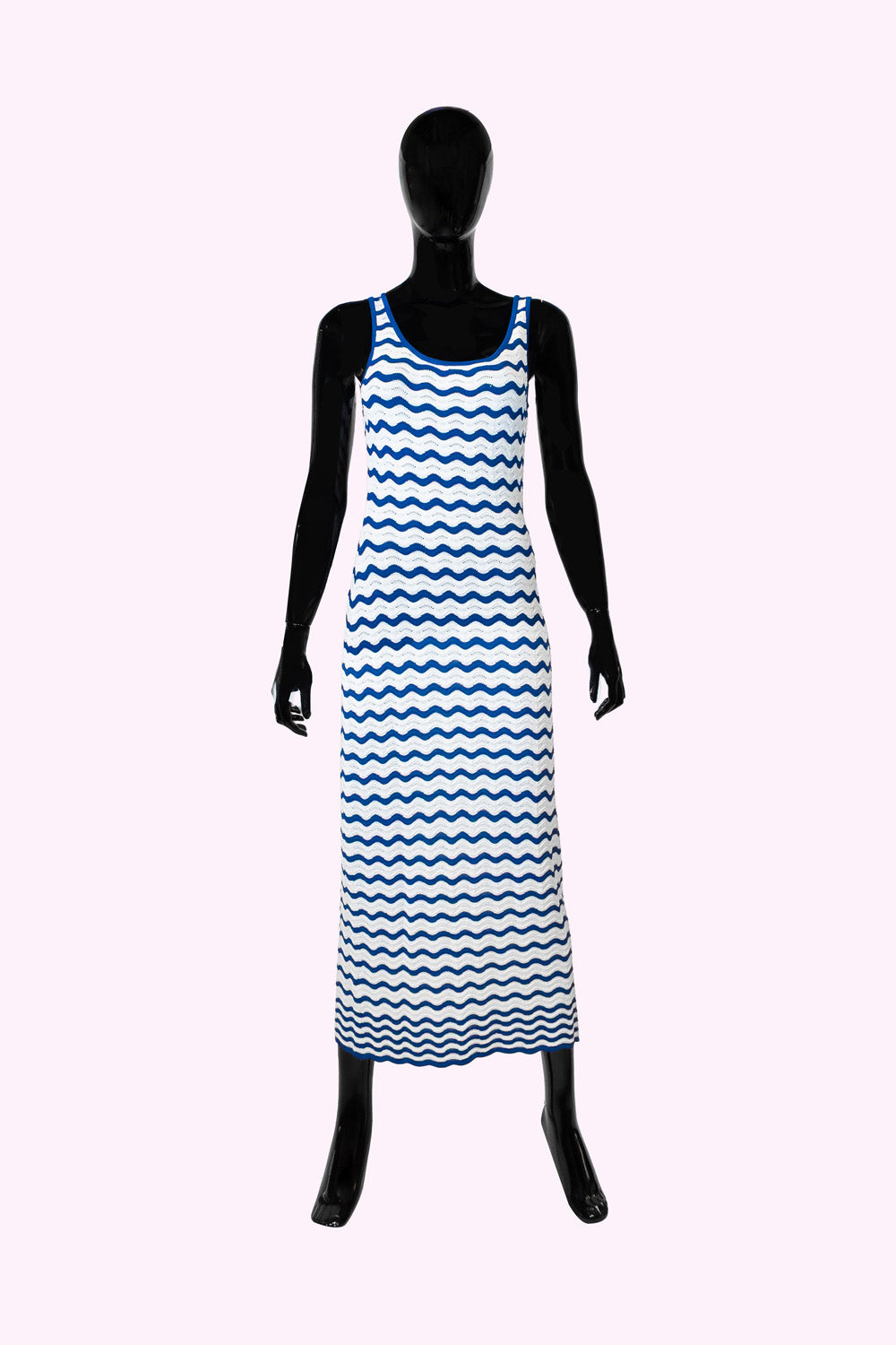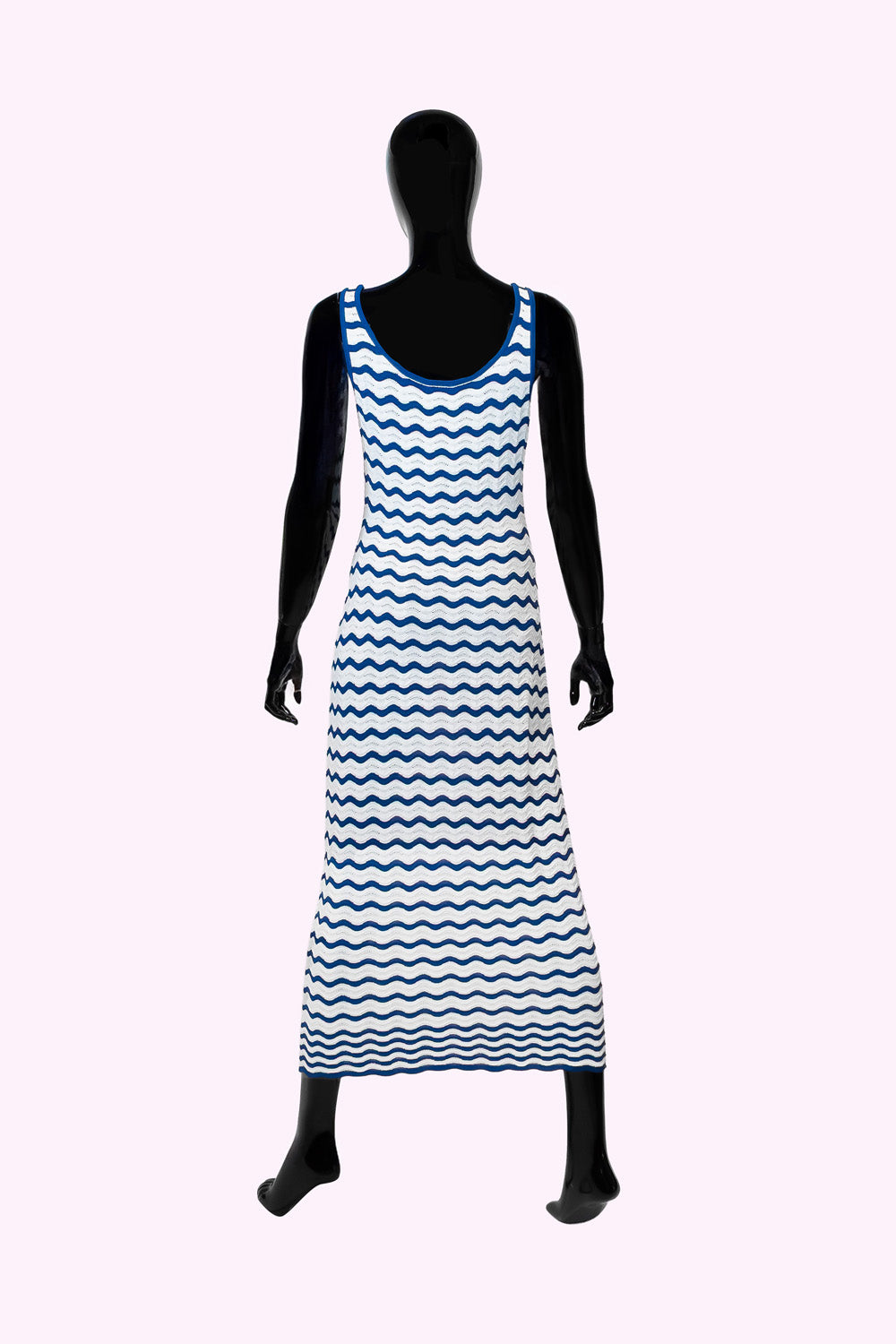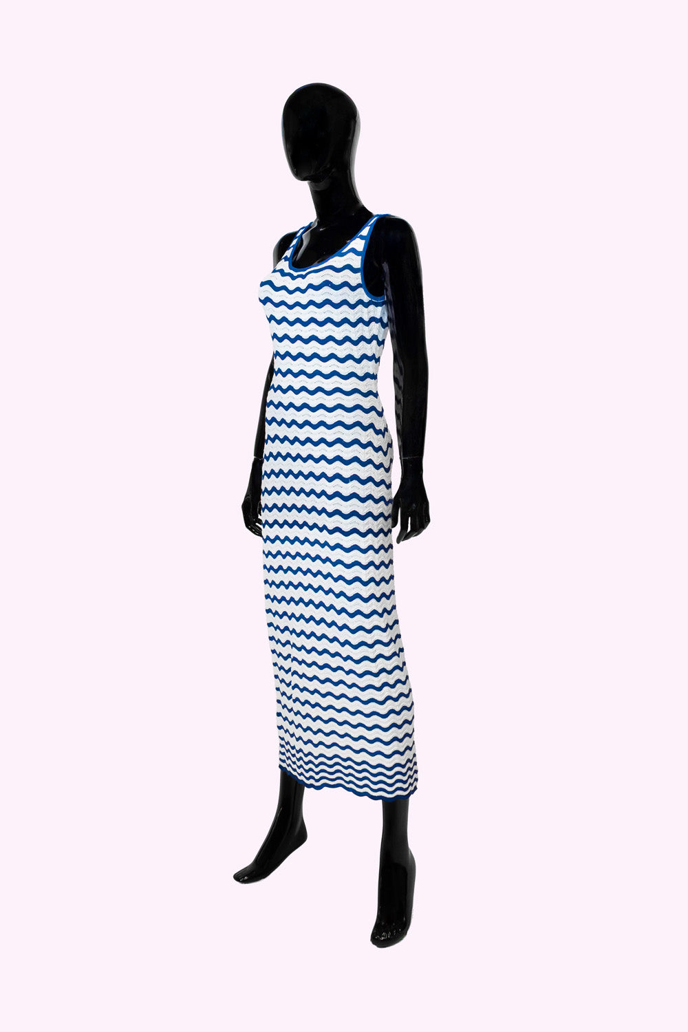 Mavi-beyaz zigzag desenleriyle adeta denizle dans eden bu plaj elbisesi; minimal çizgilerle maksimum etki yaratan, rahat ve feminen bir yaz parçası.