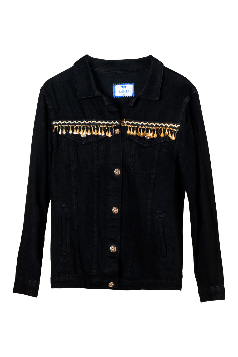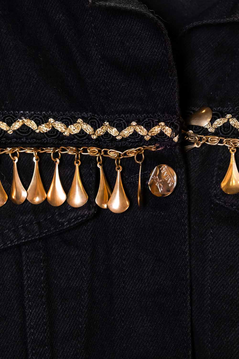 Klasik trucker kalıbından ilham alan ceket, siyah yıkamalı denimiyle zamansız bir temel parça. Omuz çizgisini izleyen şerit üzerinde yer alan mineli görünümlü altın damlalar ve zikzak dokulu bordür, sade tasarıma couture hissi kazandırır. Rahat oturan düz kesim, kat kat kombinlere müsaittir; bakır ton düğmeler ve işlevsel kapaklı cepler denimin özgün karakterini korur. Mini elbiselerin üzerine geceye, ipek gömlek ve sigaret pantolonla gün içine kolayca uyarlanır. Topuklu ayakkabıyla feminen, kalın tabanlı botla şehirli ve iddialı.
