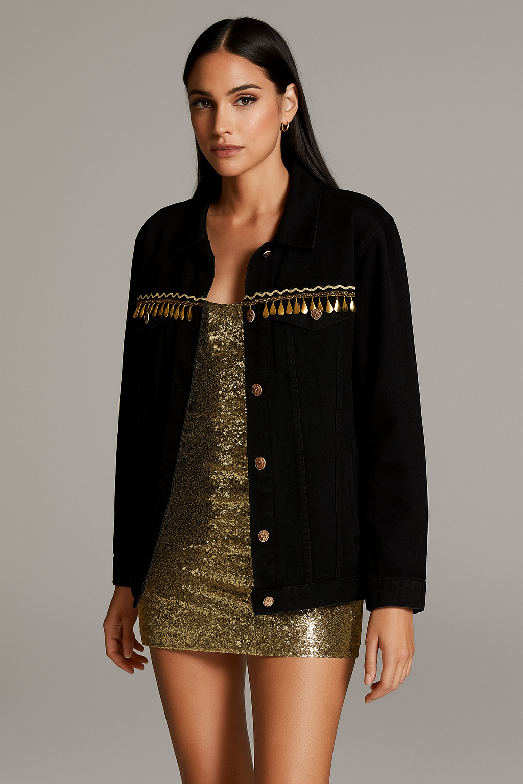 Altın Gece, siyah denimin sakin gücünü altın ışıltıyla buluşturuyor. Göğüs hattında ritmik biçimde dizilen damla formlu aksesuarlar, her adımda ışığı yakalıyor; şehir gecelerine modern nostalji ve çabasız bir lüks duygusu katıyor.