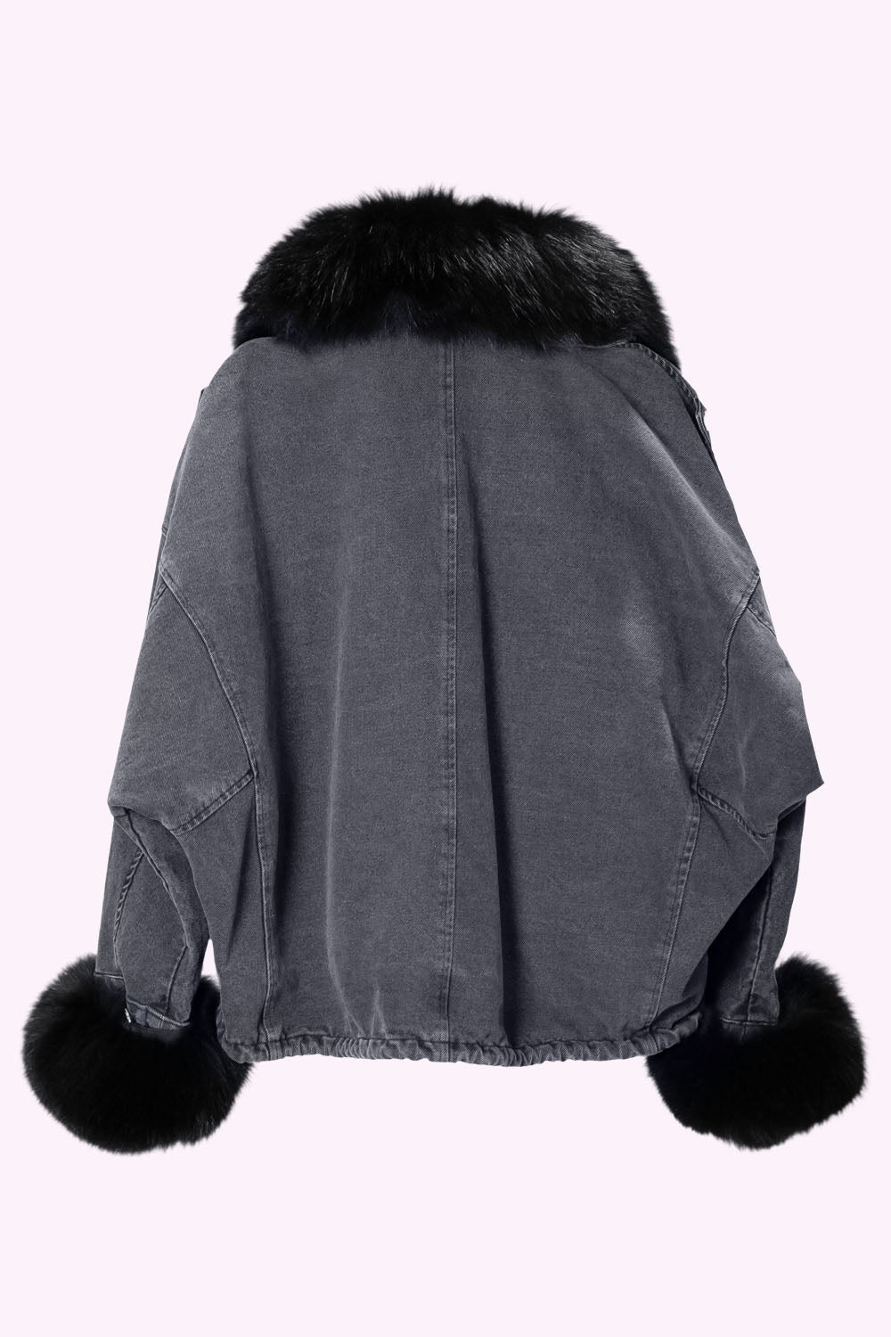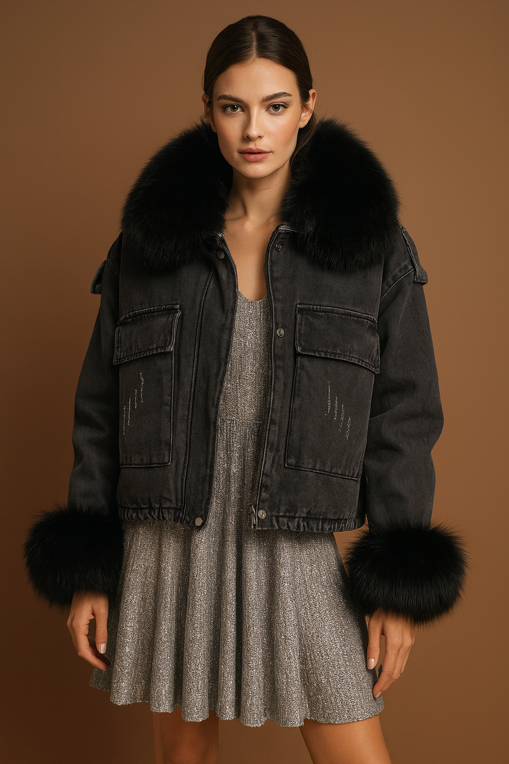 Kendinden cool, şehir temposuna uyumlu bir siluet. Yıkamalı kömür grisi denim, hafif eskitme izleriyle karakter kazanırken, dramatik hacimdeki siyah eko-kürk yakası ve manşetleri tasarıma couture bir kontrast ekler. Relaxed kalıp, katmanlamaya izin verir; önde büyük kapaklı cepler fonksiyonel depolama sunar. Gizli fermuar ve çıtçıt pat birlikte çalışarak rüzgârı keser, lastikli ayarlanabilir etek ucu ısıyı içeride tutar. Omuz hattındaki metal detaylar ve yapılandırılmış kol formu, havacı ceketlerinin güçlü duruşunu modern sokak estetiğiyle buluşturur. Günlük denimler ve kalın taban botlarla asi; ince bir triko ve topuklu botla geceye hazır.