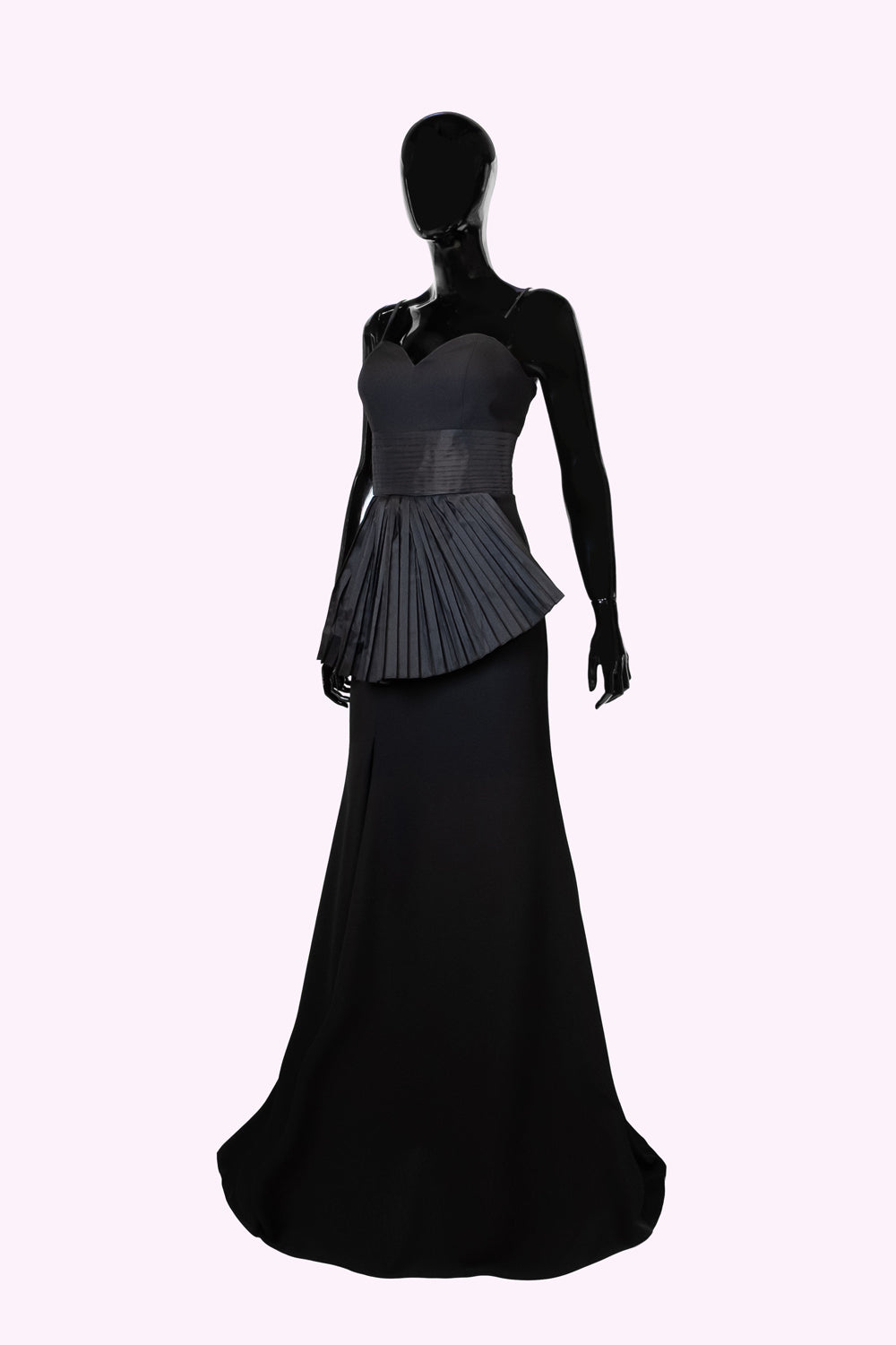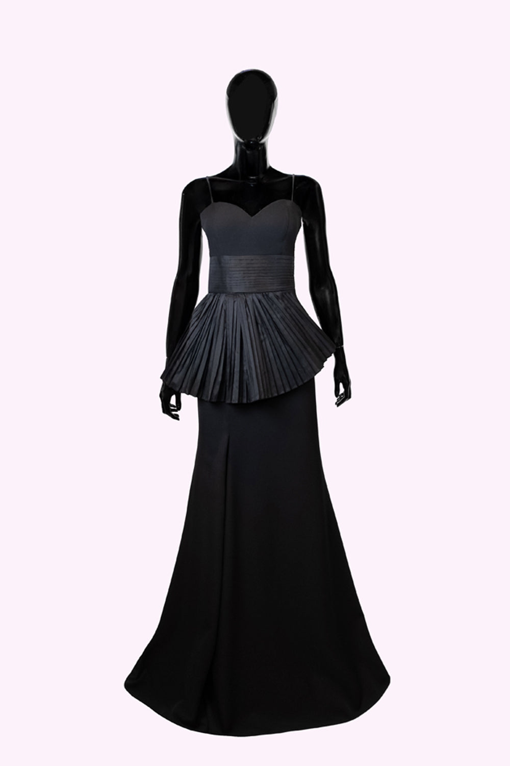 Mikado veya saten karışımlı ağır gramajlı kumaş ile üst kısmı kuşaklı, hacimli piliseli detaylarla zenginleştirilmiş. Vücuda oturan korse yapısıyla güçlü bir form sunarken alt kısımdaki akıcı etek gece şıklığını tamamlıyor. Kumaş mat ile parlak arasında zarif bir denge kuruyor.