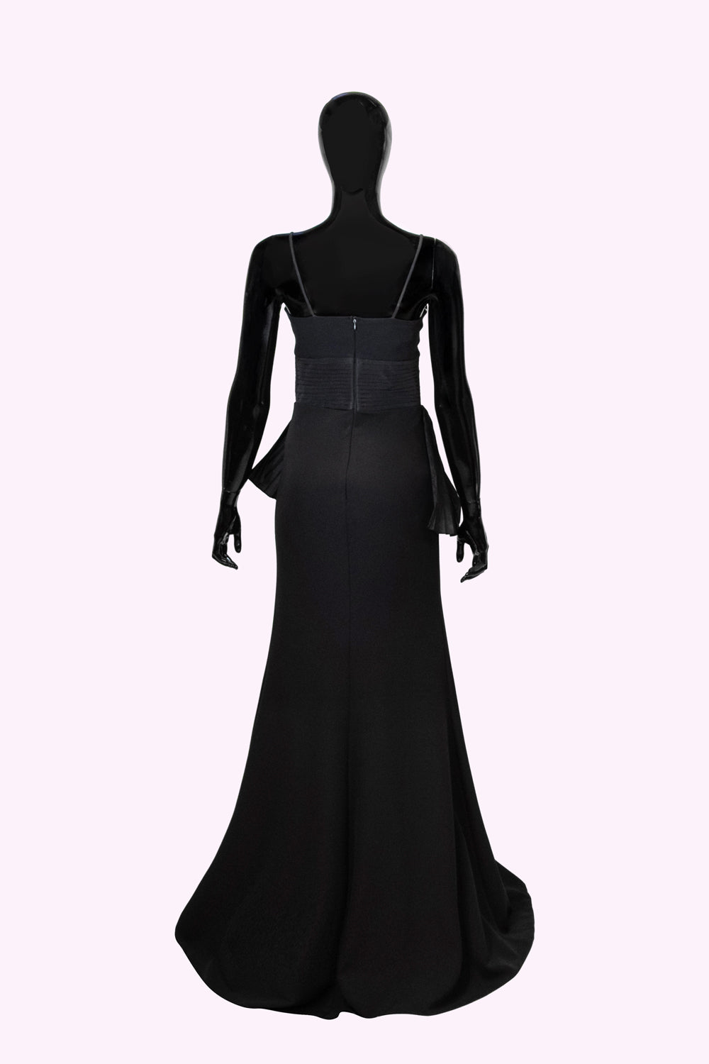 Gala geceleri, ödül törenleri ya da bir davetin yıldızı olmak isteyen kadınlar için yaratıldı. Gümüş detaylı minimal aksesuarlarla tamamlanabilir. Siyahın asaletiyle birleşen bu tasarım, geceye hükmetmeye gelenler için.