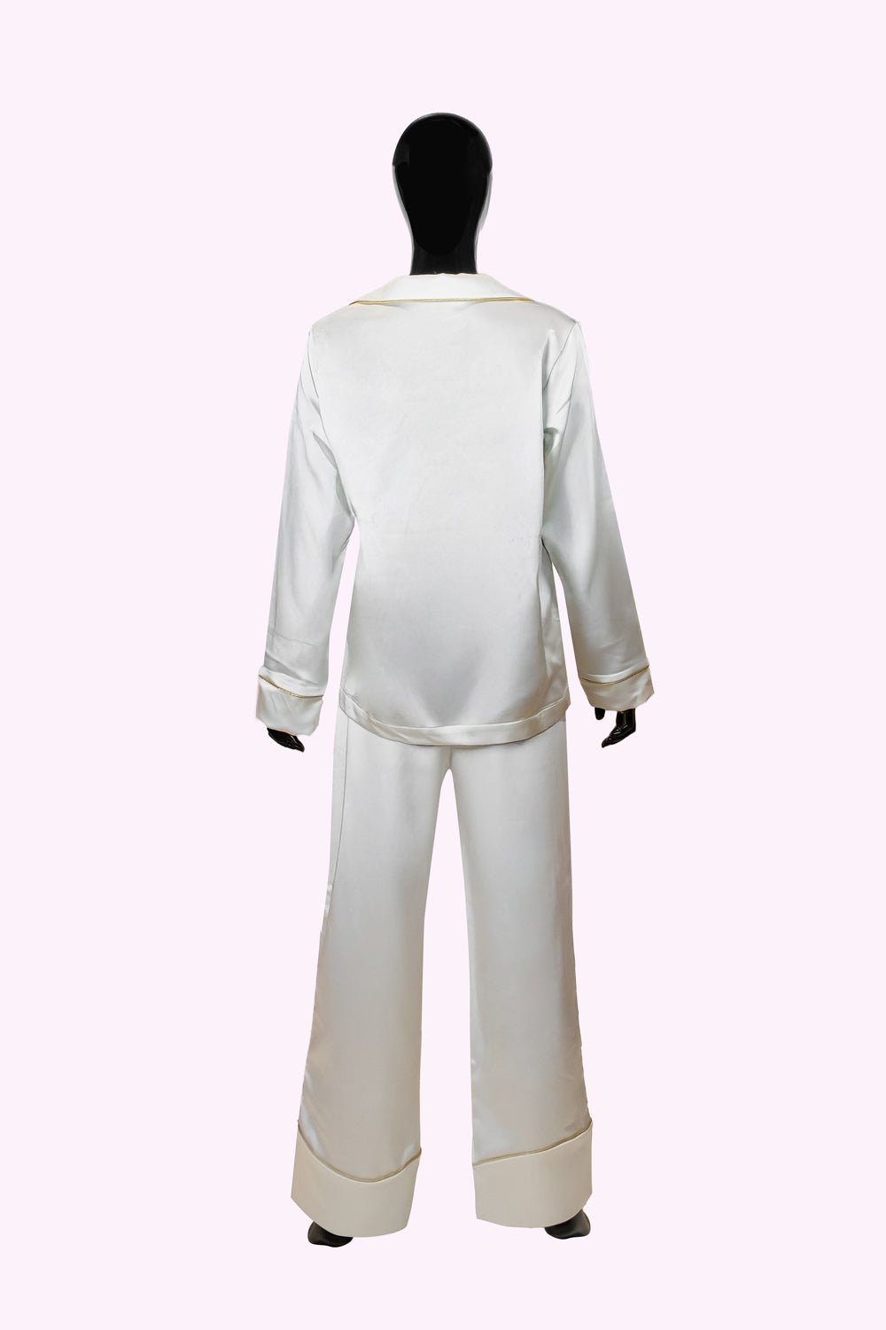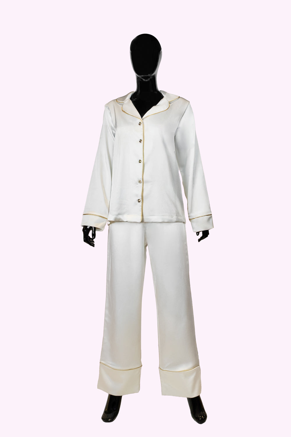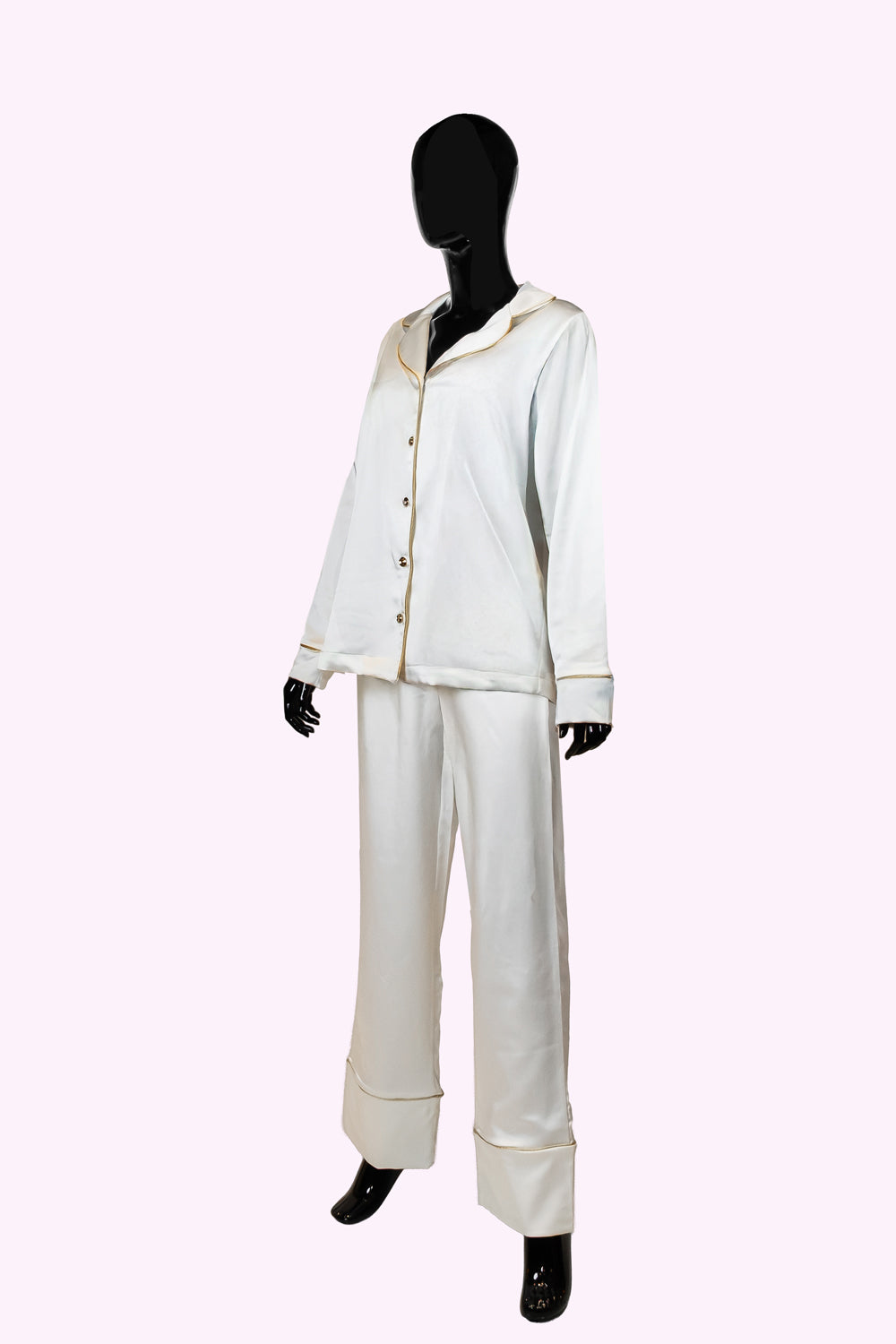 Selene Ivory, beyazın asaletini ve satenin zarafetini tek bir silüette buluşturuyor. Altın rengi ince biyeleri ve inci düğme detaylarıyla kusursuzca tamamlanan bu takım, gecenin dinginliğini ve sabahın tazeliğini taşıyor. Vücudu sarmayan rahat kesimi ve dökümlü yapısıyla her an şık ve konforlu hissettiriyor.