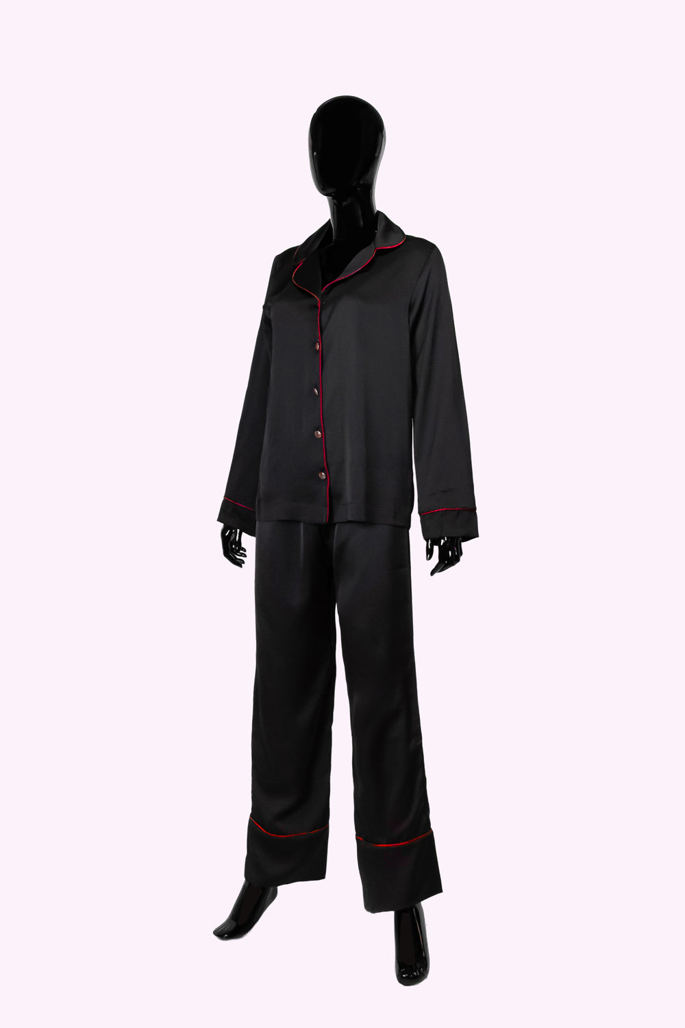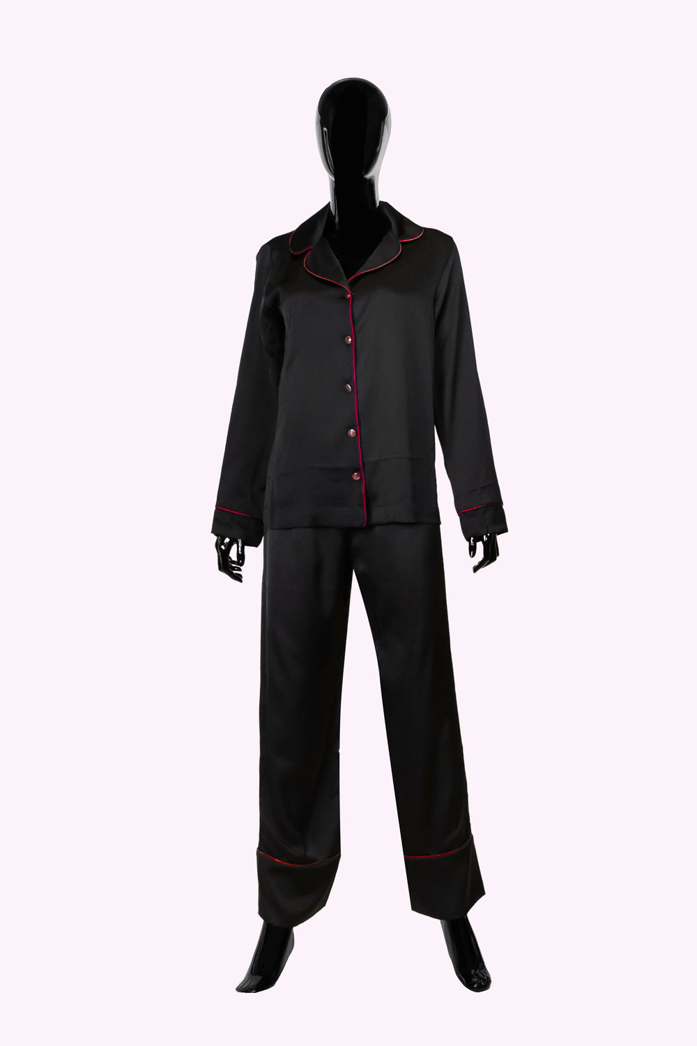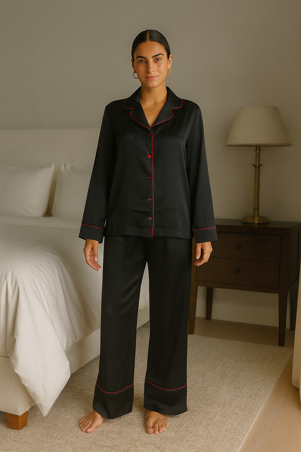 Şehrin gürültüsünden uzaklaştığınız o dingin saatlerde, bu pijama takımı sessiz bir lüks sunar. Siyahın zamansız asaletiyle uyum içinde, bordo biyelerin zarif dokunuşları geceye derinlik katar.