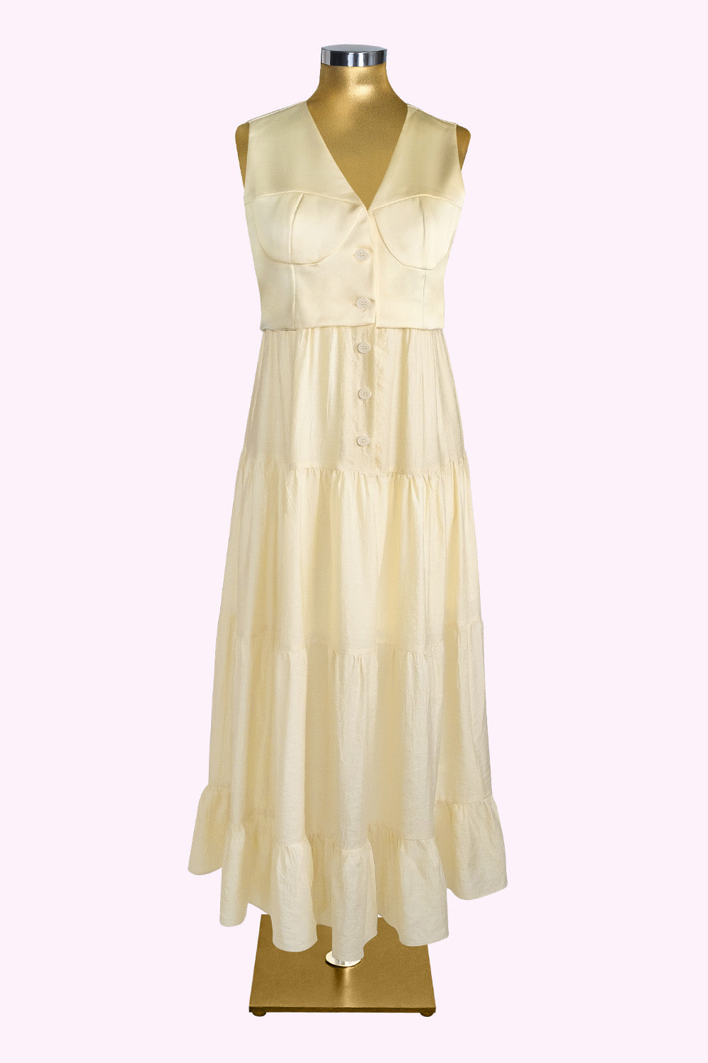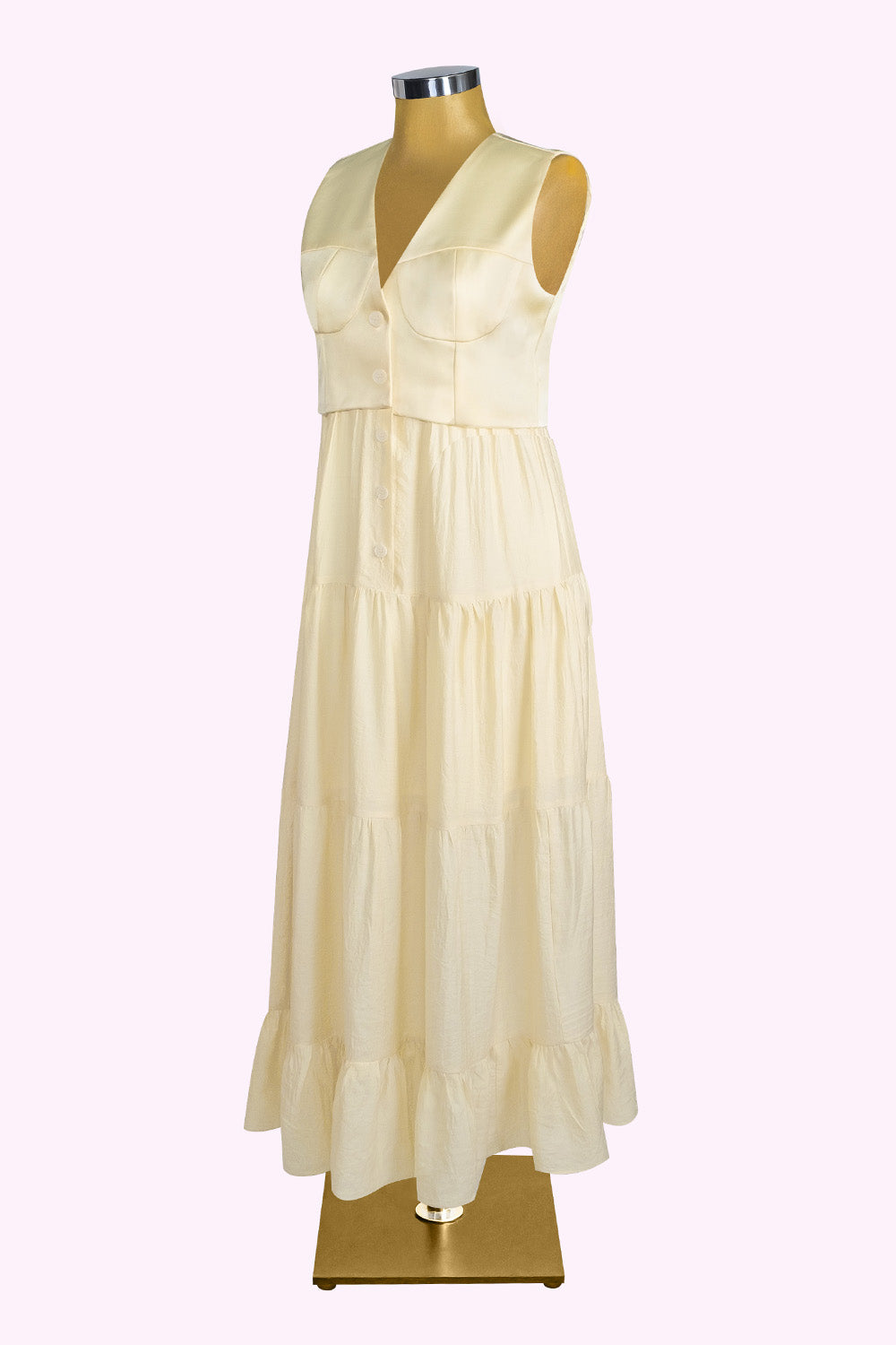 Yapılandırılmış göğüs detayı ile feminen formu vurgularken, kat kat dökümlü etek kısmı sayesinde hafiflik ve hareket özgürlüğü sunar.