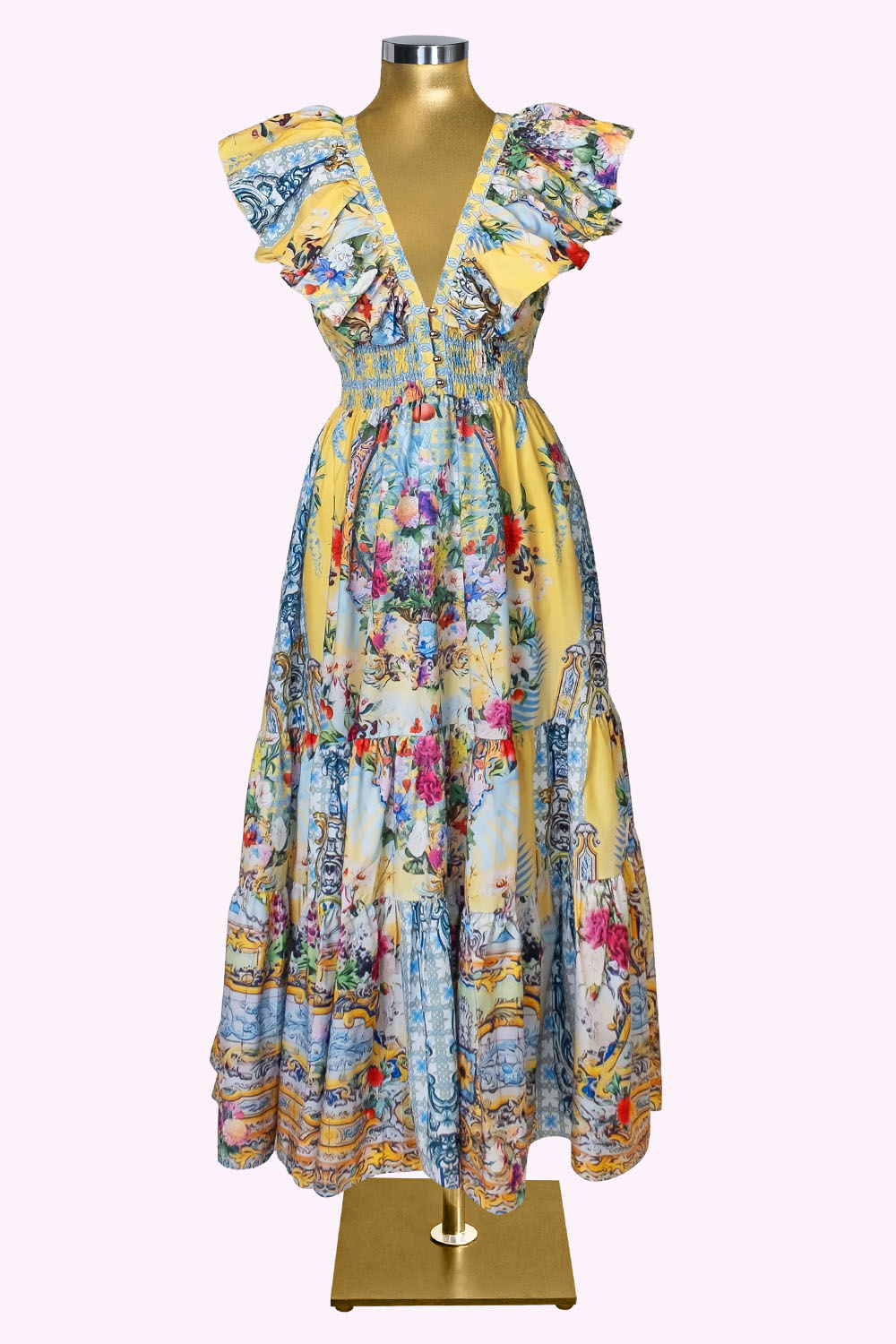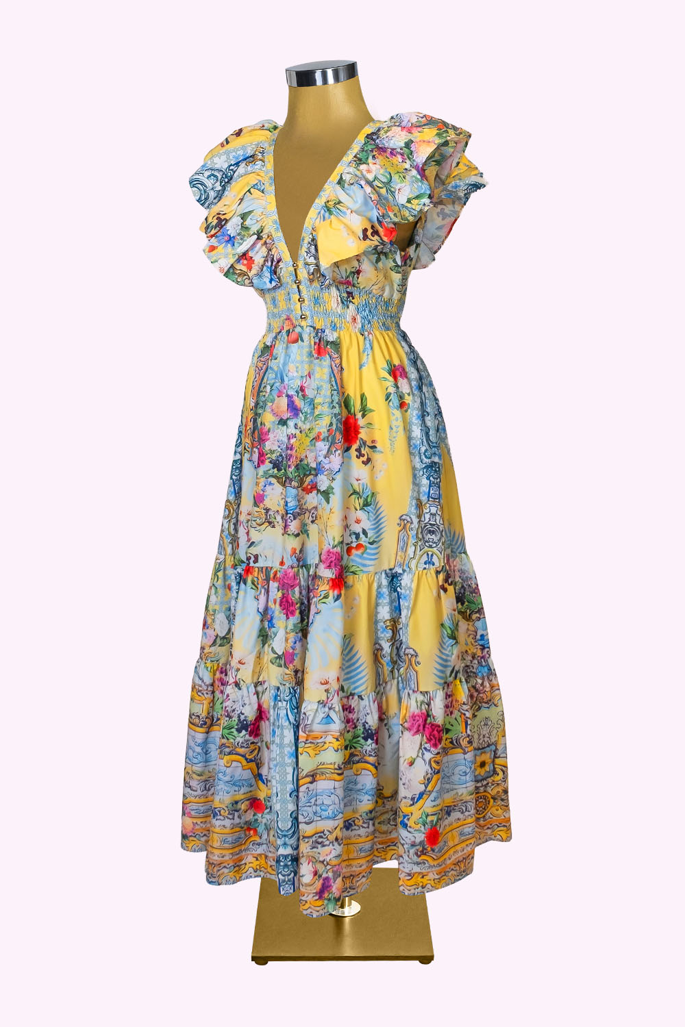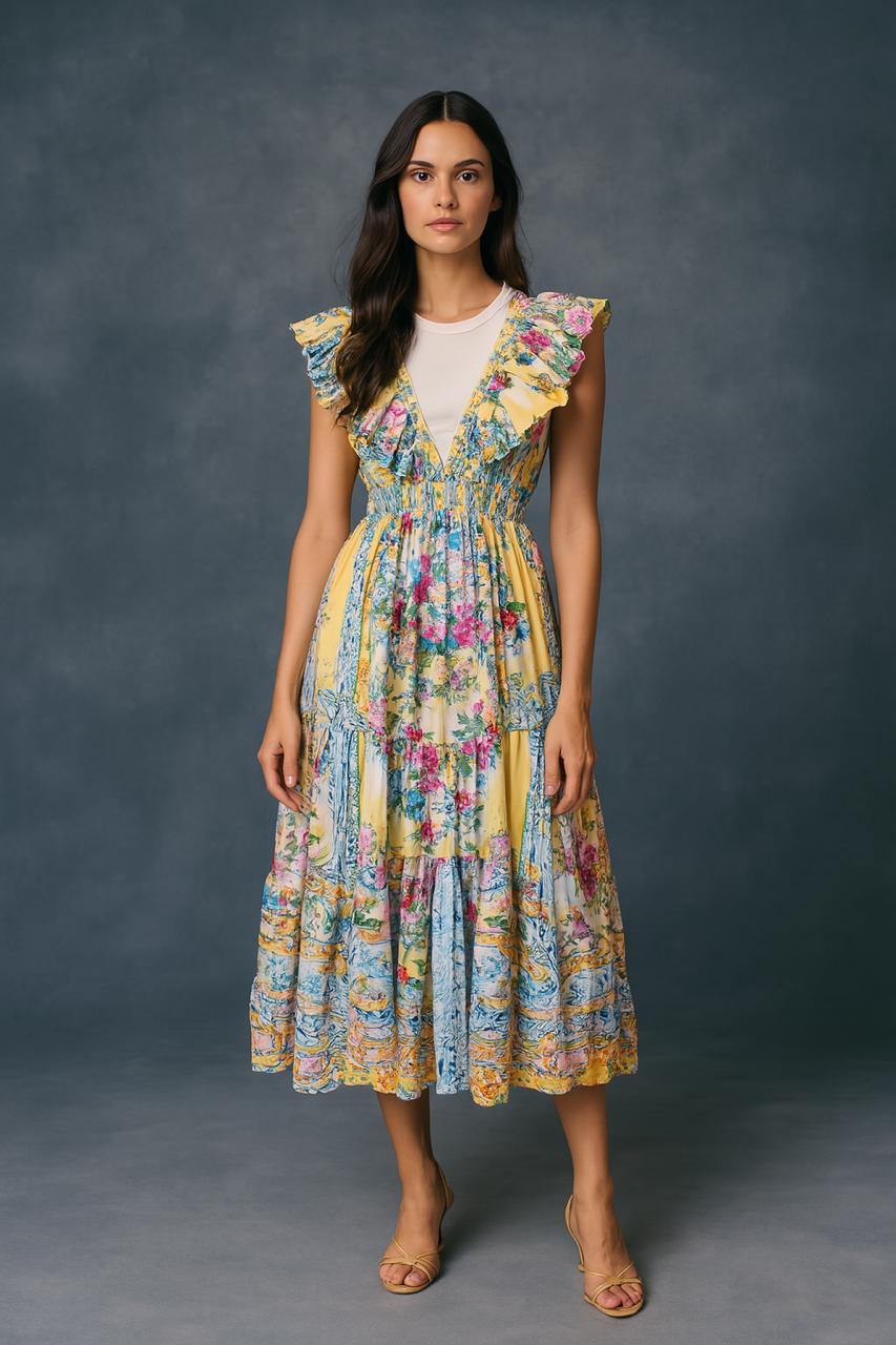 Geniş fırfırlı omuzları, derin V yakası ve esnek beliyle feminen bir siluet sunarken; alt eteğindeki bol katlar ve canlı desen geçişleri, Akdeniz sahillerinin enerjisini teninize taşır.