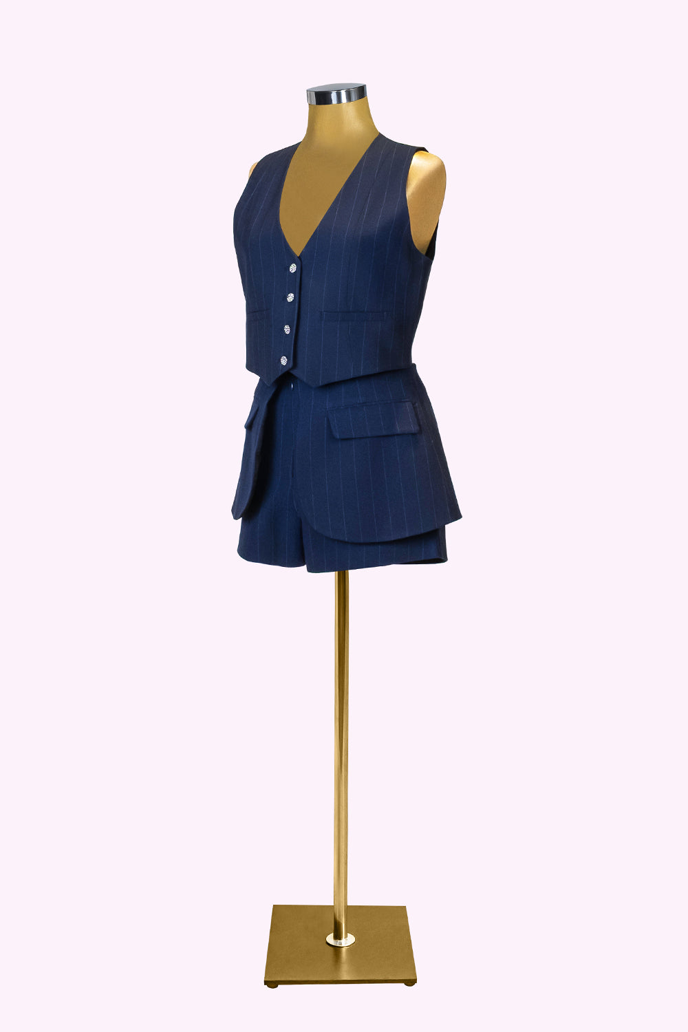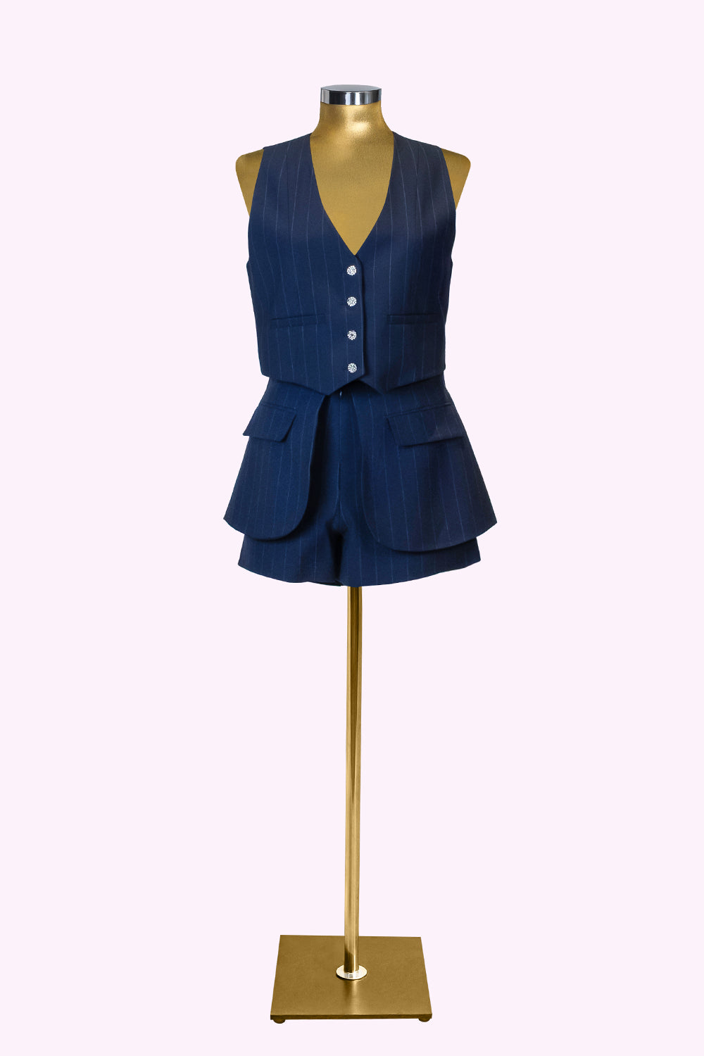 • Düğmeli yelek formu ve yüksek bel şort uyumu
