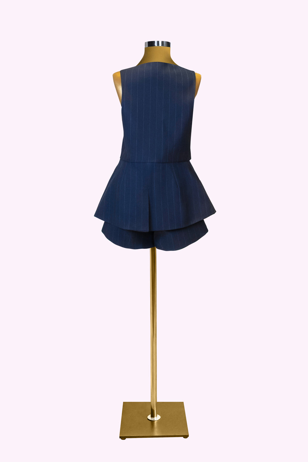 Yelek formundaki üst parça, düğmeleri ve derin V yaka kesimiyle güçlü bir siluet yaratırken, şort kısmındaki büyük cep detayları işlevsellik ve tavır kazandırır.