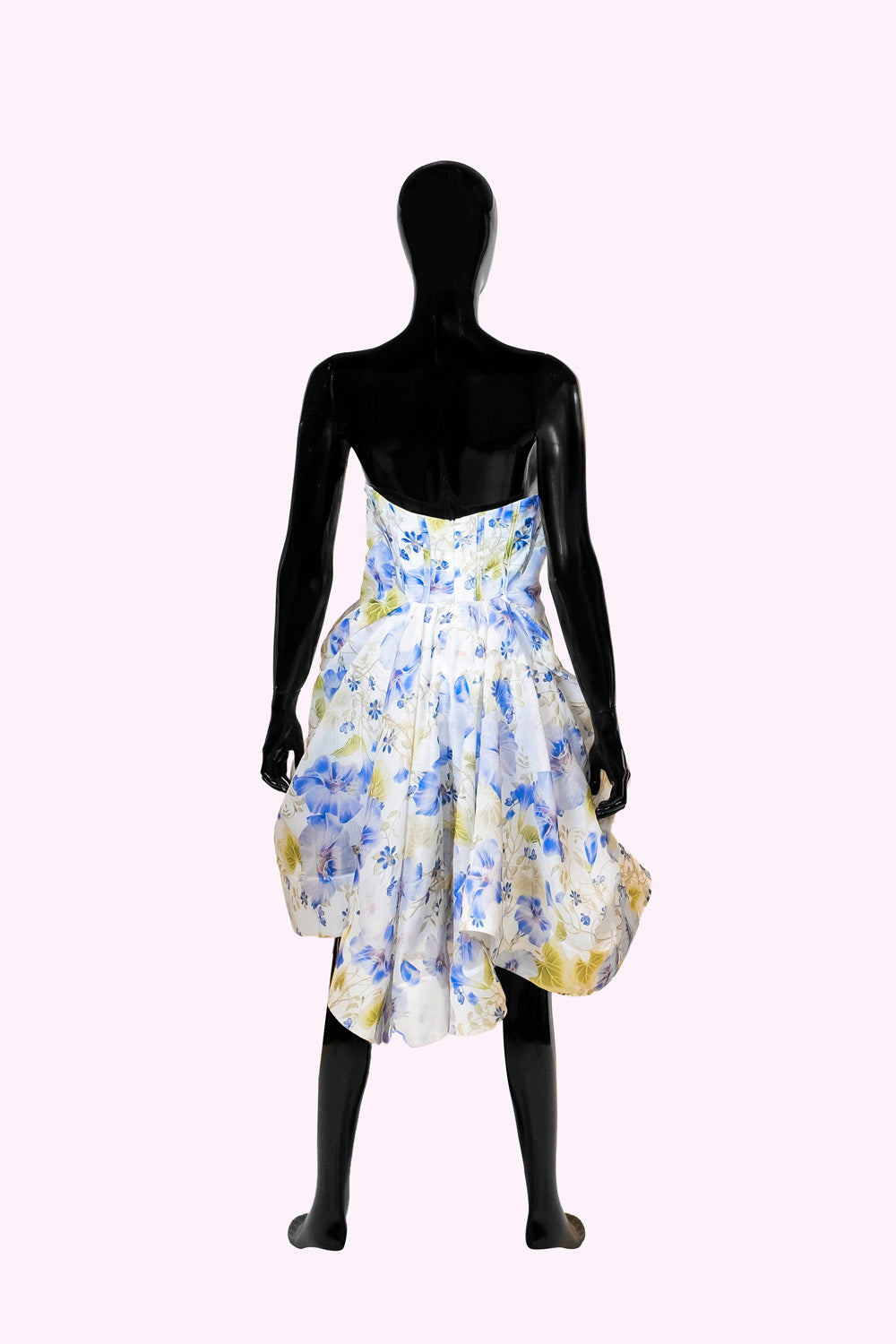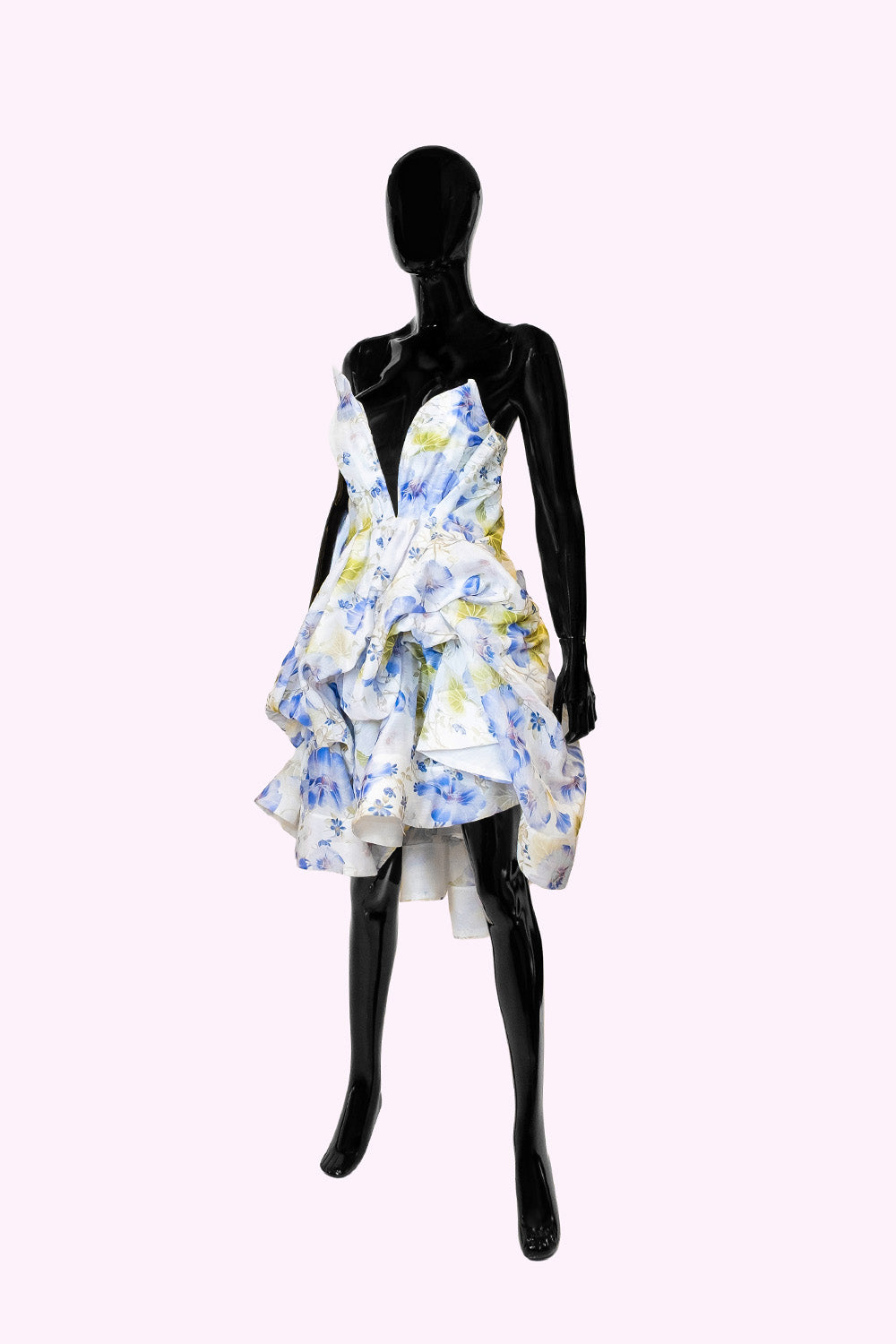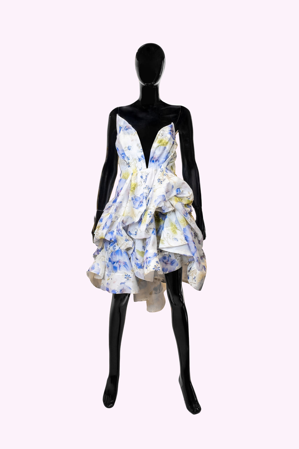 Baharın ilk sabahı gibi… Thaleia elbisesi, hayat dolu çiçek desenleri ve heykelsi katmanlarıyla adeta bir tabloyu andırıyor. Pastel mavi ve sarının yumuşak uyumu, romantik bir akşamı ya da yazın içindeki bir kutlamayı selamlıyor. Derin V yaka, feminen bir iddia sunarken; hacimli etek kısmı hareketli bir şiire dönüşüyor.