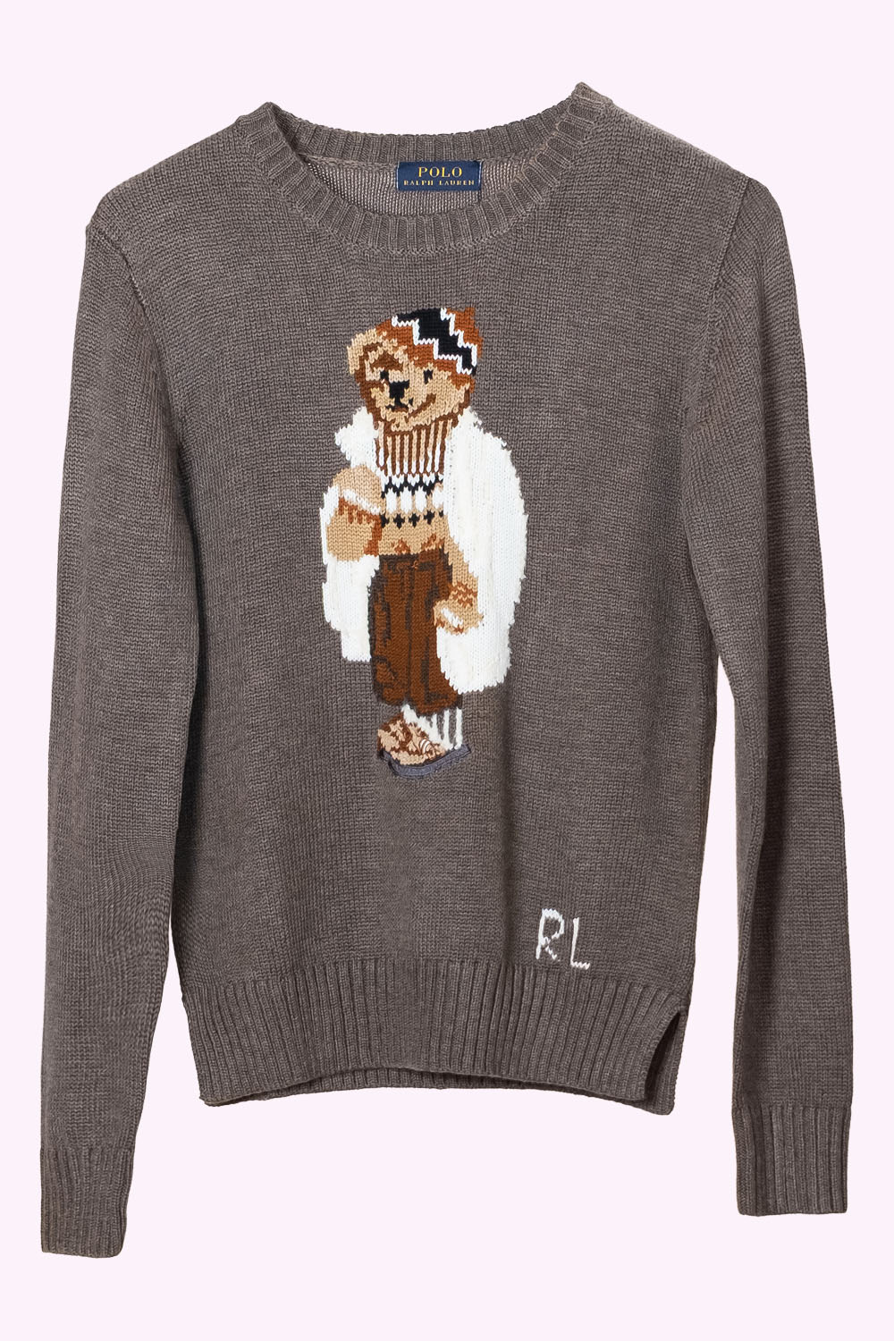 Geçmişin mizahını ve sıcaklığını modern şehir stiline taşıyan, karakter sahibi bir kış yorumu. Orta tonda toprak-kahverengi zeminde işlenmiş intarsia ayı motifi; desenli bere, dokulu atkı ve pelüş kaban detaylarıyla nostaljik bir “heritage” atmosferi kuruyor. Klasik bisiklet yaka, ince ribana manşet ve etek ucu—günlük şıklıkla konforu dengelerken—yan yırtmaçla hareket alanı kazandırıyor. Alt köşedeki küçük monogram ise ürüne koleksiyon imzası katıyor.