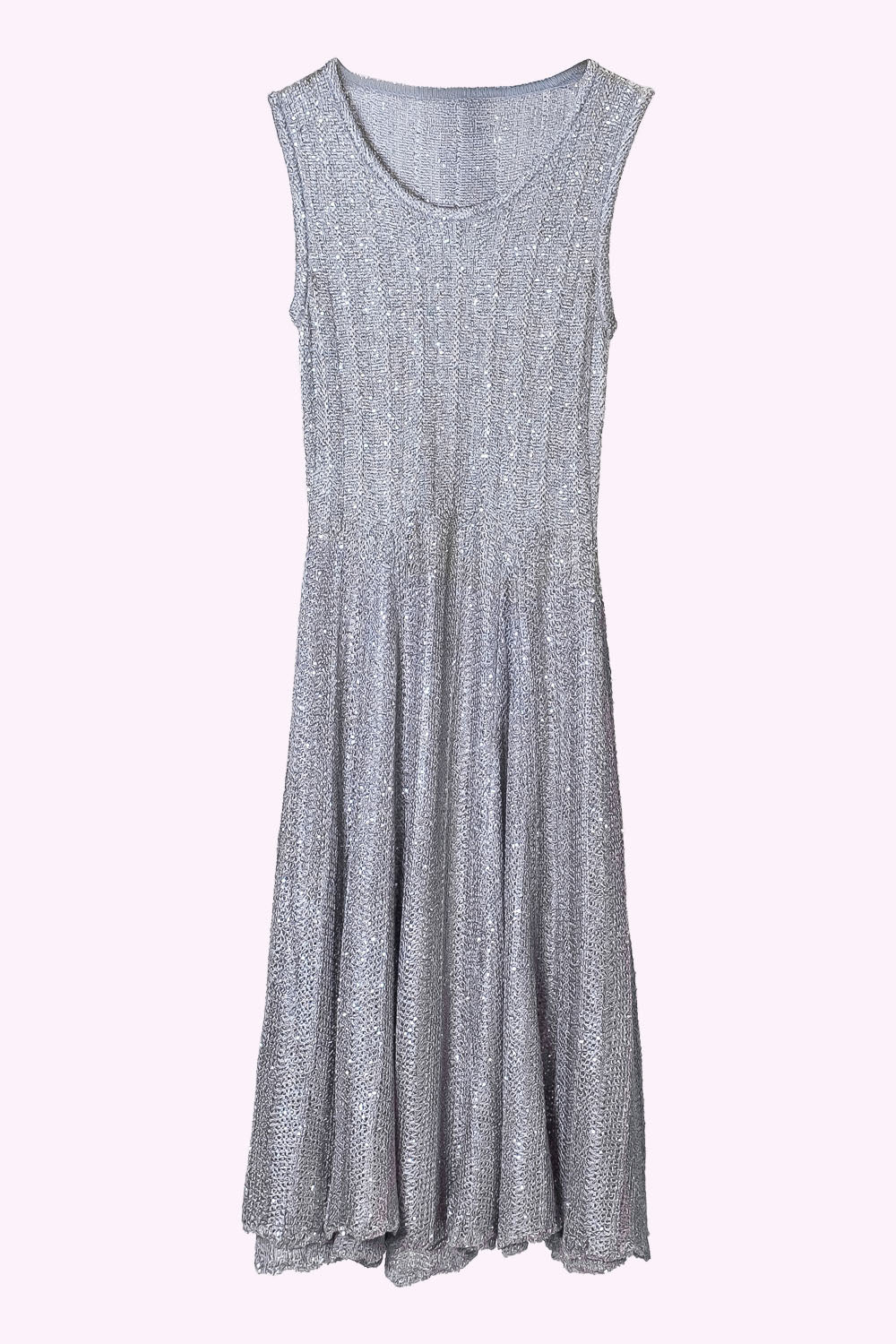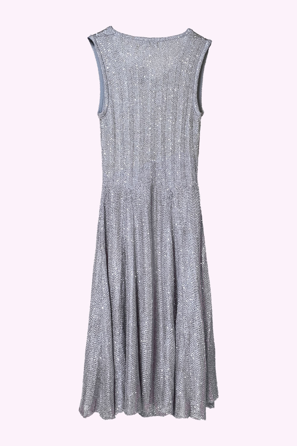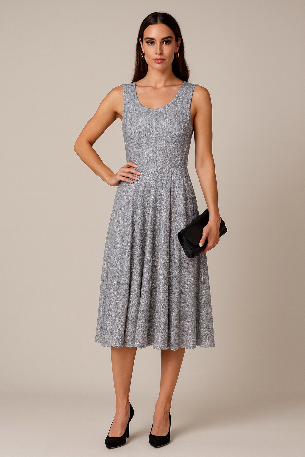 Geniş yuvarlak yakası ve kolsuz formuyla gövdeyi zarifçe saran elbise, bel hattında incelerek midi boy kloş eteğe akıyor. Kumaştaki ince metalik ışıltı, fotoğrafta olduğu gibi ışığı nazikçe yakalarken abartısız bir parıltı sunar. Kloş etek her hareketle canlılık kazanır; oturup kalkarken kırışıklık izini minimumda tutan esnek-dökümlü yapı gün boyu konfor sağlar. Gümüş spektrumunda rafine bir ton seçimi, siyah stilettolarla gecede, ince bir trikoyla gündüz buluşmalarında aynı ölçüde şık görünür. İnce bir kemerle bel vurgusunu artırabilir; minimal takılar ve küçük bir clutch ile görünümü tamamlayabilirsiniz.