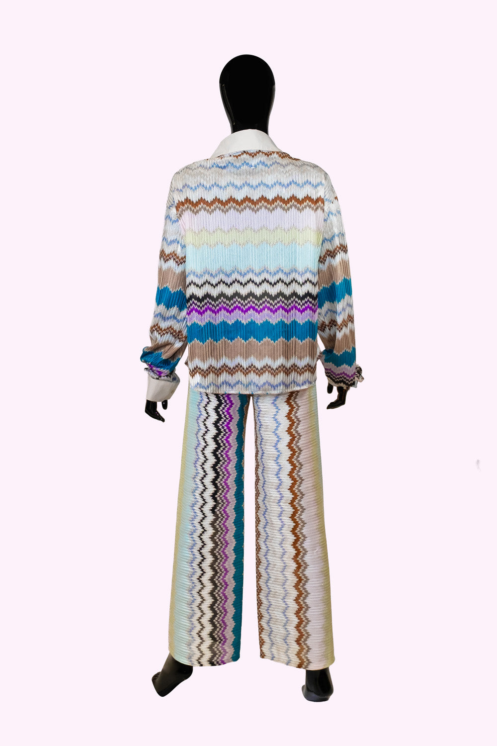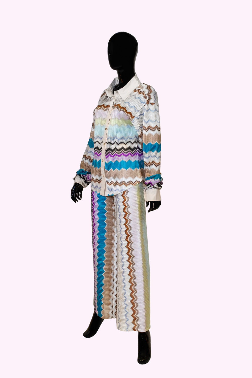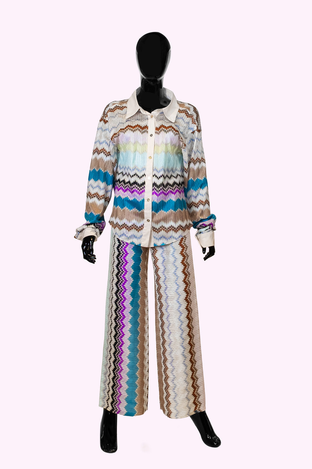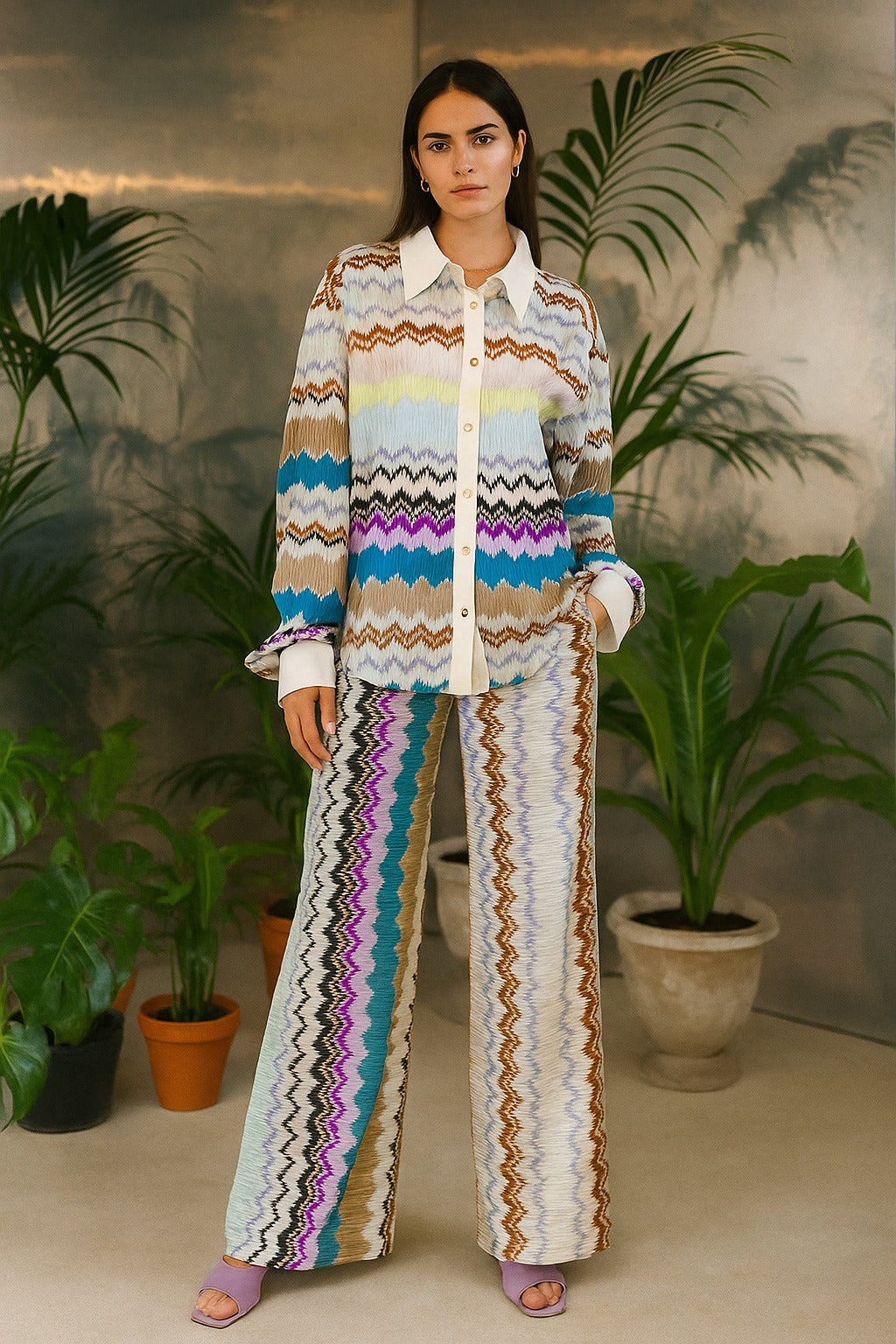 Zigwave Set, renklerin ve desenlerin ahengini vücut bulmuş haliyle karşınızda. Oversize gömleğiyle rahatlık sunarken, bol paça pantolonuyla özgür bir siluet yaratır. Mor, mavi, bej ve kahverengi tonlarının harmonisi; her mevsime uyum sağlar. Günlük stilinizde sneaker’la spor, topuklu ayakkabıyla şık bir dönüşüm sağlar. Hem takım olarak hem de ayrı ayrı kombinlenebilir olması, bu seti gardırobun yıldızı yapıyor.